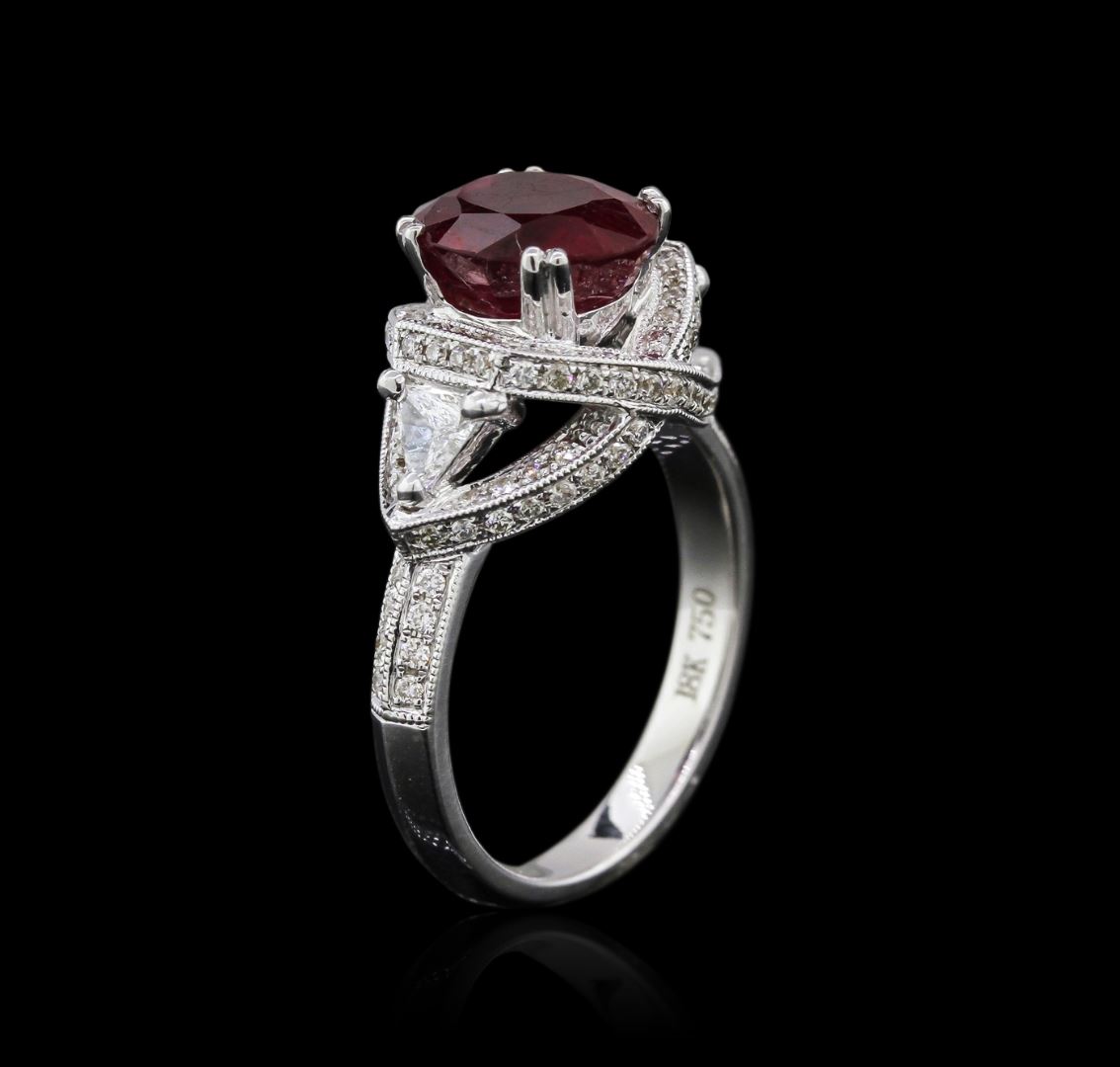 One electronically tested 18KT white gold ladies cast ruby and diamond ring with a bright polish finish. Identified with markings of "18K". Condition is new. Containing: One prong set oval modified brilliant cut natural ruby, measuring 9.70 x 7.50 x 4.88mm, approximate weight of 3.02ct., clarity is heavily included, medium dark, very slightly brownish, strongly purplish red color, (GIA stpR 6/3), cut is good. Ninety-Two prong set round brilliant cut diamonds, measuring 1.20 - 1.20 x 0.72mm (depth est.) approximate total weight of 92 Stones = 0.58ct. Clarity: I-1 to I-2. Color: H - I, Cut is Good. Two prong set triangle cut diamonds, measuring 3.20 x 3.20 x 1.98mm (depth est.) approximate total weight of 2 Stones = 0.23ct. Clarity: SI-1. Color: H - I, Cut is Good. Colored gemstones are presumed to have been subjected to commonly used enhancement processes. All diamonds and colored gemstones are graded in the mounting, unless otherwise stated. Total Weight of Colored Stones 3.02ct. Total Weight of Diamonds 0.81ct. Total Weight of Ring 7.10 grams. GGL Appraised at $5,030.00.