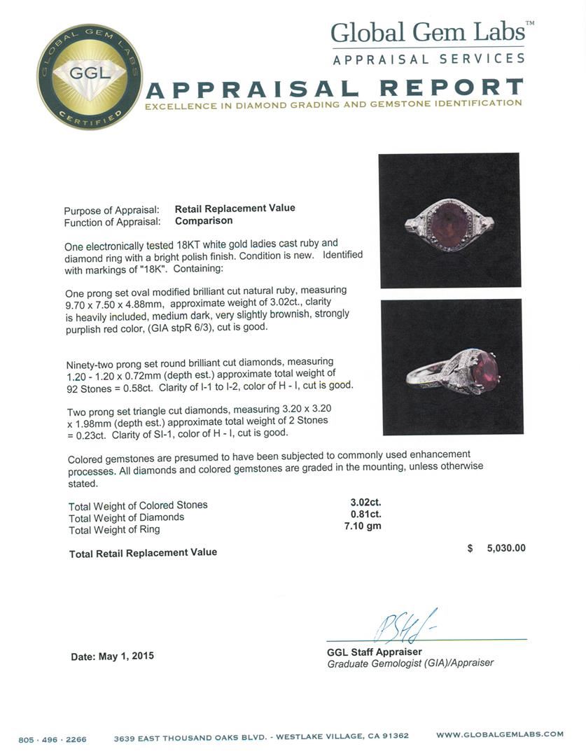 One electronically tested 18KT white gold ladies cast ruby and diamond ring with a bright polish finish. Identified with markings of "18K". Condition is new. Containing: One prong set oval modified brilliant cut natural ruby, measuring 9.70 x 7.50 x 4.88mm, approximate weight of 3.02ct., clarity is heavily included, medium dark, very slightly brownish, strongly purplish red color, (GIA stpR 6/3), cut is good. Ninety-Two prong set round brilliant cut diamonds, measuring 1.20 - 1.20 x 0.72mm (depth est.) approximate total weight of 92 Stones = 0.58ct. Clarity: I-1 to I-2. Color: H - I, Cut is Good. Two prong set triangle cut diamonds, measuring 3.20 x 3.20 x 1.98mm (depth est.) approximate total weight of 2 Stones = 0.23ct. Clarity: SI-1. Color: H - I, Cut is Good. Colored gemstones are presumed to have been subjected to commonly used enhancement processes. All diamonds and colored gemstones are graded in the mounting, unless otherwise stated. Total Weight of Colored Stones 3.02ct. Total Weight of Diamonds 0.81ct. Total Weight of Ring 7.10 grams. GGL Appraised at $5,030.00.