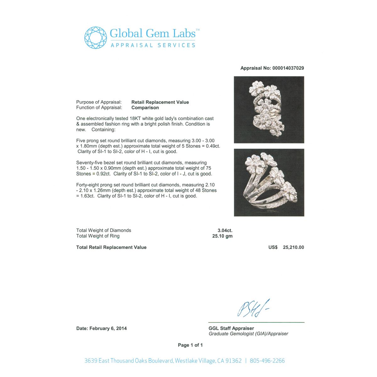 One electronically tested 18KT white gold Ladies combination cast & assembled fashion ring with a bright polish finish. Condition is new. Containing: Five prong set round brilliant cut diamonds, measuring 3.00 - 3.00 x 1.80mm (depth est.) approximate total weight of 5 Stones = 0.49ct. Clarity of SI-1 to SI-2, Color of H - I, Cut is Good. Seventy-Five bezel set round brilliant cut diamonds, measuring 1.50 - 1.50 x 0.90mm (depth est.) approximate total weight of 75 Stones = 0.92ct. Clarity of SI-1 to SI-2, Color of I - J, Cut is Good. Forty-Eight prong set round brilliant cut diamonds, measuring 2.10 - 2.10 x 1.26mm (depth est.) approximate total weight of 48 Stones = 1.63ct. Clarity of SI-1 to SI-2, Color of H - I, Cut is Good. Total Weight of Diamonds 3.04ct. Total Weight of Ring 25.10gm. GGL Appraised at $25,210.00.