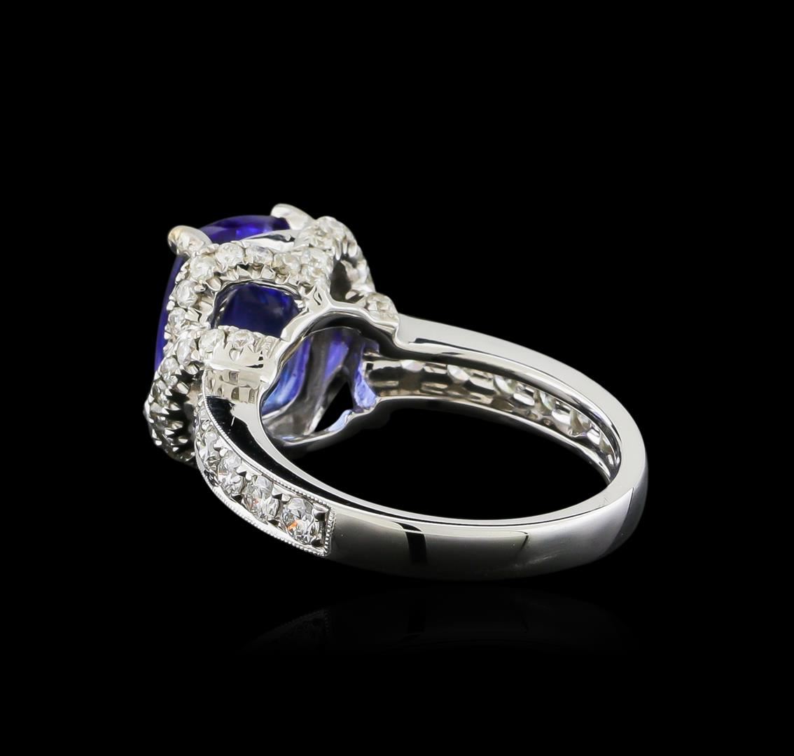 One electronically tested 18KT white gold ladies combination cast & assembled engagement ring with a bright polish finish. Identified with markings of "18K". Condition is new. Containing: One prong set rectangular cushion modified brilliant cut natural tanzanite, measuring 10.47 x 7.56 x 4.92mm, approximate weight of 3.06ct., clarity is eye clean, type I, medium, moderately strong, bluish violet color, (GIA bV 5/4), cut is good. Twelve prong set round brilliant cut diamonds, measuring 2.20 - 2.20 x 1.32mm (depth est.) approximate total weight of 12 Stones = 0.57ct. Clarity: SI-1 to I-1. Color: I - J, Cut is Good. Forty prong set round brilliant cut diamonds, measuring 1.30 - 1.30 x 0.78mm (depth est.) approximate total weight of 40 Stones = 0.42ct. Clarity: SI-2 to I-1. Color: H - I, Cut is Good. Colored gemstones are presumed to have been subjected to commonly used enhancement processes. All diamonds and colored gemstones are graded in the mounting, unless otherwise stated. Total Weight of Colored Stones 3.06ct. Total Weight of Diamonds 0.99ct. Total Weight of Ring 7.50 grams. GGL Appraised at $10,080.00.
