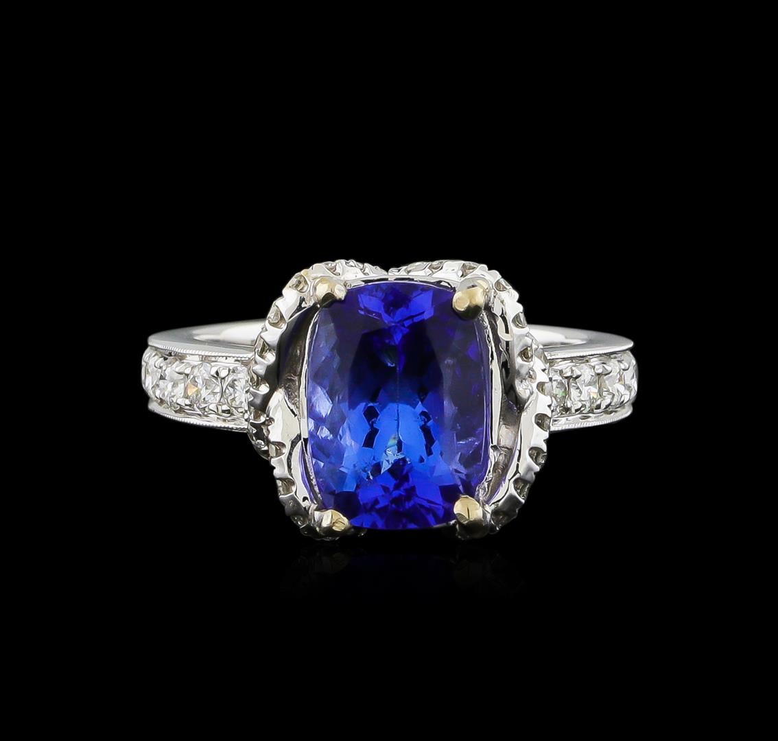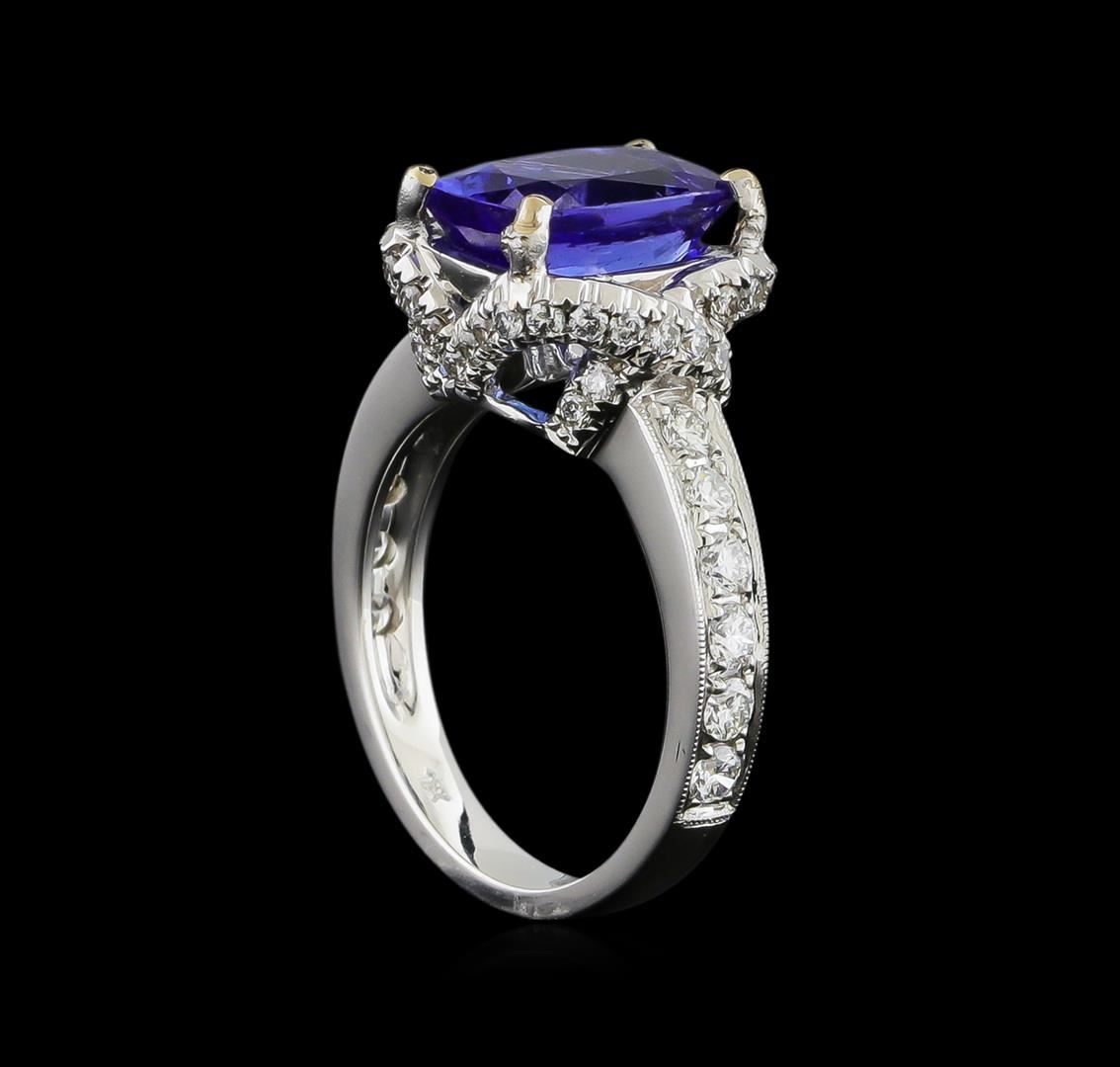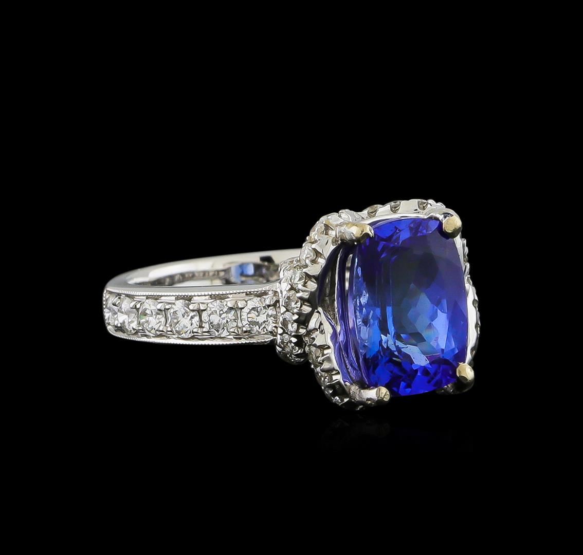 One electronically tested 18KT white gold ladies combination cast & assembled engagement ring with a bright polish finish. Identified with markings of "18K". Condition is new. Containing: One prong set rectangular cushion modified brilliant cut natural tanzanite, measuring 10.47 x 7.56 x 4.92mm, approximate weight of 3.06ct., clarity is eye clean, type I, medium, moderately strong, bluish violet color, (GIA bV 5/4), cut is good. Twelve prong set round brilliant cut diamonds, measuring 2.20 - 2.20 x 1.32mm (depth est.) approximate total weight of 12 Stones = 0.57ct. Clarity: SI-1 to I-1. Color: I - J, Cut is Good. Forty prong set round brilliant cut diamonds, measuring 1.30 - 1.30 x 0.78mm (depth est.) approximate total weight of 40 Stones = 0.42ct. Clarity: SI-2 to I-1. Color: H - I, Cut is Good. Colored gemstones are presumed to have been subjected to commonly used enhancement processes. All diamonds and colored gemstones are graded in the mounting, unless otherwise stated. Total Weight of Colored Stones 3.06ct. Total Weight of Diamonds 0.99ct. Total Weight of Ring 7.50 grams. GGL Appraised at $10,080.00.