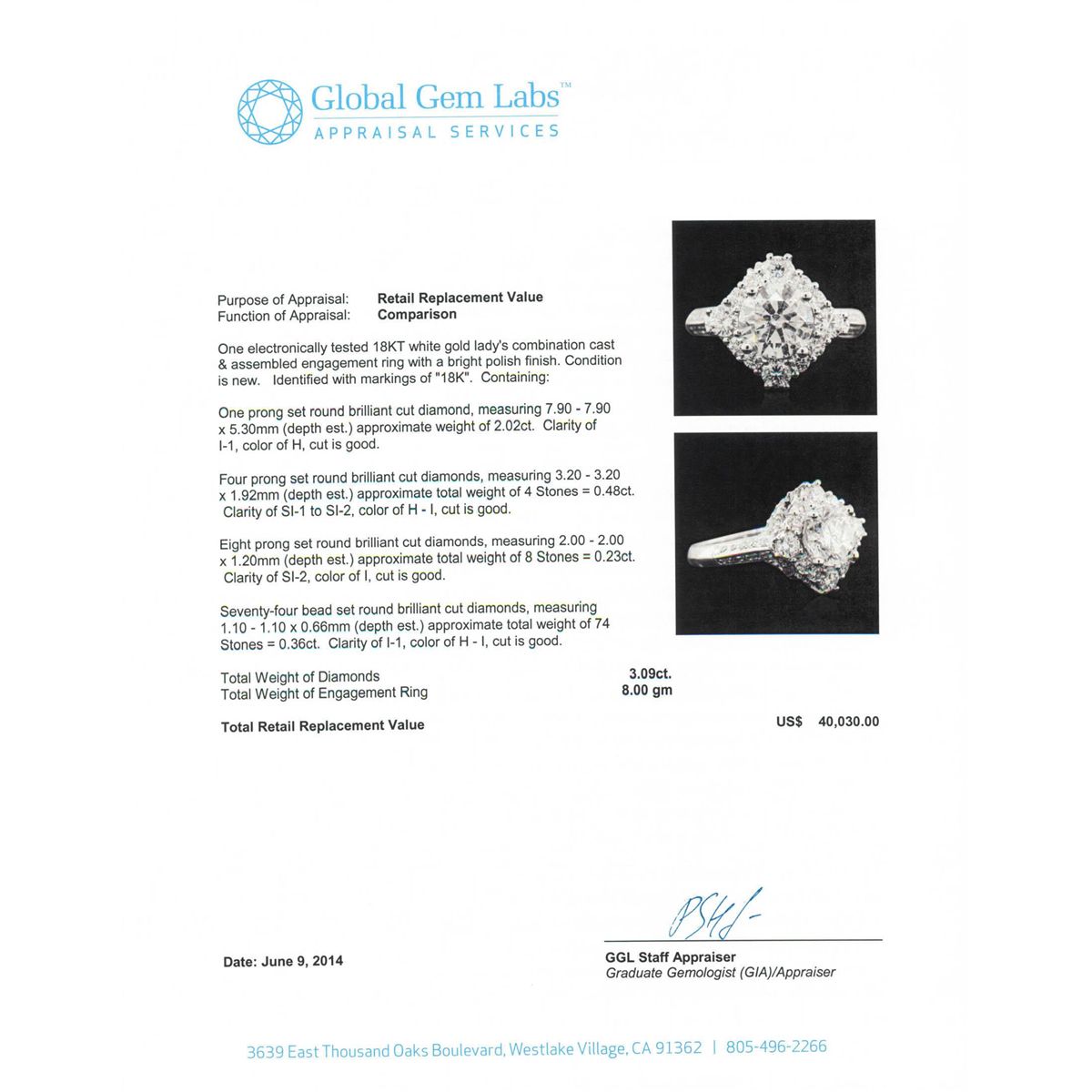 One electronically tested 18KT white gold Ladies combination cast & assembled engagement ring with a bright polish finish. Condition is new. Identified with markings of "18K". Containing: One prong set round brilliant cut diamond, measuring 7.90 - 7.90 x 5.30mm (depth est.) approximate weight of 2.02ct. Clarity: I-1. Color: H, Cut is Good. Four prong set round brilliant cut diamonds, measuring 3.20 - 3.20 x 1.92mm (depth est.) approximate. Total Weight of 4 Stones = 0.48ct. Clarity: SI-1 to SI-2. Color: H - I, Cut is Good. Eight prong set round brilliant cut diamonds, measuring 2.00 - 2.00 x 1.20mm (depth est.) approximate. Total Weight of 8 Stones = 0.23ct. Clarity: SI-2. Color: I, Cut is Good. Seventy-Four bead set round brilliant cut diamonds, measuring 1.10 - 1.10 x 0.66mm (depth est.) approximate. Total Weight of 74 Stones = 0.36ct. Clarity: I-1. Color: H - I, Cut is Good. Total Weight of Diamonds 3.09ct. Total Weight of Engagement Ring 8.00 grams. GGL Appraised at $40,030.00.