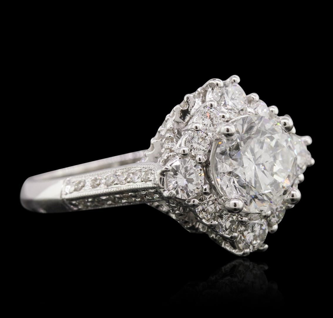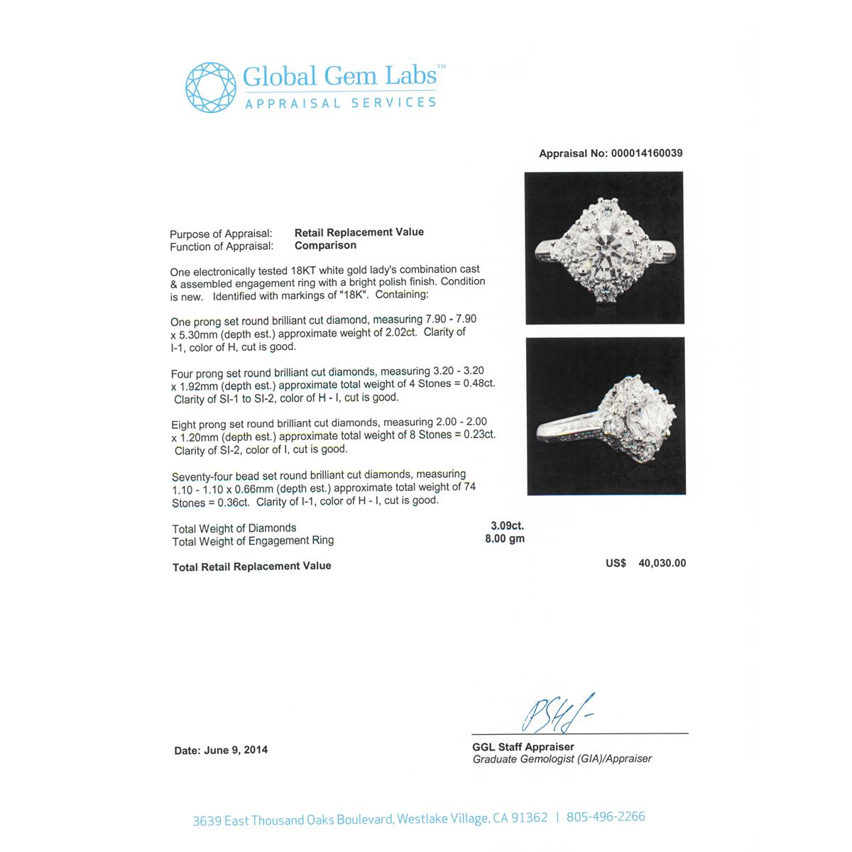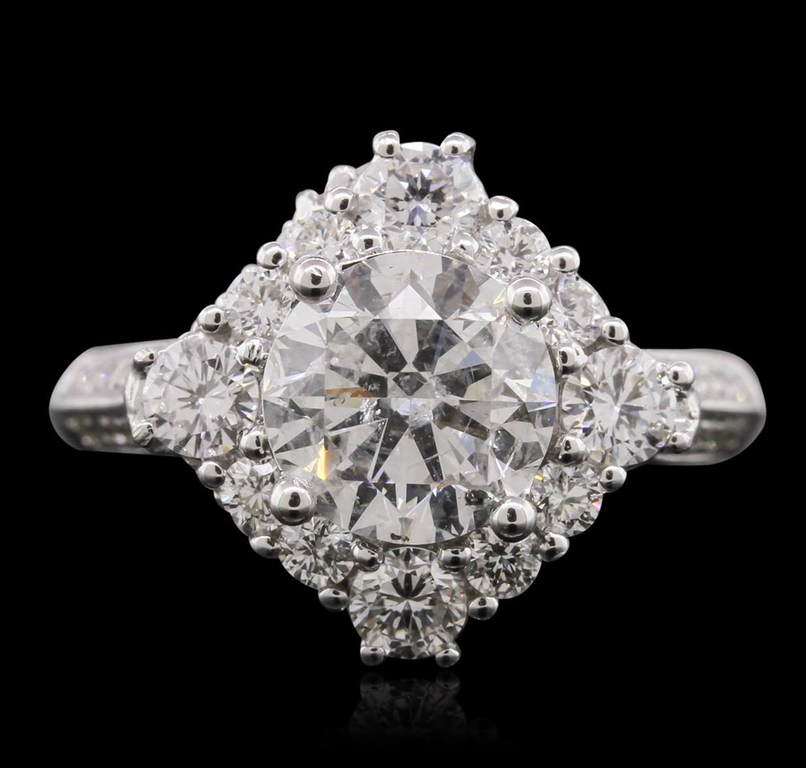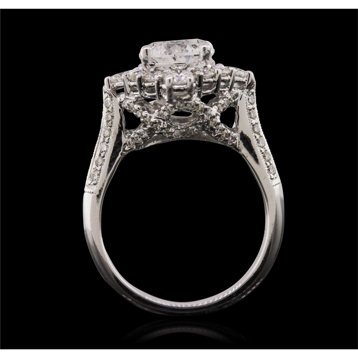 One electronically tested 18KT white gold Ladies combination cast & assembled engagement ring with a bright polish finish. Condition is new. Identified with markings of "18K". Containing: One prong set round brilliant cut diamond, measuring 7.90 - 7.90 x 5.30mm (depth est.) approximate weight of 2.02ct. Clarity: I-1. Color: H, Cut is Good. Four prong set round brilliant cut diamonds, measuring 3.20 - 3.20 x 1.92mm (depth est.) approximate. Total Weight of 4 Stones = 0.48ct. Clarity: SI-1 to SI-2. Color: H - I, Cut is Good. Eight prong set round brilliant cut diamonds, measuring 2.00 - 2.00 x 1.20mm (depth est.) approximate. Total Weight of 8 Stones = 0.23ct. Clarity: SI-2. Color: I, Cut is Good. Seventy-Four bead set round brilliant cut diamonds, measuring 1.10 - 1.10 x 0.66mm (depth est.) approximate. Total Weight of 74 Stones = 0.36ct. Clarity: I-1. Color: H - I, Cut is Good. Total Weight of Diamonds 3.09ct. Total Weight of Engagement Ring 8.00 grams. GGL Appraised at $40,030.00.
