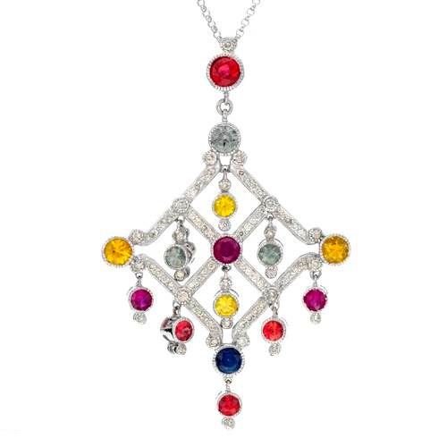 One 18KT White Gold 3.17ctw Multi Color Sapphire and Diamond Pendant with Chain. (15) Multi Color Sapphires with a total weight of 3.17cts. (74) Diamonds with a total weight of 0.60cts with a color of I and clarity of SI-2. Total weight of this pendant with chain is 13.82 grams.