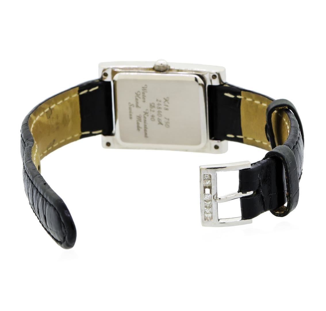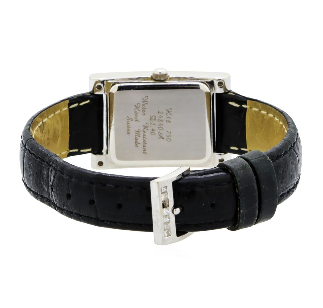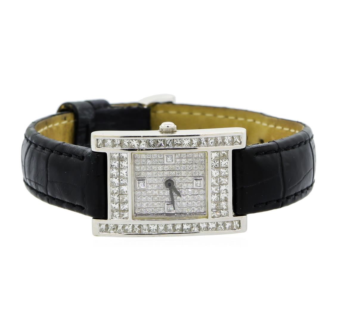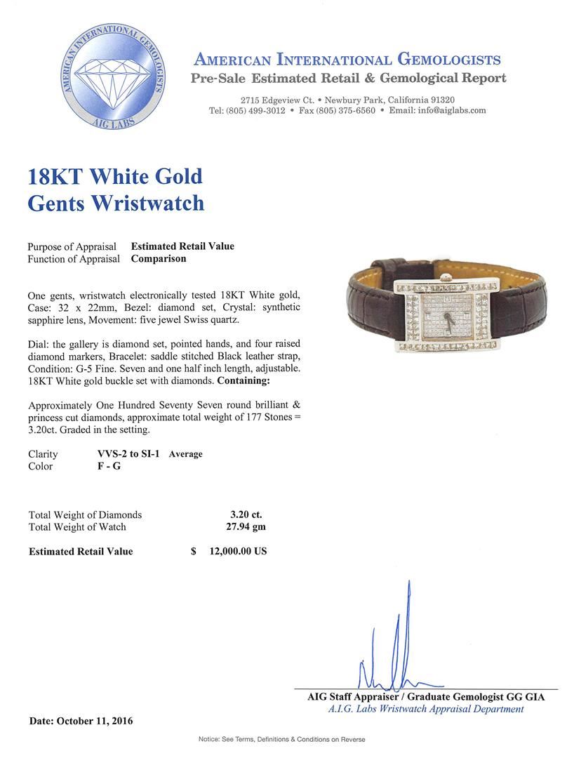 One gents, wristwatch electronically tested 18KT White gold, Case: 32 x 22mm, Bezel: diamond set, Crystal: synthetic sapphire lens, Movement: five jewel Swiss quartz. Dial: the gallery is diamond set, pointed hands, and four raised diamond markers, Bracelet: saddle stitched Black leather strap, Condition: G-5 Fine. Seven and one half inch length, adjustable. 18KT White gold buckle set with diamonds. Containing: Approximately One Hundred Seventy Seven round brilliant & princess cut diamonds, approximate total weight of 177 Stones = 3.20ct. Graded in the setting. Clarity: VVS-2 to SI-1 Average Color F - G. Total Weight of Diamonds 3.20ct. Total Weight of Watch 27.94gm. AIG Appraised at $12,000.00.