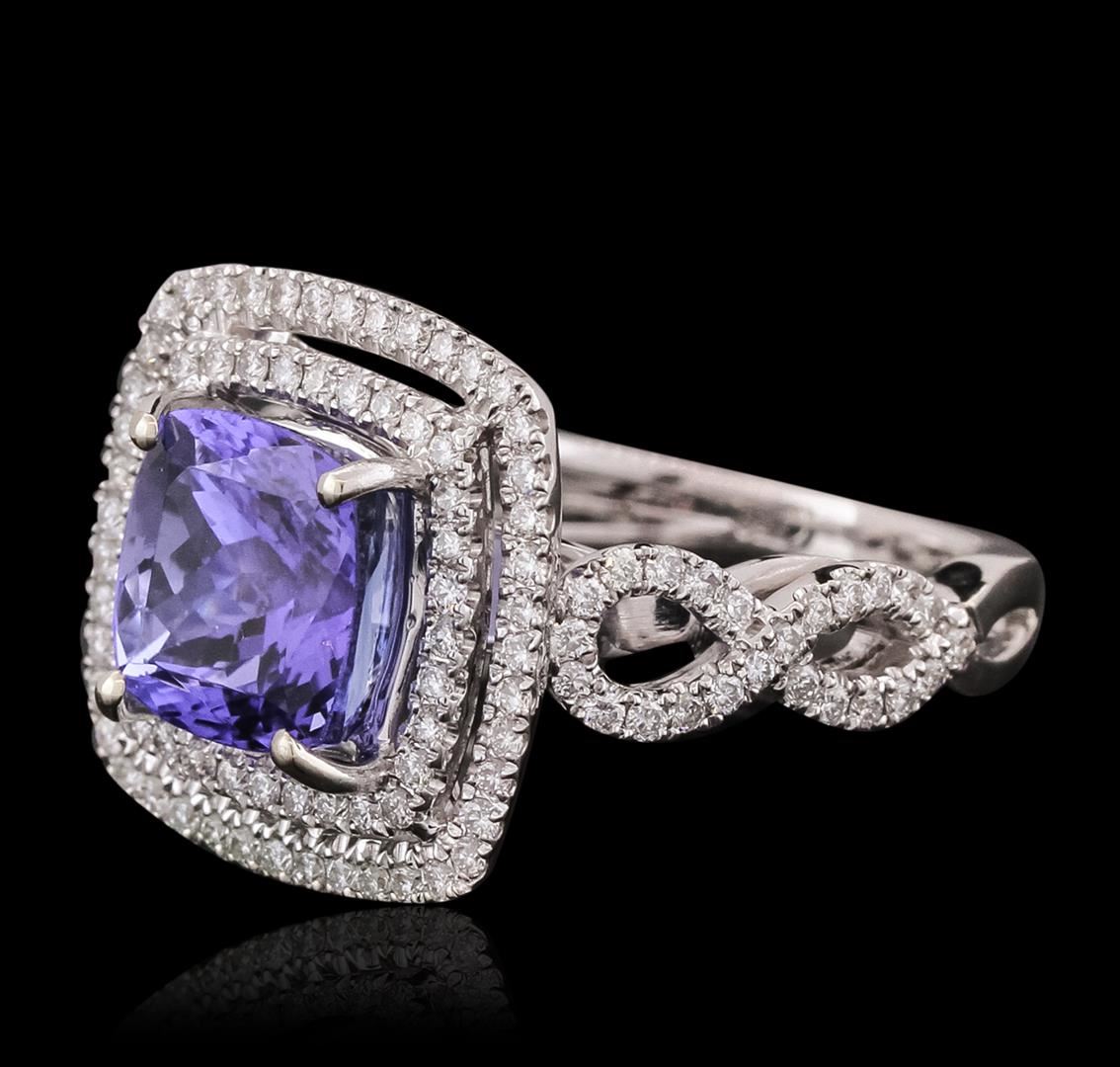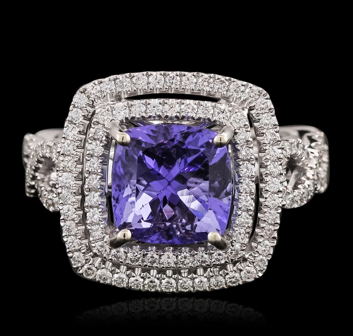 One electronically tested 18KT white gold ladies combination cast & assembled ring with a bright polish finish. Identified with markings of "750". Condition is new. Containing: One prong set square cushion modified brilliant cut natural tanzanite, measuring 8.71 x 8.62 x 5.64mm, approximate weight of 3.33ct., clarity is eye clean, type I, medium light, moderately strong, violet color, (GIA V 4/4), cut is good. One Hundred Twenty-Six prong set round brilliant cut diamonds, measuring 1.10 - 1.10 x 0.66mm (depth est.) approximate total weight of 126 Stones = 0.61ct. Clarity: SI-1 to I-1. Color: H - I, Cut is Good. Colored gemstones are presumed to have been subjected to commonly used enhancement processes. All diamonds and colored gemstones are graded in the mounting, unless otherwise stated. Total Weight of Colored Stones 3.33ct. Total Weight of Diamonds 0.61ct. Total Weight of Ring 8.70 grams. GGL Appraised at $11,025.00.
