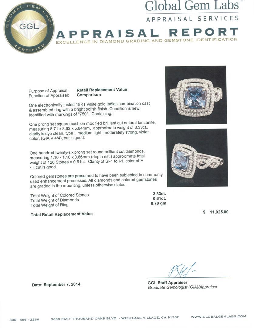 One electronically tested 18KT white gold ladies combination cast & assembled ring with a bright polish finish. Identified with markings of "750". Condition is new. Containing: One prong set square cushion modified brilliant cut natural tanzanite, measuring 8.71 x 8.62 x 5.64mm, approximate weight of 3.33ct., clarity is eye clean, type I, medium light, moderately strong, violet color, (GIA V 4/4), cut is good. One Hundred Twenty-Six prong set round brilliant cut diamonds, measuring 1.10 - 1.10 x 0.66mm (depth est.) approximate total weight of 126 Stones = 0.61ct. Clarity: SI-1 to I-1. Color: H - I, Cut is Good. Colored gemstones are presumed to have been subjected to commonly used enhancement processes. All diamonds and colored gemstones are graded in the mounting, unless otherwise stated. Total Weight of Colored Stones 3.33ct. Total Weight of Diamonds 0.61ct. Total Weight of Ring 8.70 grams. GGL Appraised.