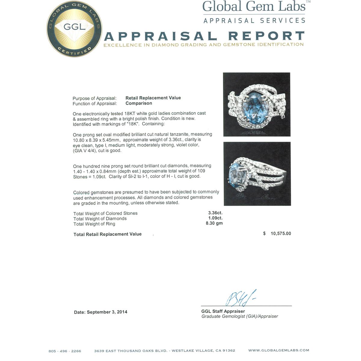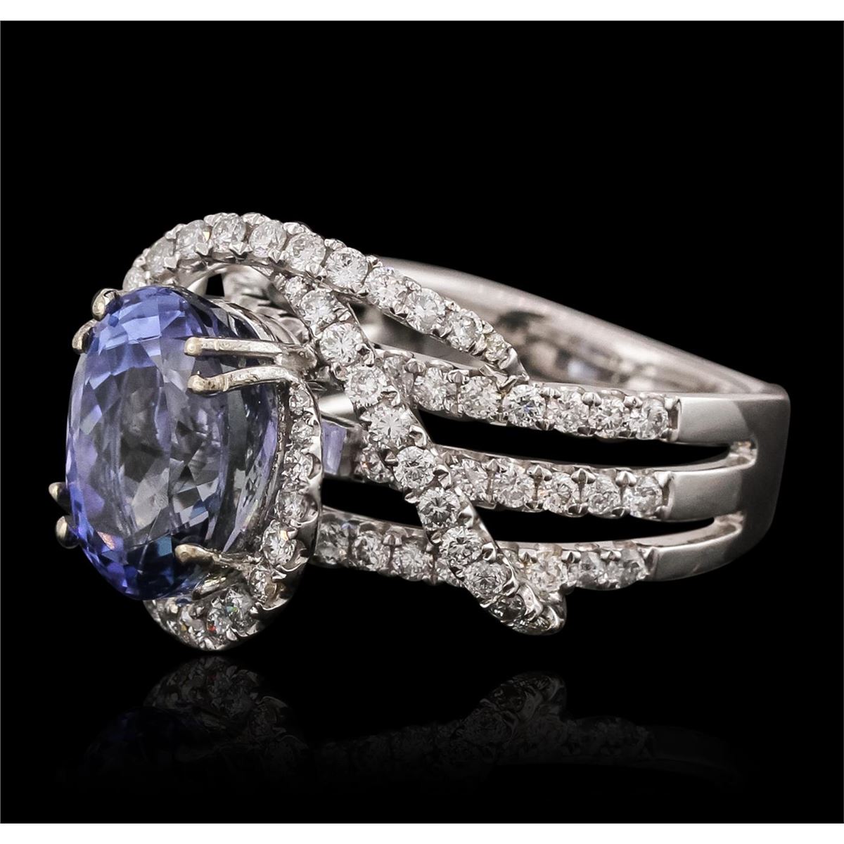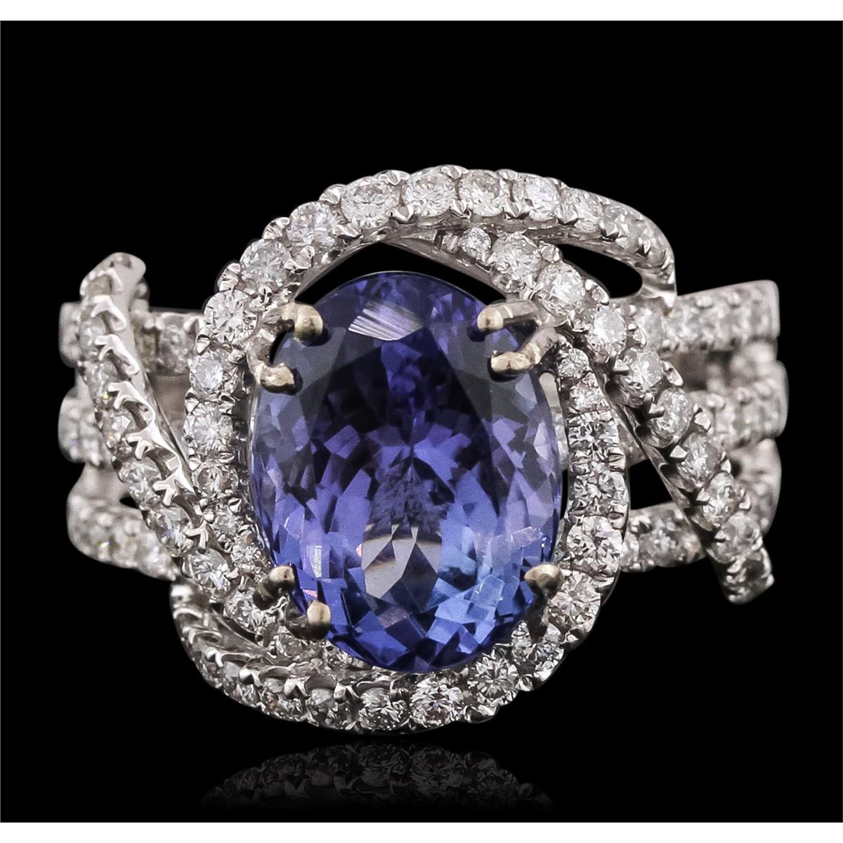 One electronically tested 18KT white gold ladies combination cast & assembled ring with a bright polish finish. Identified with markings of "18K". Condition is new. Containing: One prong set oval modified brilliant cut natural tanzanite, measuring 10.80 x 8.39 x 5.45mm, approximate weight of 3.36ct., clarity is eye clean, type I, medium light, moderately strong, violet color, (GIA V 4/4), cut is good. One Hundred Nine prong set round brilliant cut diamonds, measuring 1.40 - 1.40 x 0.84mm (depth est.) approximate total weight of 109 Stones = 1.09ct. Clarity: SI-2 to I-1. Color: H - I, Cut is Good. Colored gemstones are presumed to have been subjected to commonly used enhancement processes. All diamonds and colored gemstones are graded in the mounting, unless otherwise stated. Total Weight of Colored Stones 3.36ct. Total Weight of Diamonds 1.09ct. Total Weight of Ring 8.30 grams. GGL Appraised at $10,575.00.