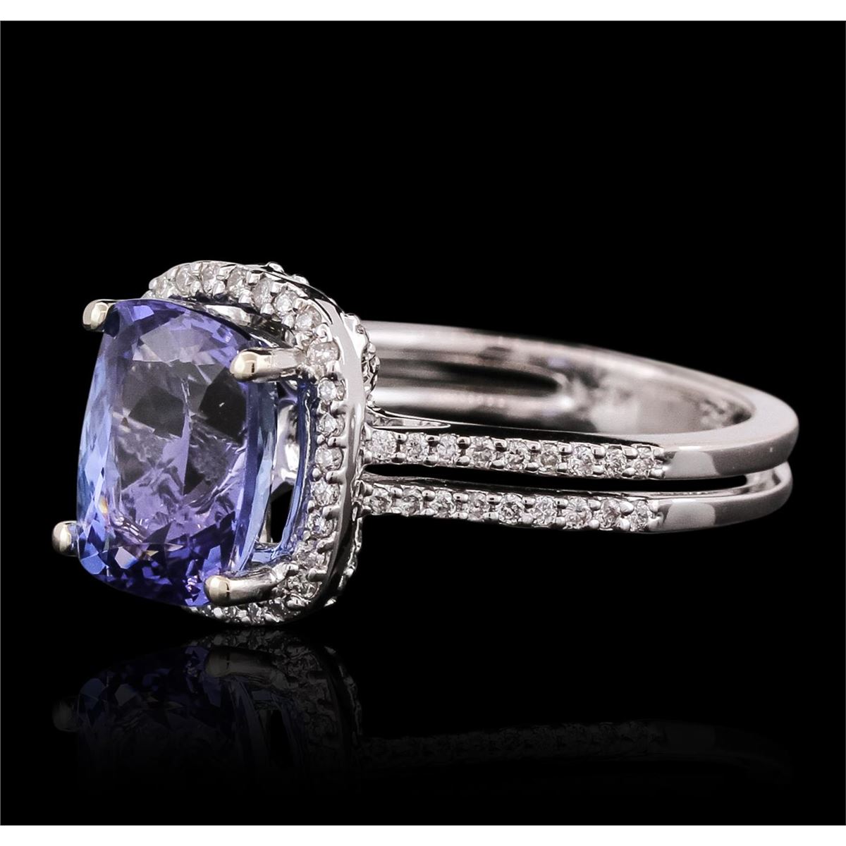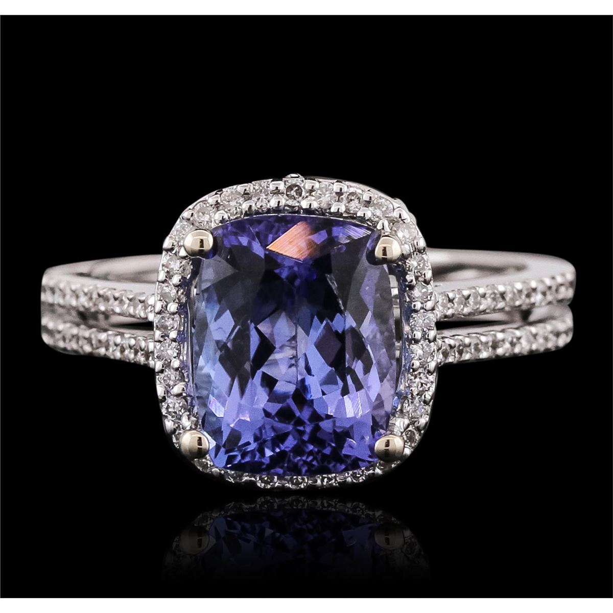 One electronically tested 18KT White Gold ladies cast tanzanite and diamond ring with a bright polish finish. The featured tanzanite is set within a diamond bezel supported by a diamond set under gallery and diamond set split shoulders, completed by a two and one-half millimeter wide band. Identified with markings of "18K 750". Condition is new, good workmanship. Containing: One prong set rectangular cushion mixed cut natural tanzanite, measuring 9.50 x 7.40 x 5.70mm, 8% bulge factor, approximate weight of 3.41ct., clarity is eye clean, type I, medium dark, slightly grayish, bluish violet color, (GIA bV 6/2), cut is good. Transmitting light with no distortion, transparent. Graded in the setting. Tanzanite is a very rare gemstone that is only found in the country of Tanzania. Originally discovered in 1967. Tiffany & Company, named the stone Tanzanite. It is found in the Usumburu Mountains that border the Umba Valley of northern Tanzania. Tanzanite occurs in gray, brown, violet, blue, reddish-purple, & green. The gem is interesting because of its exceptional pleochroism. Rotated in different directions a tanzanite will exhibit multiple changes of color. Tanzanite has a low tolerance to ultrasonic cleaning, and should not be cleaned using this method. Ninety-Six prong set round brilliant cut diamonds approximate total weight of 96 Stones = 0.39ct. Graded in the setting. Clarity: VS-1 to SI-1. Color: H - J. Total Weight of Colored Stones 3.41ct. Total Weight of Diamonds 0.39ct. Total Weight of Ring 5.38 grams. AIG Appraised at $9,505.00.