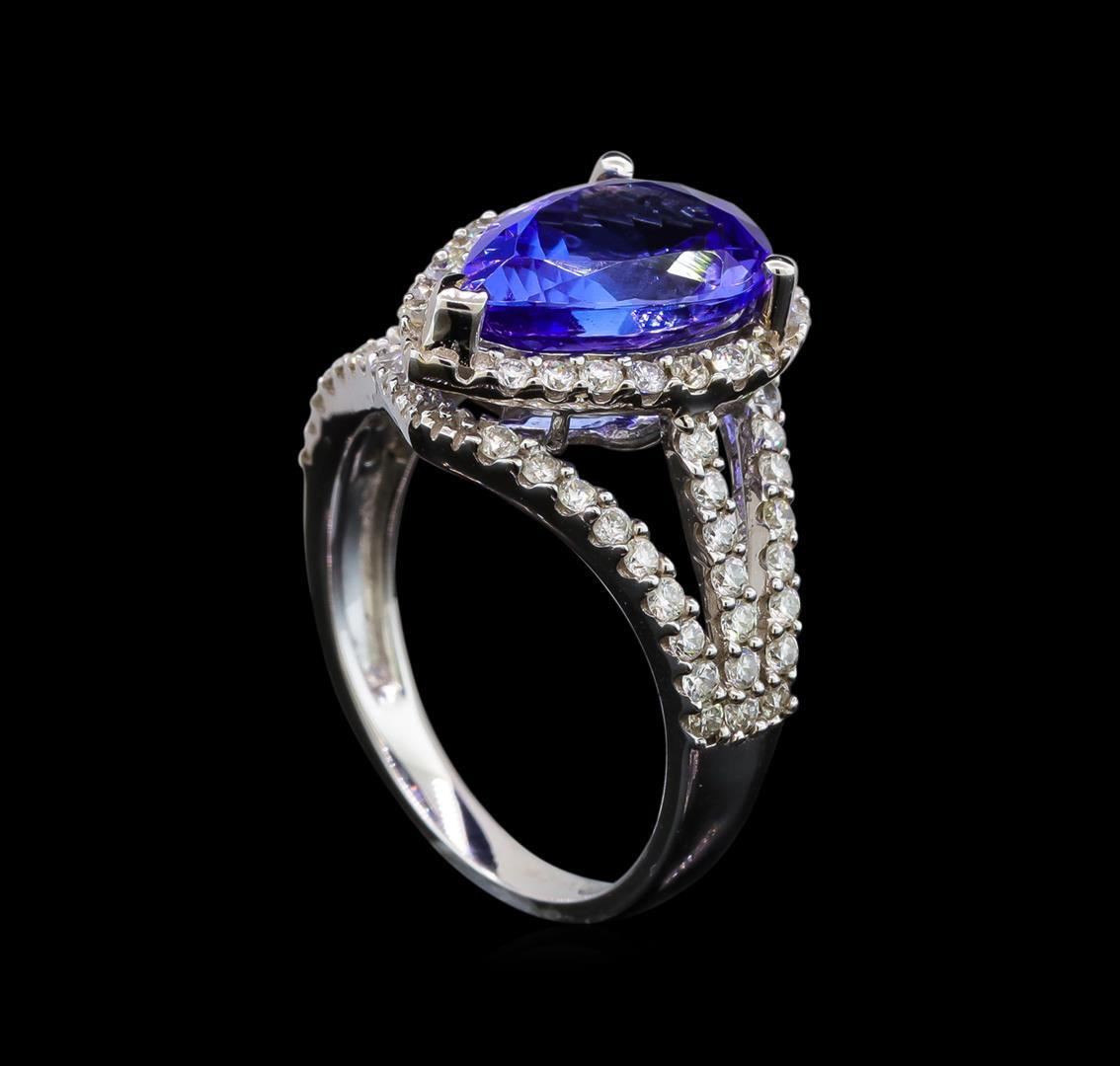 One electronically tested 18KT white gold ladies cast tanzanite and diamond ring with a bright polish finish. Identified with markings of "18K". Condition is new. Containing: One prong set pear modified brilliant cut natural tanzanite, measuring 13.00 x 7.80 x 5.07mm, approximate weight of 3.44ct., clarity is eye clean, type I, medium, moderately strong, violet color, (GIA V 5/4), cut is good. Seventy-Two prong set round brilliant cut diamonds, measuring 1.30 - 1.30 x 0.78mm (depth est.) approximate total weight of 72 Stones = 1.00ct. Clarity: SI-2 to I-2. Color: I - J. All diamonds and colored gemstones are graded in the mounting, unless otherwise stated. Colored gemstones are presumed to have been subjected to commonly used enhancement processes. Total Weight of Colored Stones 3.44ct. Total Weight of Diamonds 1.00ct. Total Weight of Ring 5.60 grams. GGL Appraised.