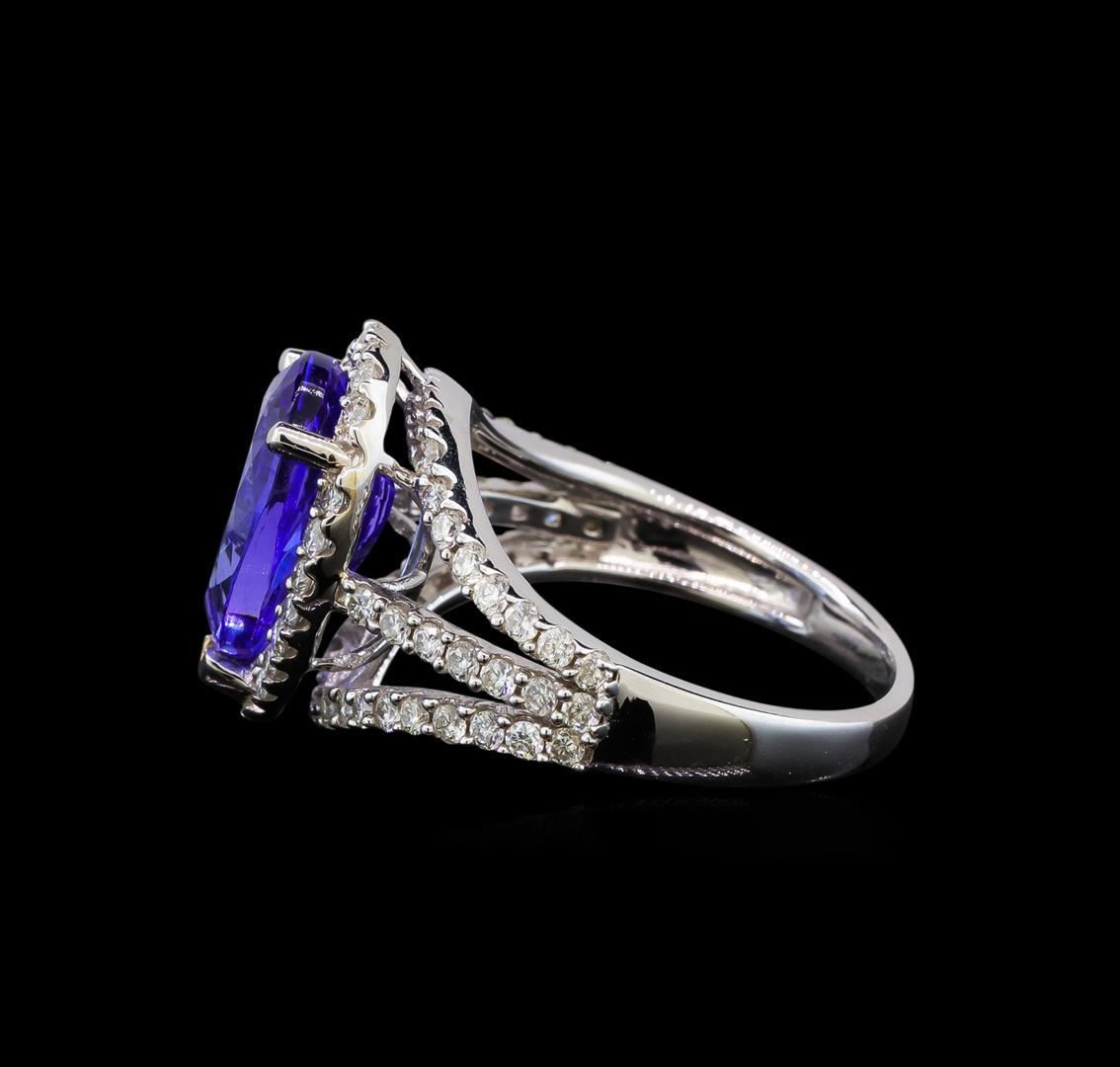 One electronically tested 18KT white gold ladies cast tanzanite and diamond ring with a bright polish finish. Identified with markings of "18K". Condition is new. Containing: One prong set pear modified brilliant cut natural tanzanite, measuring 13.00 x 7.80 x 5.07mm, approximate weight of 3.44ct., clarity is eye clean, type I, medium, moderately strong, violet color, (GIA V 5/4), cut is good. Seventy-Two prong set round brilliant cut diamonds, measuring 1.30 - 1.30 x 0.78mm (depth est.) approximate total weight of 72 Stones = 1.00 ct. Clarity: SI-2 to I-2. Color: I - J. All diamonds and colored gemstones are graded in the mounting, unless otherwise stated. Colored gemstones are presumed to have been subjected to commonly used enhancement processes. Total Weight of Colored Stones 3.44ct. Total Weight of Diamonds 1.00 ct. Total Weight of Ring 5.60 grams. GGL Appraised.