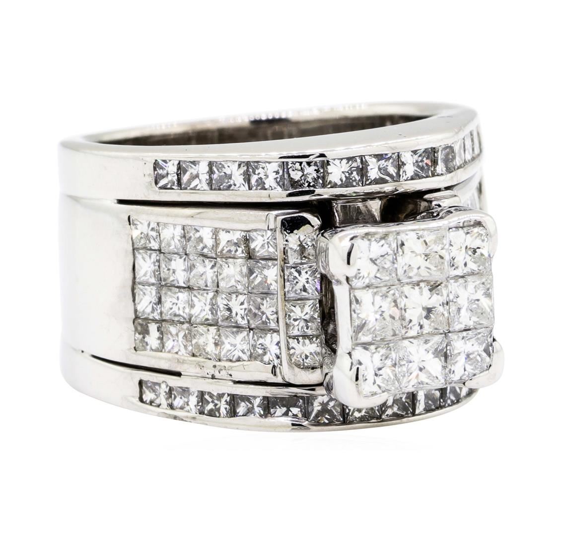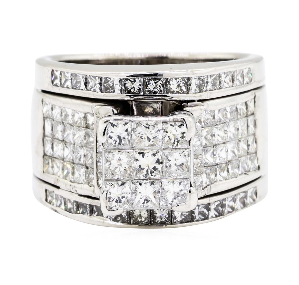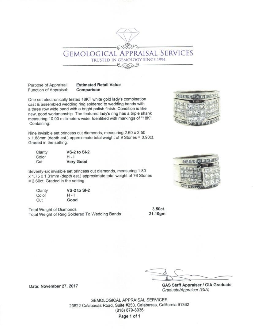 One set electronically tested 18KT white gold lady's combination cast & assembled wedding ring soldered to wedding bands with a three row wide band with a bright polish finish. The featured lady's ring has a triple shank measuring 10.00 millimeters wide. Identified with markings of '18K'. Condition is like new, good workmanship. Containing: Nine invisible set princess cut diamonds, measuring 2.60 x 2.50 x 1.88mm (depth est.) approximate total weight of 9 Stones = 0.90ct. Graded in the setting. Color H - I Clarity VS-2 to SI-2 Cut Very Good Seventy-Six invisible set princess cut diamonds, measuring 1.80 x 1.75 x 1.31mm (depth est.) approximate total weight of 76 Stones = 2.60ct. Graded in the setting. Color H - I Clarity VS-2 to SI-2 Cut Good. Total Weight of Diamonds 3.50ct.. Total Weight of Ring Soldered To Wedding Bands 21.10gm. GAS Appraised.