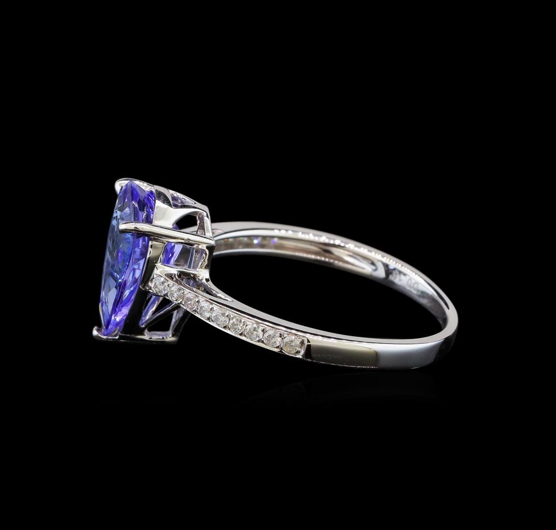 One electronically tested 18KT white gold ladies cast tanzanite and diamond ring with a cathedral shank with a bright polish finish. Trademark is Orianne. Identified with markings of "14K". Condition is new. Containing: One prong set pear modified brilliant cut natural tanzanite, measuring 10.15 x 8.08 x 6.41mm, approximate weight of 3.52ct., clarity is eye clean, type I, light, slightly grayish, violet color, (GIA V 3/2), cut is good. Eighteen prong set round brilliant cut diamonds, measuring 1.30 - 1.30 x 0.78mm (depth est.) approximate total weight of 18 Stones = 0.16ct. Clarity: SI-2 to I-2. Color: I - J. All diamonds and colored gemstones are graded in the mounting, unless otherwise stated. Colored gemstones are presumed to have been subjected to commonly used enhancement processes. Total Weight of Colored Stones 3.52ct. Total Weight of Diamonds 0.16ct. Total Weight of Ring 2.60 grams. GGL Appraised at $2,595.00.