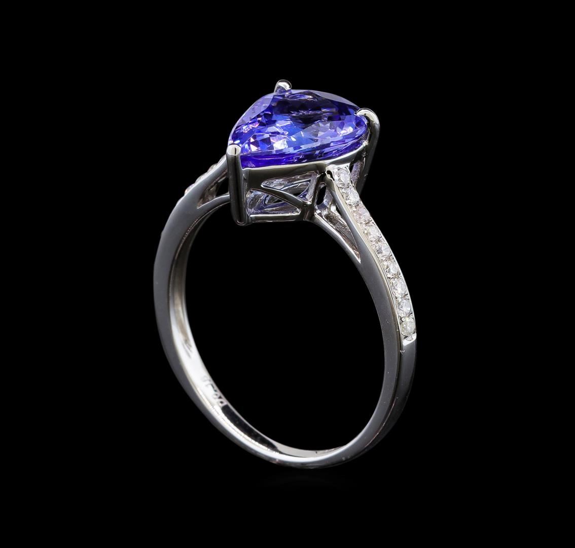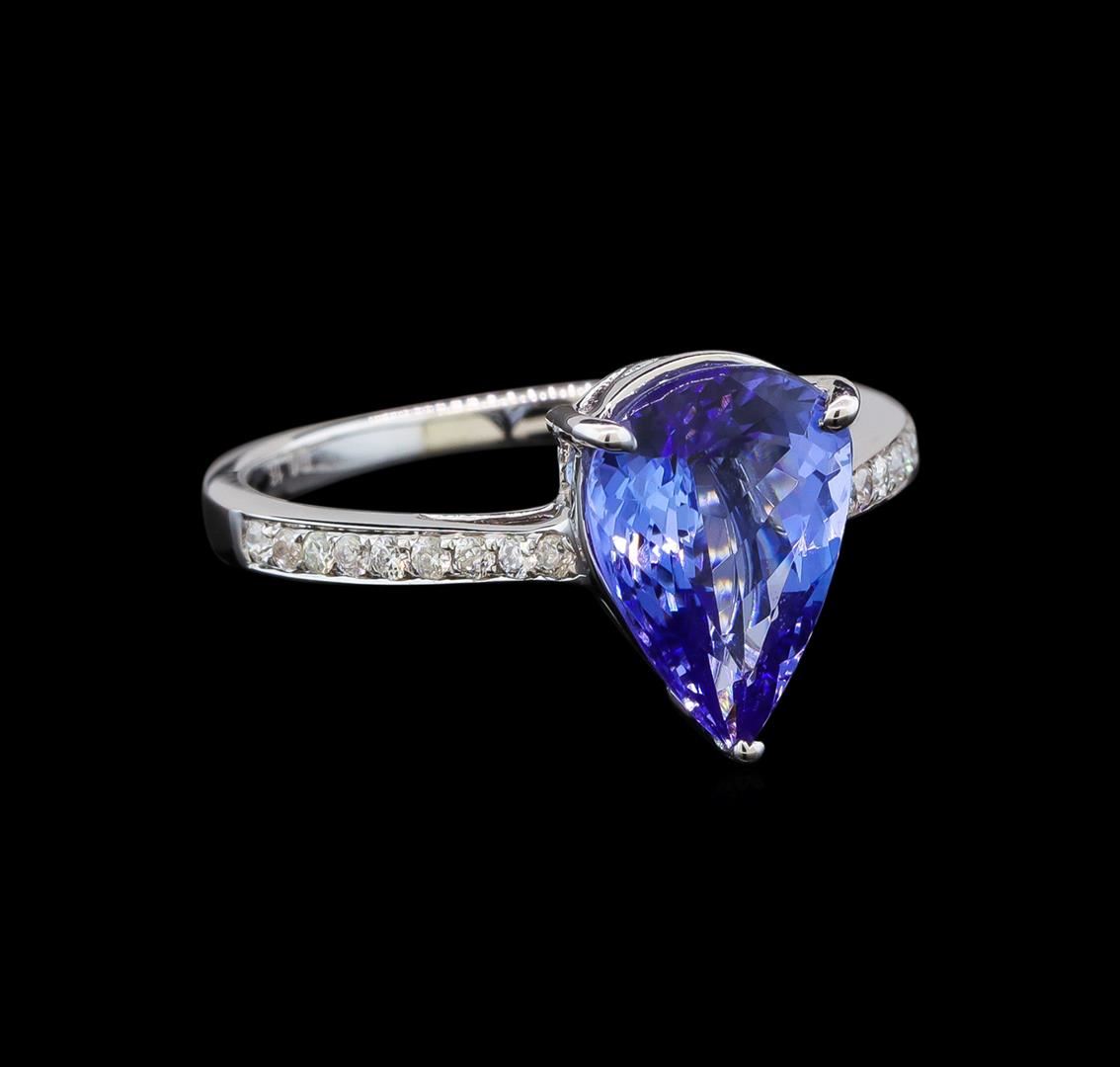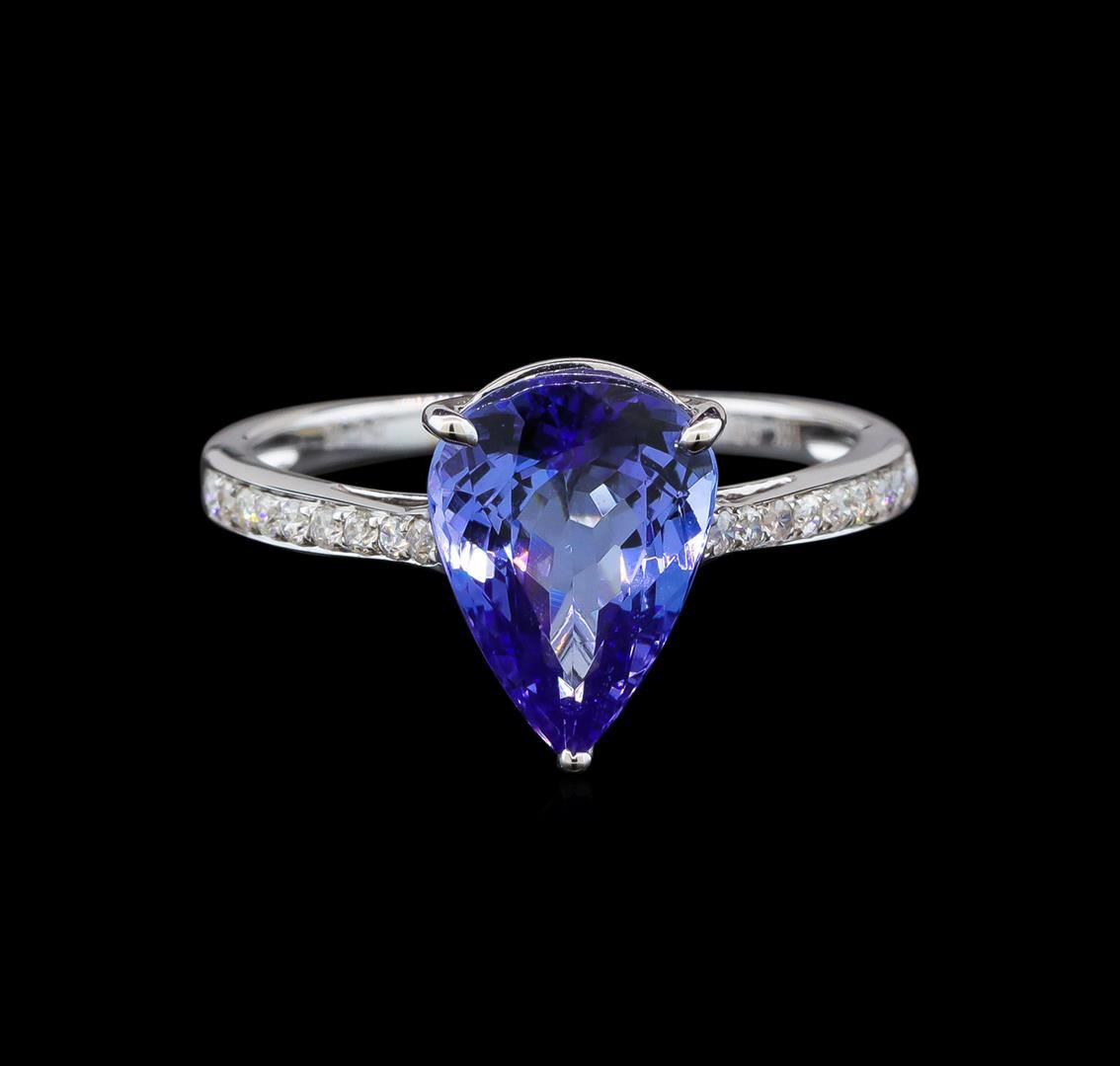 One electronically tested 18KT white gold ladies cast tanzanite and diamond ring with a cathedral shank with a bright polish finish. Trademark is Orianne. Identified with markings of "14K". Condition is new. Containing: One prong set pear modified brilliant cut natural tanzanite, measuring 10.15 x 8.08 x 6.41mm, approximate weight of 3.52ct., clarity is eye clean, type I, light, slightly grayish, violet color, (GIA V 3/2), cut is good. Eighteen prong set round brilliant cut diamonds, measuring 1.30 - 1.30 x 0.78mm (depth est.) approximate total weight of 18 Stones = 0.16ct. Clarity: SI-2 to I-2. Color: I - J. All diamonds and colored gemstones are graded in the mounting, unless otherwise stated. Colored gemstones are presumed to have been subjected to commonly used enhancement processes. Total Weight of Colored Stones 3.52ct. Total Weight of Diamonds 0.16ct. Total Weight of Ring 2.60 grams. GGL Appraised at $2,595.00.