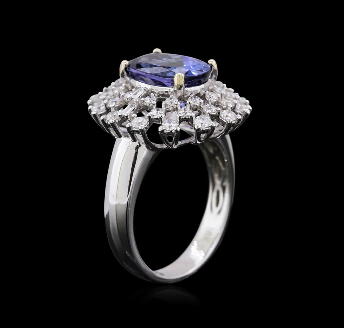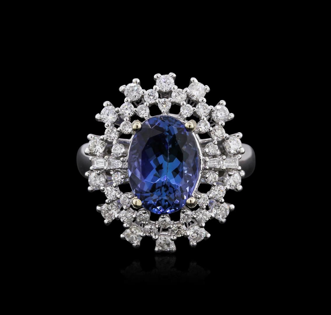 One polished, stamped, and tested 18K white gold ring mounted with: 1 genuine tanzanite center stone weighing 3.53 carat, 4 genuine baguette diamonds weighing 0.06 carats, and 40 genuine round diamonds weighing 0.89 carats. This item weighs 7.0 grams, condition is new, excellent workmanship. MAIN GEMSTONE: Species: Natural Zoisite. Variety: Tanzanite. Shape: Oval. Cutting Style: Modified Brilliant Cut. Measurements: 11 x 8 mm. Weight: 3.53 carat. Color: Violetish Blue. Cut Grade: Very Good. Refractive Index: 1.691 - 1.700 DR. Birefringence: 0.008 - 0.013. Hardness: 6.5 - 7. ADJACENT GEMSTONES ON RING: Identity: Natural Diamond. Cut: Baguette / Round Brilliant. Quantity: 44 Diamonds. Measurements: 2.5 mm (4 baguette) 2.0 - 3.0 mm (40 round). Total Weight: 0.95 carats. Clarity Grade: VS2 - SI2. Color Grade: F - G. Refractive Index: 2.418. Hardness: 10. Tanzanite Weight: 3.53 ct. Total Diamond Weight: 0.95 cts. Weight of Item. 7.0 grams. Gold Content: 18K White Gold. AIGL Appraised at $10,780.00.