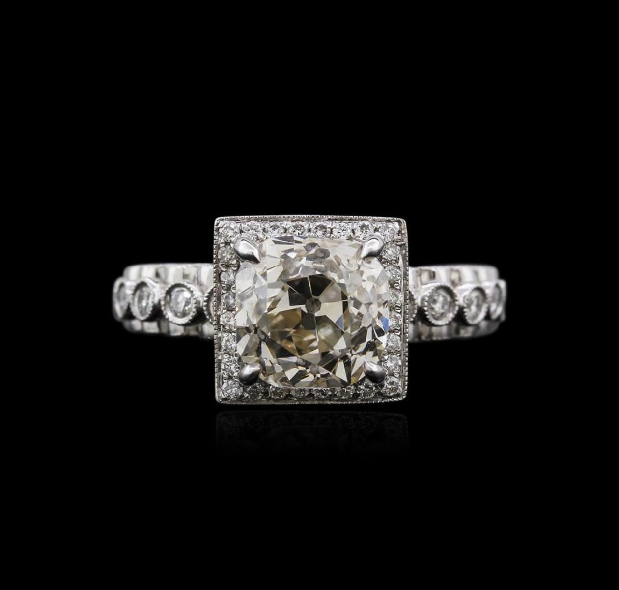 One electronically tested 18KT white gold ladies cast diamond engagement ring with a bright polish finish. Identified with markings of "18K". Condition is new. Containing: One prong set old mine cut diamond, measuring 8.25 - 8.25 x 7.50mm (depth est.) approximate weight of 3.11ct. Clarity: SI-1. Color: L. Sixty-Four bezel set round brilliant cut diamonds, measuring 1.50 - 1.00 x 0.75mm (depth est.) approximate total weight of 64 Stones = 0.45ct. Clarity: SI-2 to I-1. Color: I - J, Cut is Good. Diamonds are graded in the mounting, unless otherwise stated. Total Weight of Diamonds 3.57ct. Total Weight of Engagement Ring 5.70 grams. GGL Appraised.