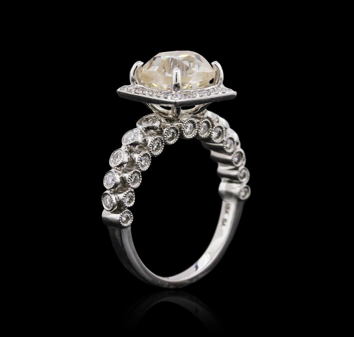 One electronically tested 18KT white gold ladies cast diamond engagement ring with a bright polish finish. Identified with markings of "18K". Condition is new. Containing: One prong set old mine cut diamond, measuring 8.25 - 8.25 x 7.50mm (depth est.) approximate weight of 3.11ct. Clarity: SI-1. Color: L. Sixty-Four bezel set round brilliant cut diamonds, measuring 1.50 - 1.00 x 0.75mm (depth est.) approximate total weight of 64 Stones = 0.45ct. Clarity: SI-2 to I-1. Color: I - J, Cut is Good. Diamonds are graded in the mounting, unless otherwise stated. Total Weight of Diamonds 3.57ct. Total Weight of Engagement Ring 5.70 grams. GGL Appraised at $29,715.00.
