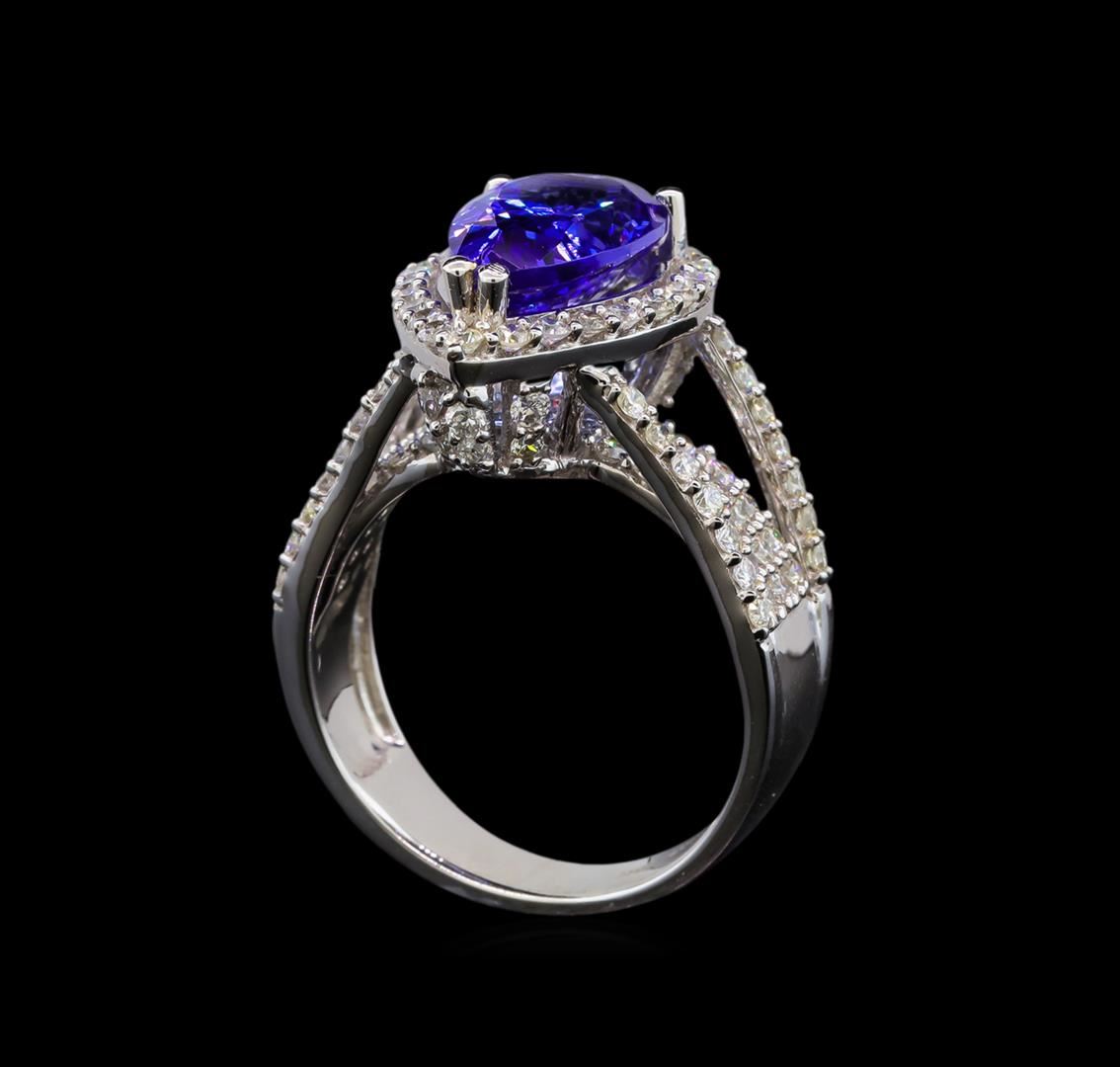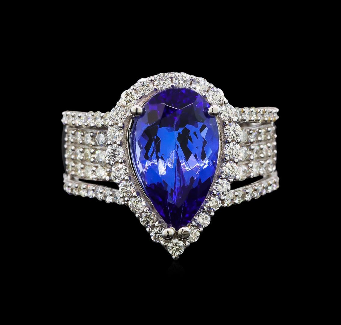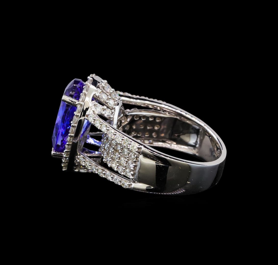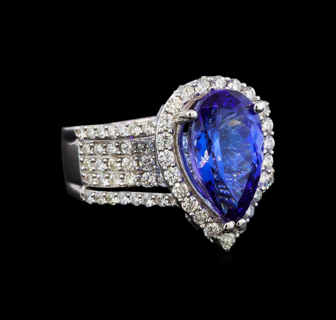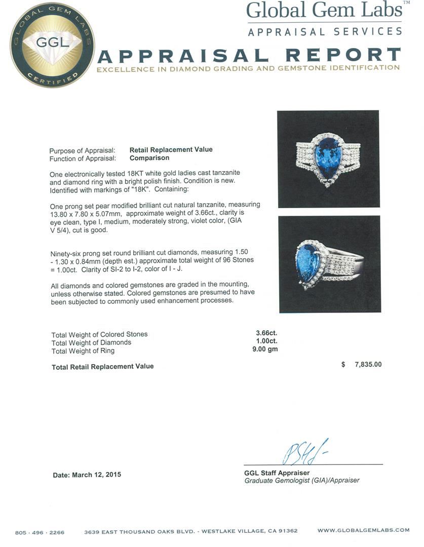 One electronically tested 18KT white gold ladies cast tanzanite and diamond ring with a bright polish finish. Identified with markings of "18K". Condition is new. Containing: One prong set pear modified brilliant cut natural tanzanite, measuring 13.80 x 7.80 x 5.07mm, approximate weight of 3.66ct., clarity is eye clean, type I, medium, moderately strong, violet color, (GIA V 5/4), cut is good. Ninety-Six prong set round brilliant cut diamonds, measuring 1.50 - 1.30 x 0.84mm (depth est.) approximate total weight of 96 Stones = 1.00ct. Clarity: SI-2 to I-2. Color: I - J. All diamonds and colored gemstones are graded in the mounting, unless otherwise stated. Colored gemstones are presumed to have been subjected to commonly used enhancement processes. Total Weight of Colored Stones 3.66ct. Total Weight of Diamonds 1.00ct. Total Weight of Ring 9.00 grams. GGL Appraised at $7,835.00.