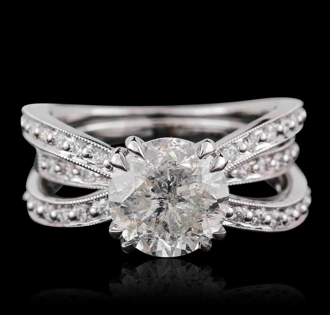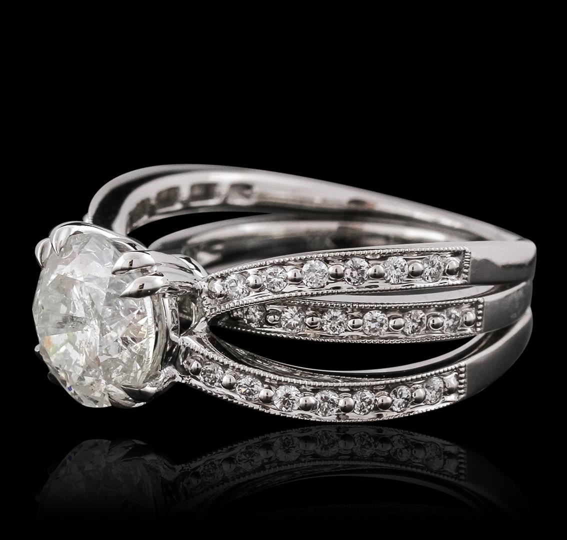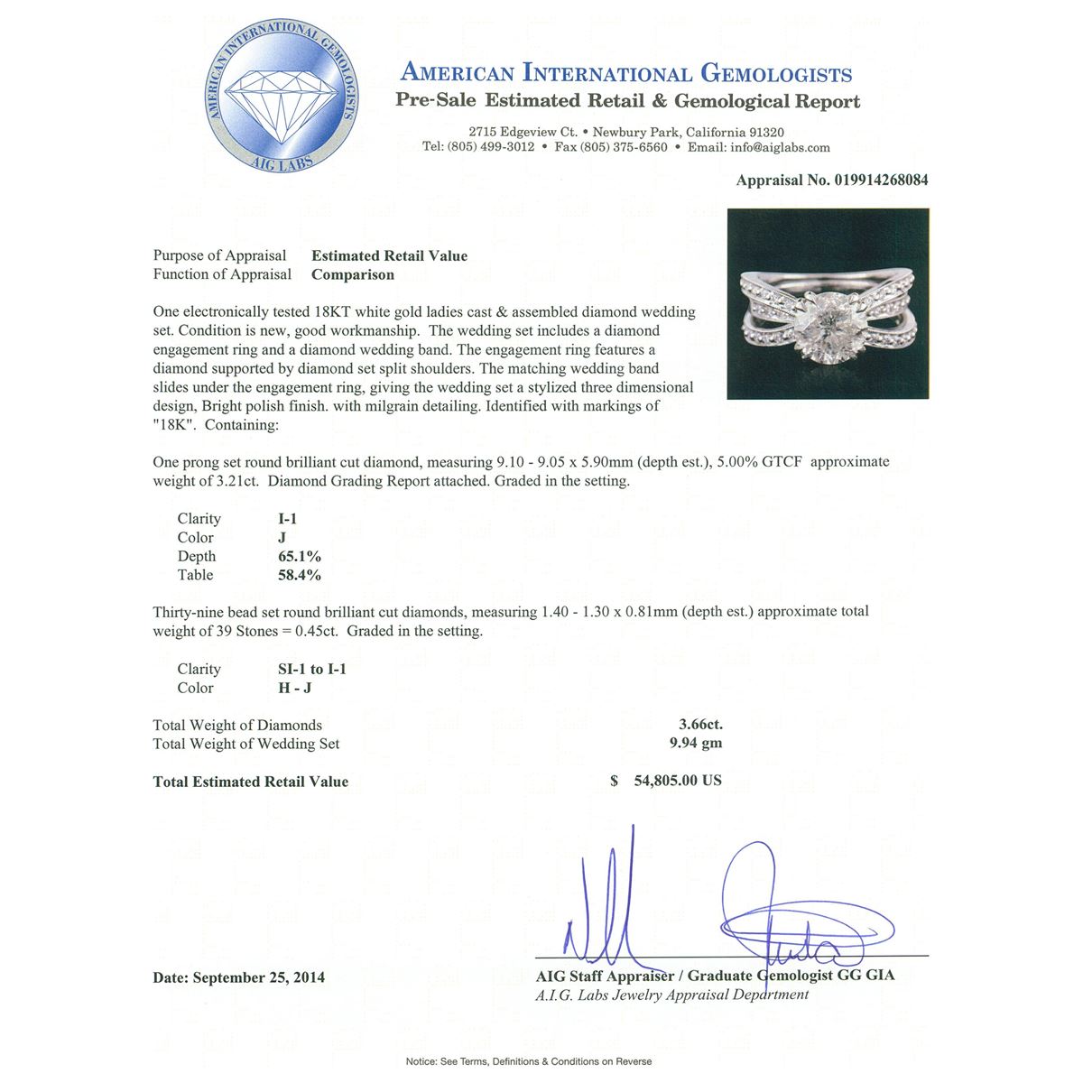One electronically tested 18KT white gold ladies cast & assembled diamond wedding set. The wedding set includes a diamond engagement ring and a diamond wedding band. The engagement ring features a diamond supported by diamond set split shoulders. The matching wedding band slides under the engagement ring, giving the wedding set a stylized three dimensional design, Bright polish finish. with milgrain detailing. Identified with markings of "18K". Condition is new, good workmanship. Containing: One prong set round brilliant cut diamond, measuring 9.10 - 9.05 x 5.90mm (depth est.), 5.00% GTCF approximate weight of 3.21ct. Diamond Grading Report attached. Graded in the setting. Clarity: I-1. Color: 65.1%. Table 58.4%. Thirty-Nine bead set round brilliant cut diamonds, measuring 1.40 - 1.30 x 0.81mm (depth est.) approximate total weight of 39 Stones = 0.45ct. Graded in the setting. Clarity: SI-1 to I-1. Color: H - J. Total Weight of Diamonds 3.66ct. Total Weight of Wedding Set 9.94 grams. AIG Appraised at $54,805.00.