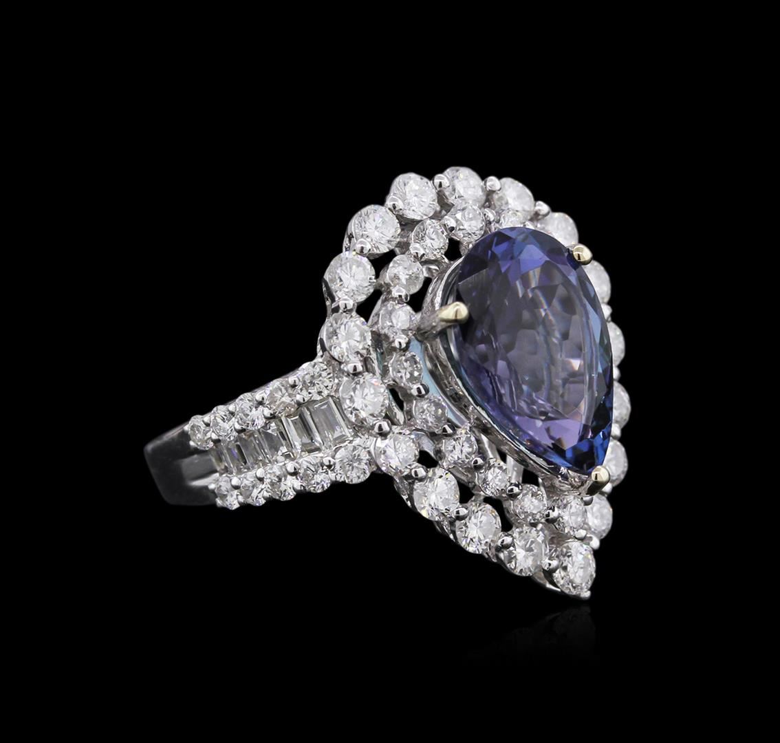 One polished, stamped, and tested 18K white gold ring mounted with: 1 genuine tanzanite center stone weighing 3.67 carat, 14 genuine baguette diamonds weighing 0.23 carats, and 55 genuine round diamonds weighing 1.98 carats. This item weighs 5.6 grams, condition is new, excellent workmanship. MAIN GEMSTONE: Species: Natural Zoisite. Variety: Tanzanite. Shape: Pear. Cutting Style: Modified Brilliant Cut. Measurements: 13 x 9 mm. Weight: 3.67 carat. Color: Violetish Blue. Cut Grade: Very Good. Refractive Index: 1.691 - 1.700 DR. Birefringence: 0.008 - 0.013. Hardness: 6.5 - 7. ADJACENT GEMSTONES ON RING: Identity: Natural Diamond. Cut: Baguette / Round Brilliant. Quantity: 69 Diamonds. Measurements: 2.5 mm (14 baguette) 2.0 - 3.0 mm (55 round). Total Weight: 2.21 carats. Clarity Grade: VS2 - SI1. Color Grade: F - G. Refractive Index: 2.418. Hardness: 10. Tanzanite Weight: 3.67 ct. Total Diamond Weight: 2.21 cts. Weight of Item. 5.6 grams. Gold Content: 18K White Gold. AIGL Appraised at $15,680.00.