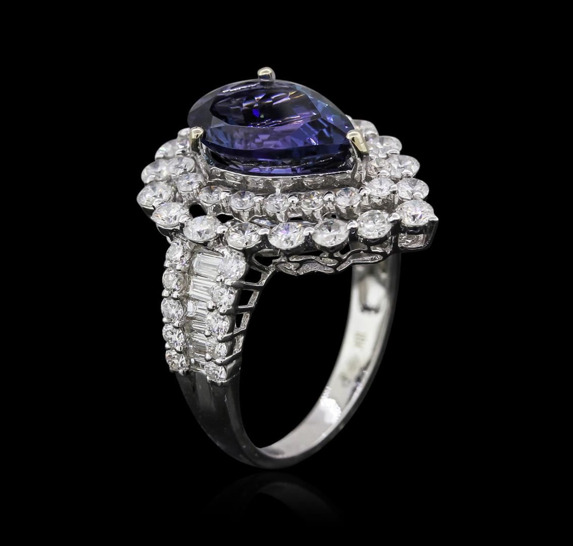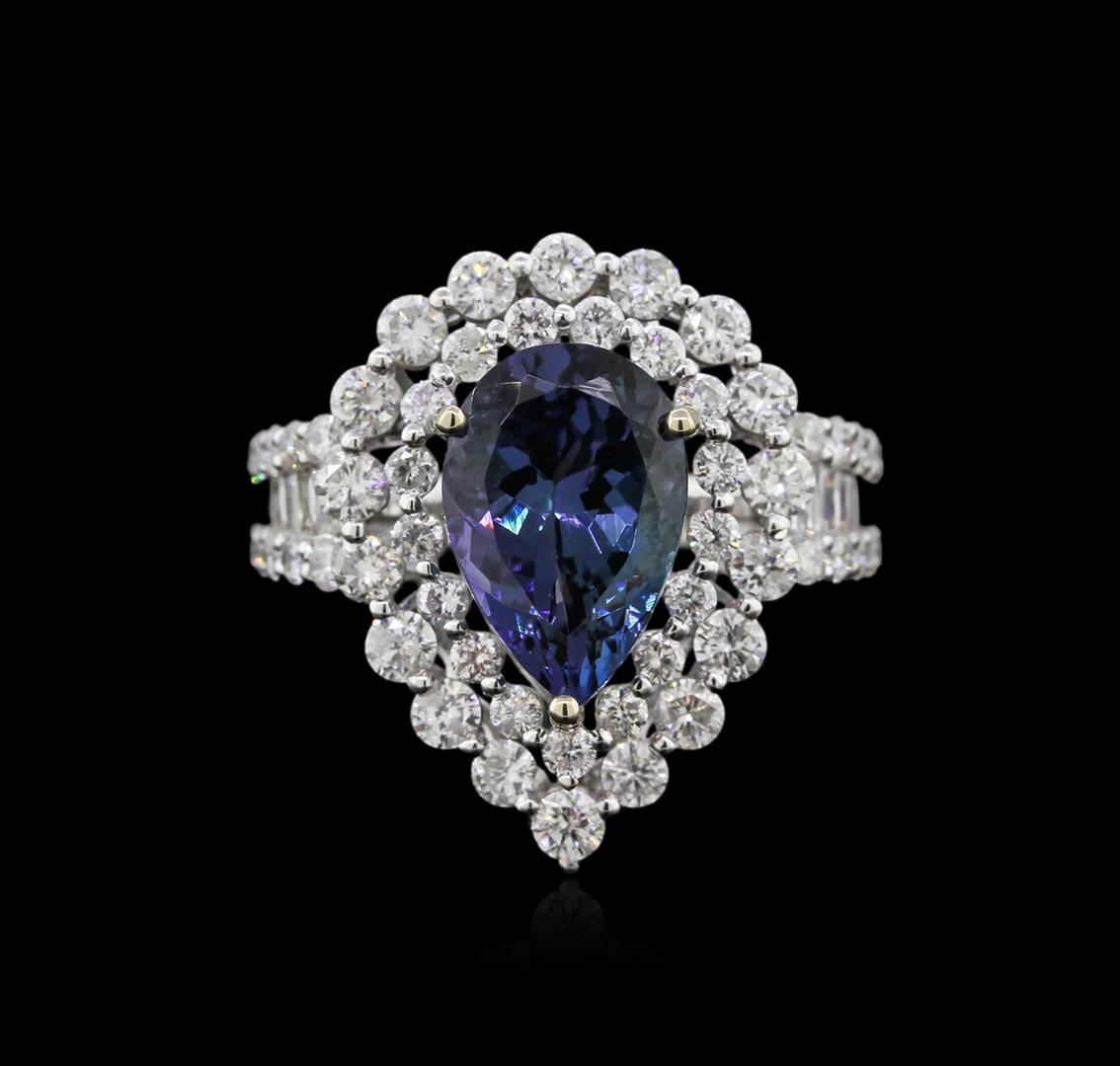 One polished, stamped, and tested 18K white gold ring mounted with: 1 genuine tanzanite center stone weighing 3.67 carat, 14 genuine baguette diamonds weighing 0.23 carats, and 55 genuine round diamonds weighing 1.98 carats. This item weighs 5.6 grams, condition is new, excellent workmanship. MAIN GEMSTONE: Species: Natural Zoisite. Variety: Tanzanite. Shape: Pear. Cutting Style: Modified Brilliant Cut. Measurements: 13 x 9 mm. Weight: 3.67 carat. Color: Violetish Blue. Cut Grade: Very Good. Refractive Index: 1.691 - 1.700 DR. Birefringence: 0.008 - 0.013. Hardness: 6.5 - 7. ADJACENT GEMSTONES ON RING: Identity: Natural Diamond. Cut: Baguette / Round Brilliant. Quantity: 69 Diamonds. Measurements: 2.5 mm (14 baguette) 2.0 - 3.0 mm (55 round). Total Weight: 2.21 carats. Clarity Grade: VS2 - SI1. Color Grade: F - G. Refractive Index: 2.418. Hardness: 10. Tanzanite Weight: 3.67 ct. Total Diamond Weight: 2.21 cts. Weight of Item. 5.6 grams. Gold Content: 18K White Gold. AIGL Appraised at $15,680.00.