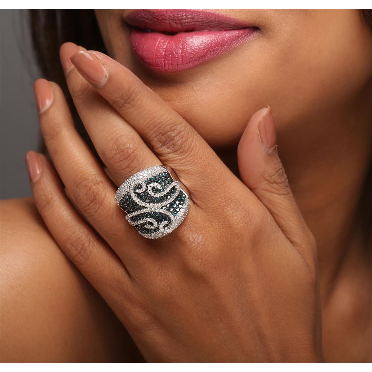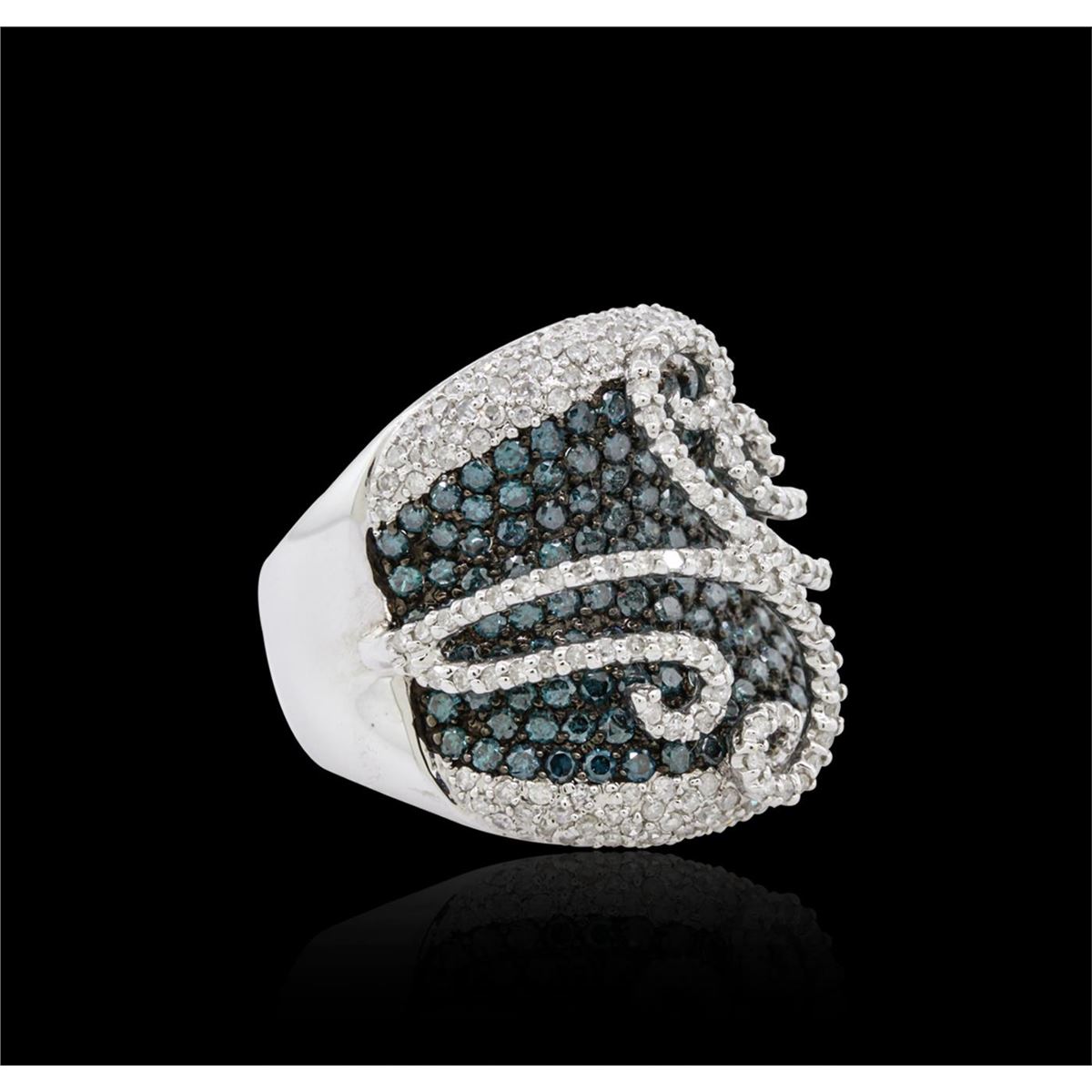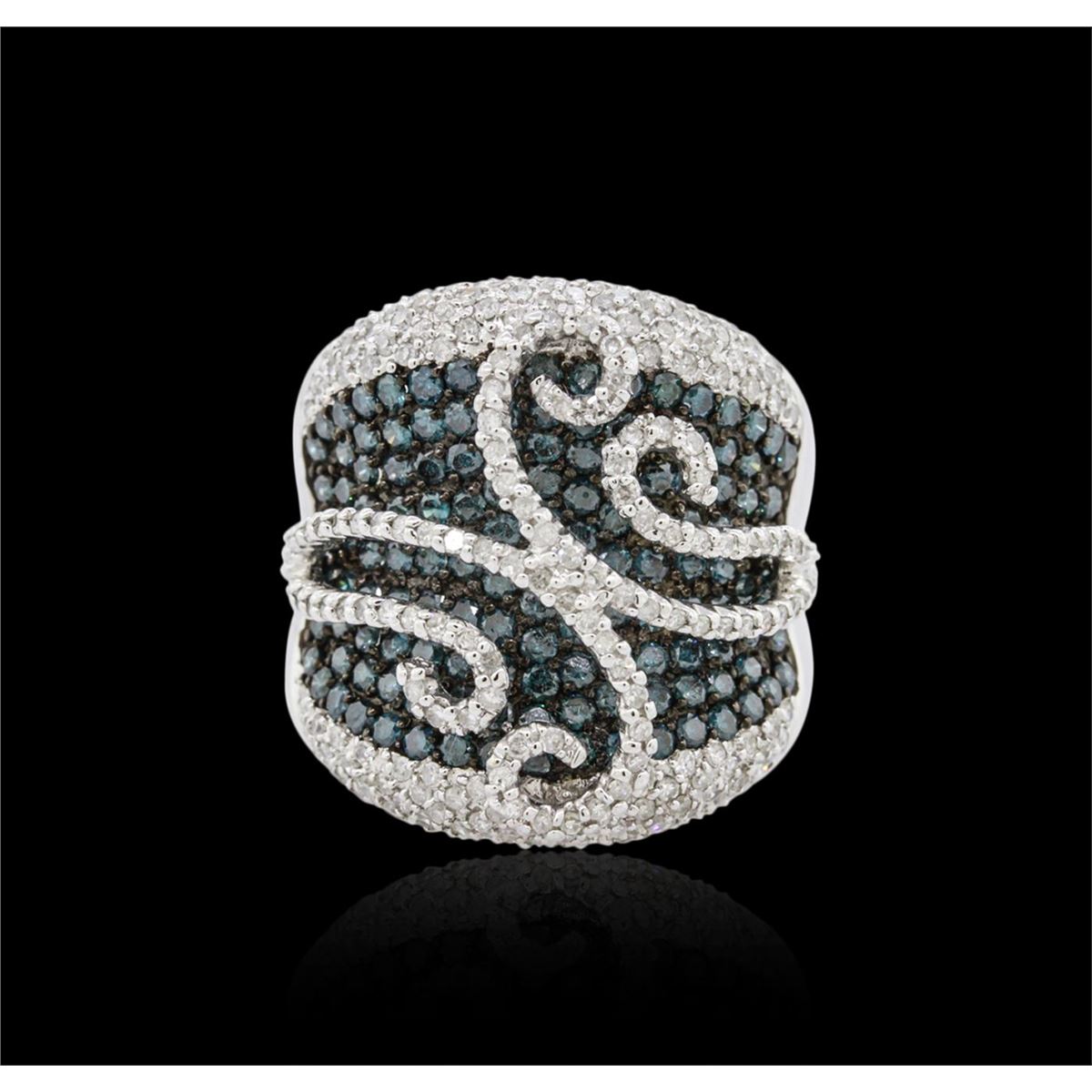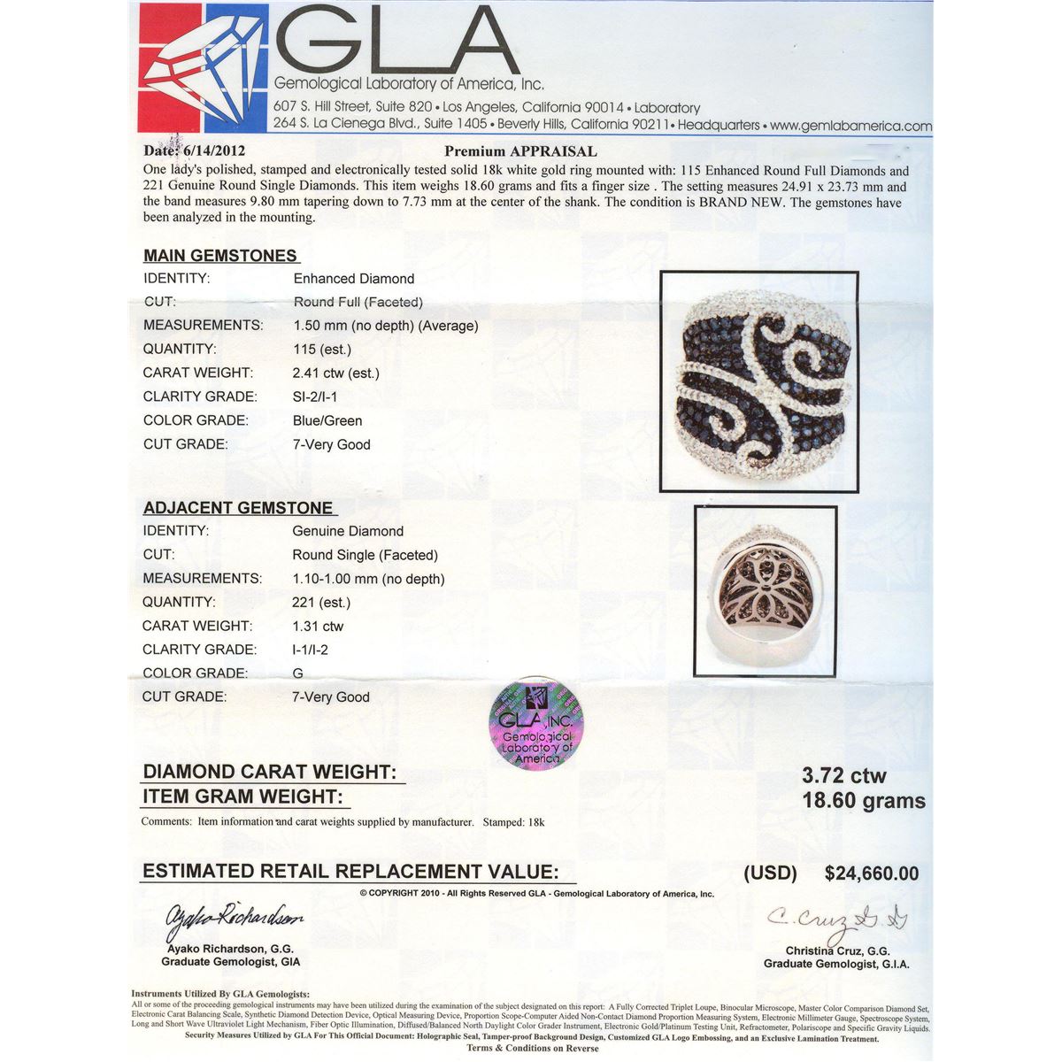 One ladies polished, stamped, and electronically tested solid 18KT white gold ring mounted with: 115 enhanced round full blue/green diamonds with a total weight of 2.41cts and 221 genuine round single diamonds with a total weight of 1.31cts. This item weighs 18.60 grams. The setting measures 24.91x23.73 mm and the band measures 9.80mm tapering down to 7.73 mm at the center of the shank. The condition is brand new. GLA Appraised at $24,660.00.