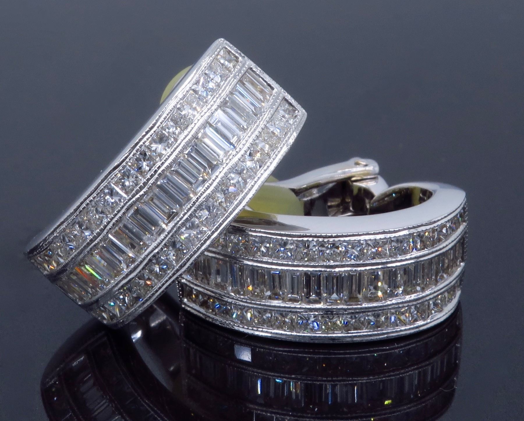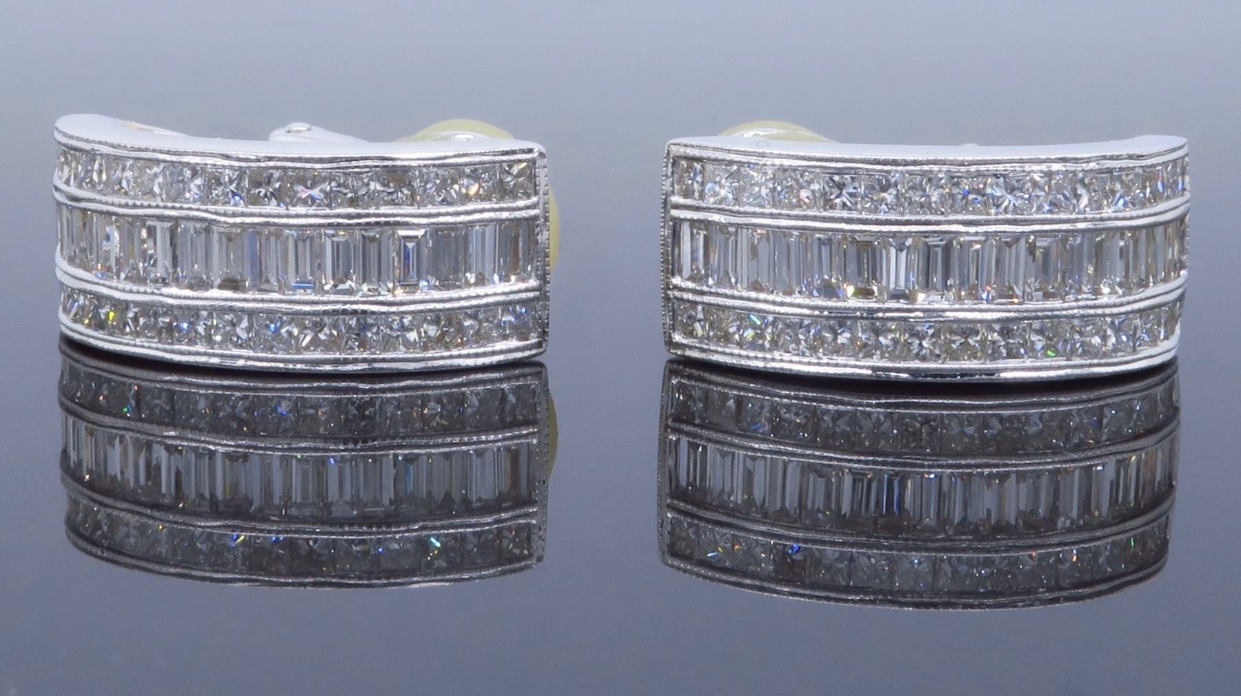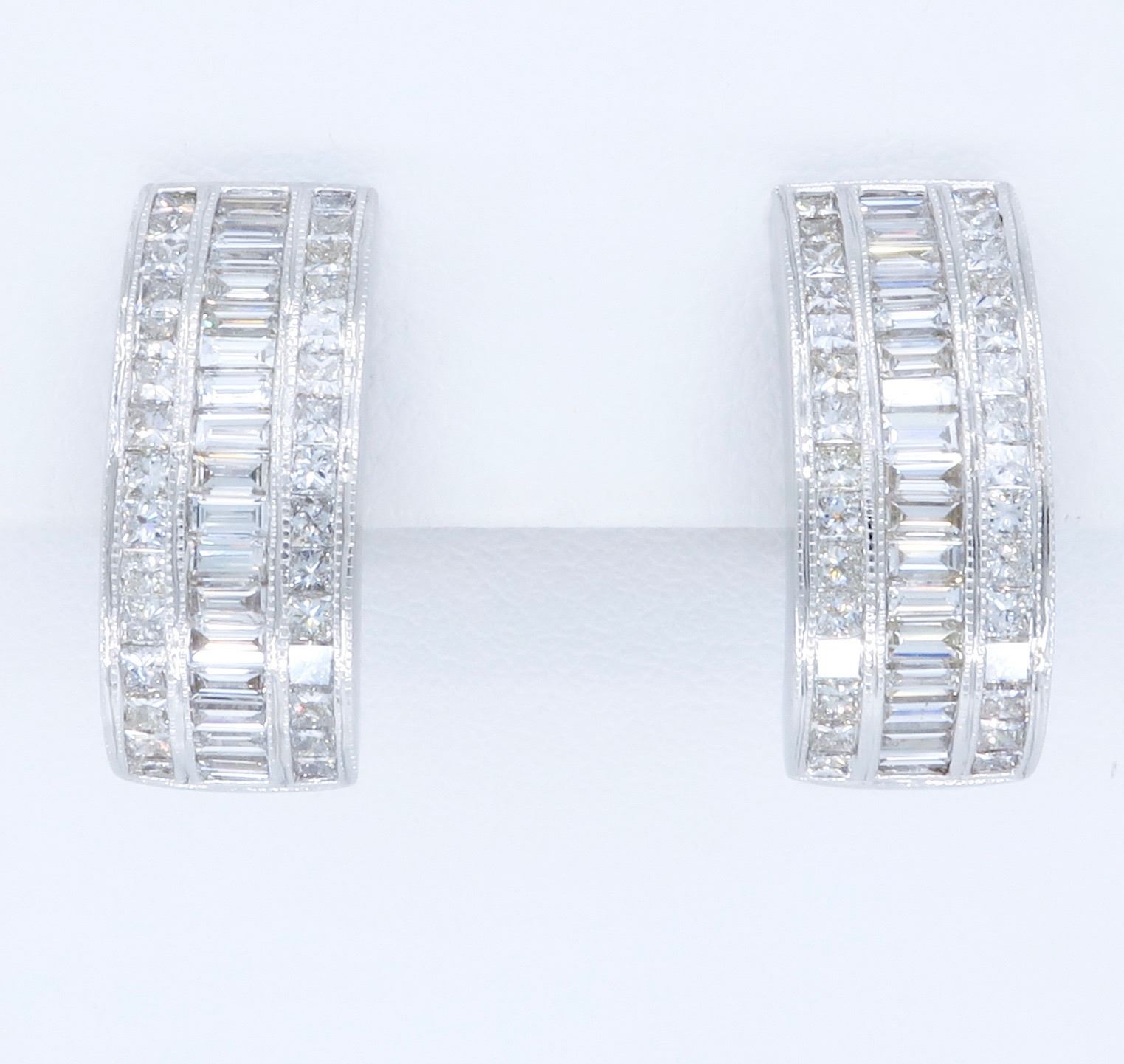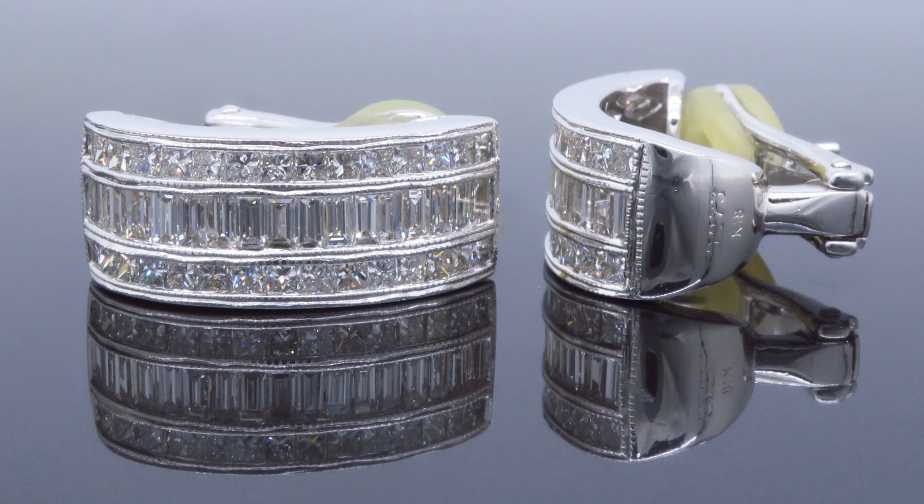 One 18KT White Gold 4.00ctw Diamond Earrings. Baguette and Princess cut Diamonds with a total weight of 4.00cts with a color of G-I and clarity of VS-2 to SI-1. Total weight of these earrings are 13.9 grams.