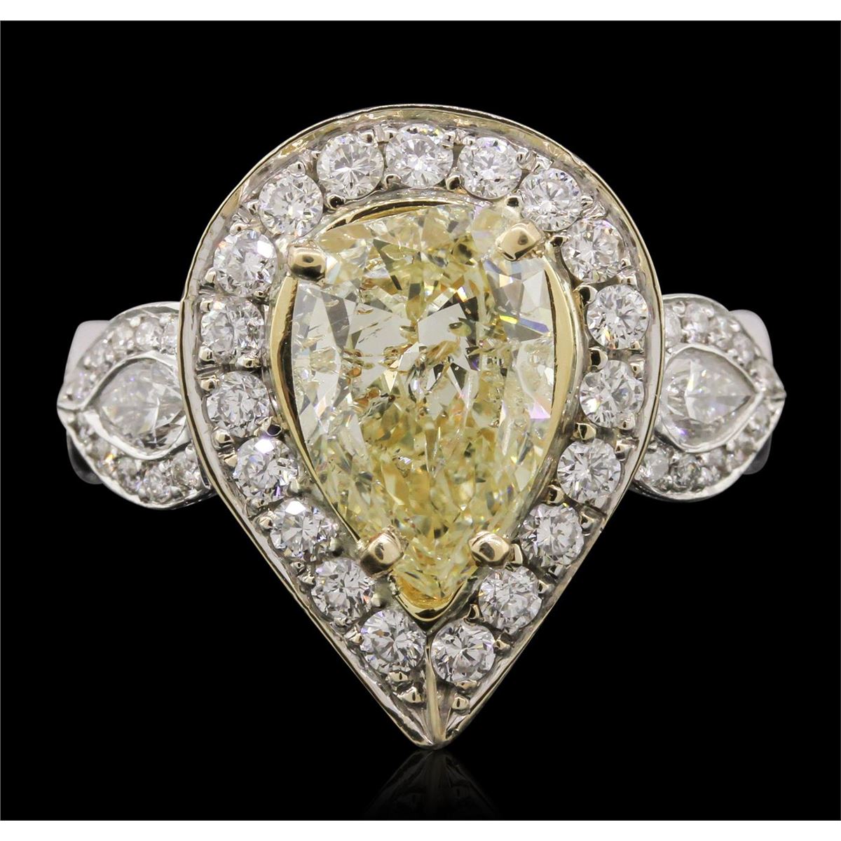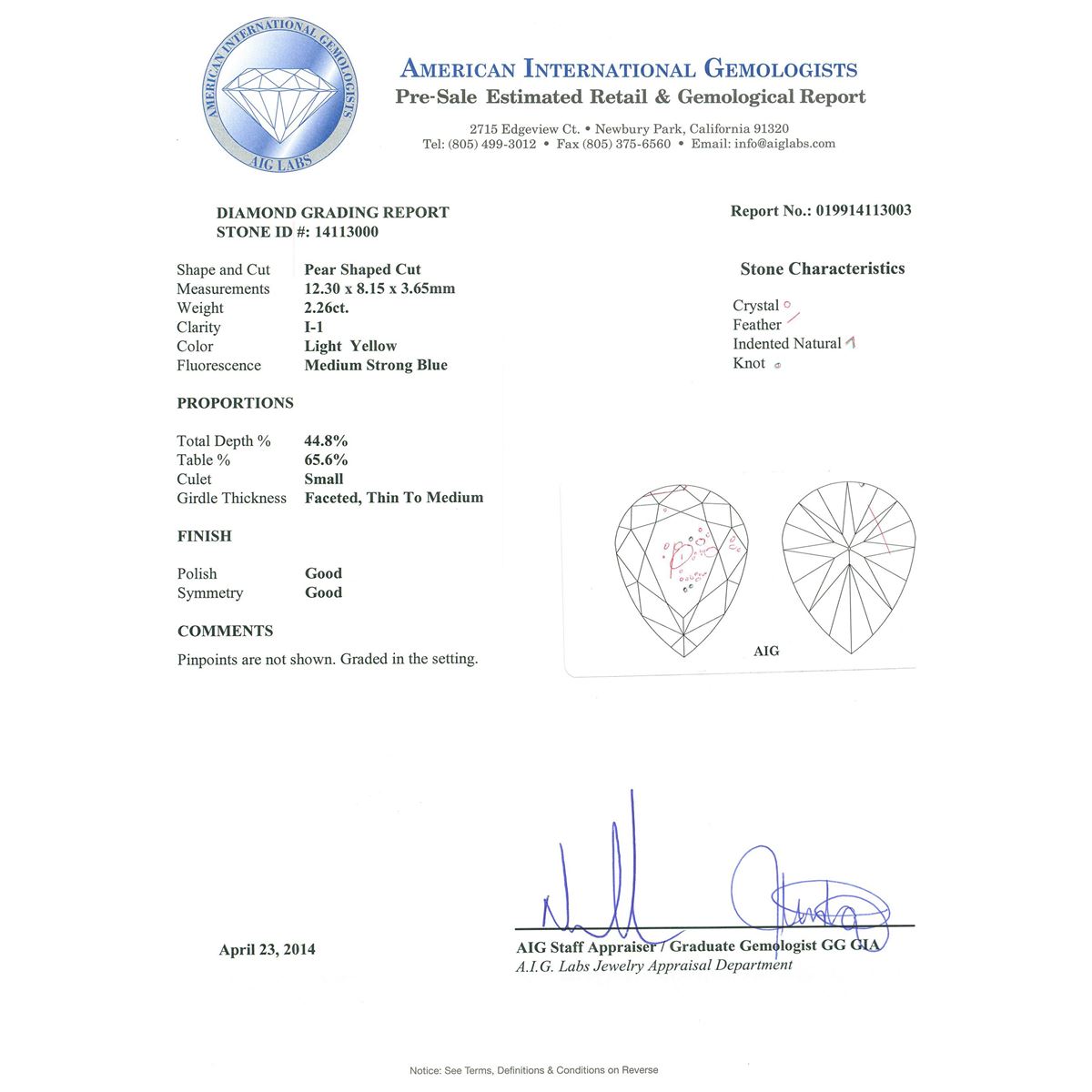 One electronically tested 18KT white gold ladies cast diamond ring. The featured diamond is set within a diamond bezel supported by intertwining diamond set shoulders, completed by a three millimeter wide band. Bright polish finish with yellow gold accents. Identified with markings of "18K". Condition is good. Containing: One prong set pear shaped cut diamond, measuring 12.30 x 8.15 x 3.65mm (depth est.) approximate weight of 2.26ct with a medium strong blue fluorescence. Diamond Grading Report attached. Naturally occurring internal & external characteristics are present, including natural iridescence. Graded in the setting. Clarity: I-1. Depth: 44.8%. Table 65.6%. Two bezel set pear shaped cut diamonds, measuring 4.80 x 3.30 x 2.08mm (depth est.) approximate. Total Weight of 2 Stones = 0.45ct. Color grade is an average for the pair. Graded in the setting. Clarity: VS-1 to VS-2. Color: G Nineteen prong set round brilliant cut diamonds, measuring 2.15 - 2.10 x 1.28mm (depth est.) approximate. Total Weight of 19 Stones = 0.77ct. Graded in the setting. Clarity: VS-1 to SI-1. Color: G - I Fifty-Four prong set round brilliant cut diamonds, measuring 1.40 - 1.20 x 0.78mm (depth est.) approximate. Total Weight of 54 Stones = 0.53ct. Graded in the setting. Clarity: VS-1 to SI-1. Color: G - I. Total Weight of Diamonds 4.01ct. Total Weight of Ring 13.79 grams. AIG Appraised at $27,055.00.