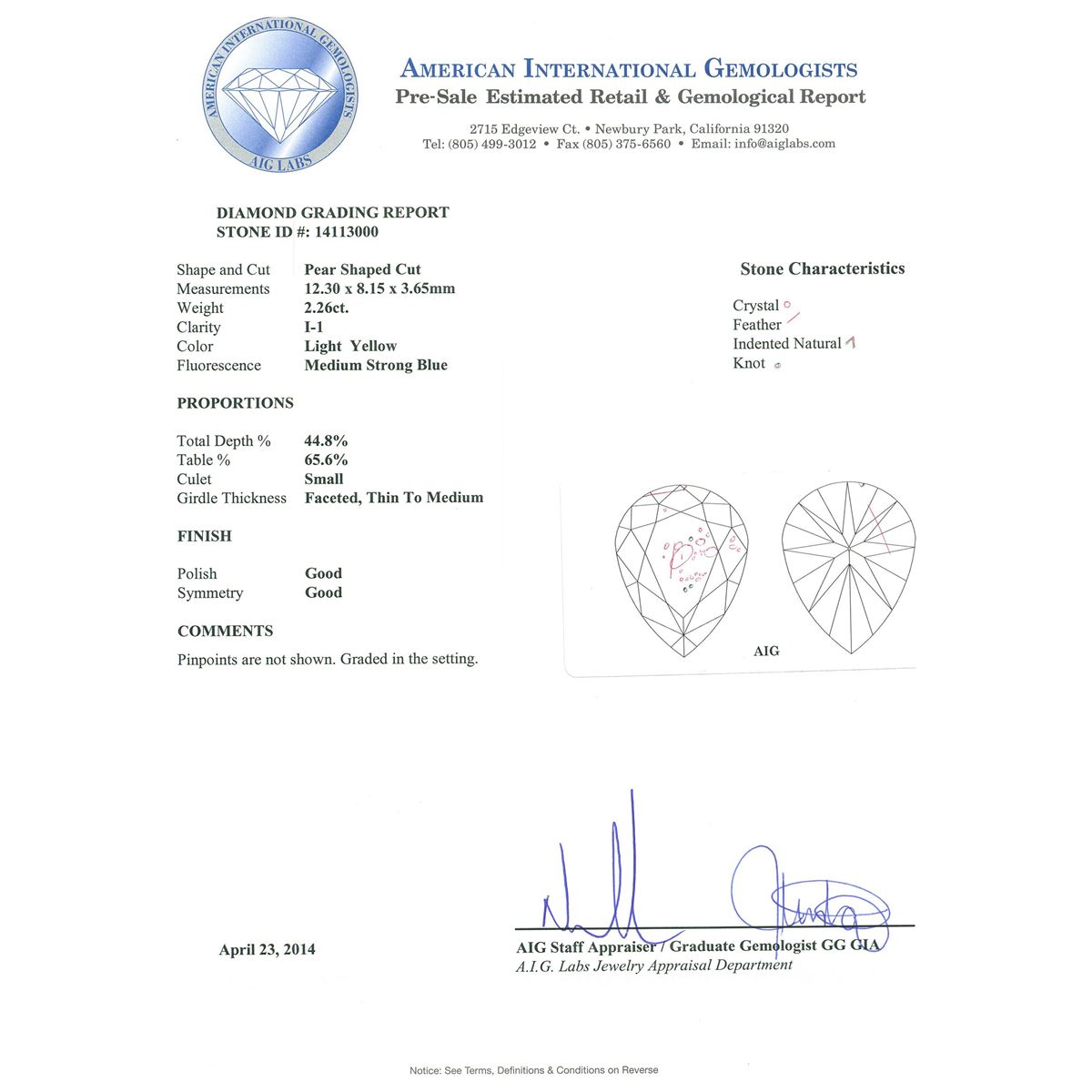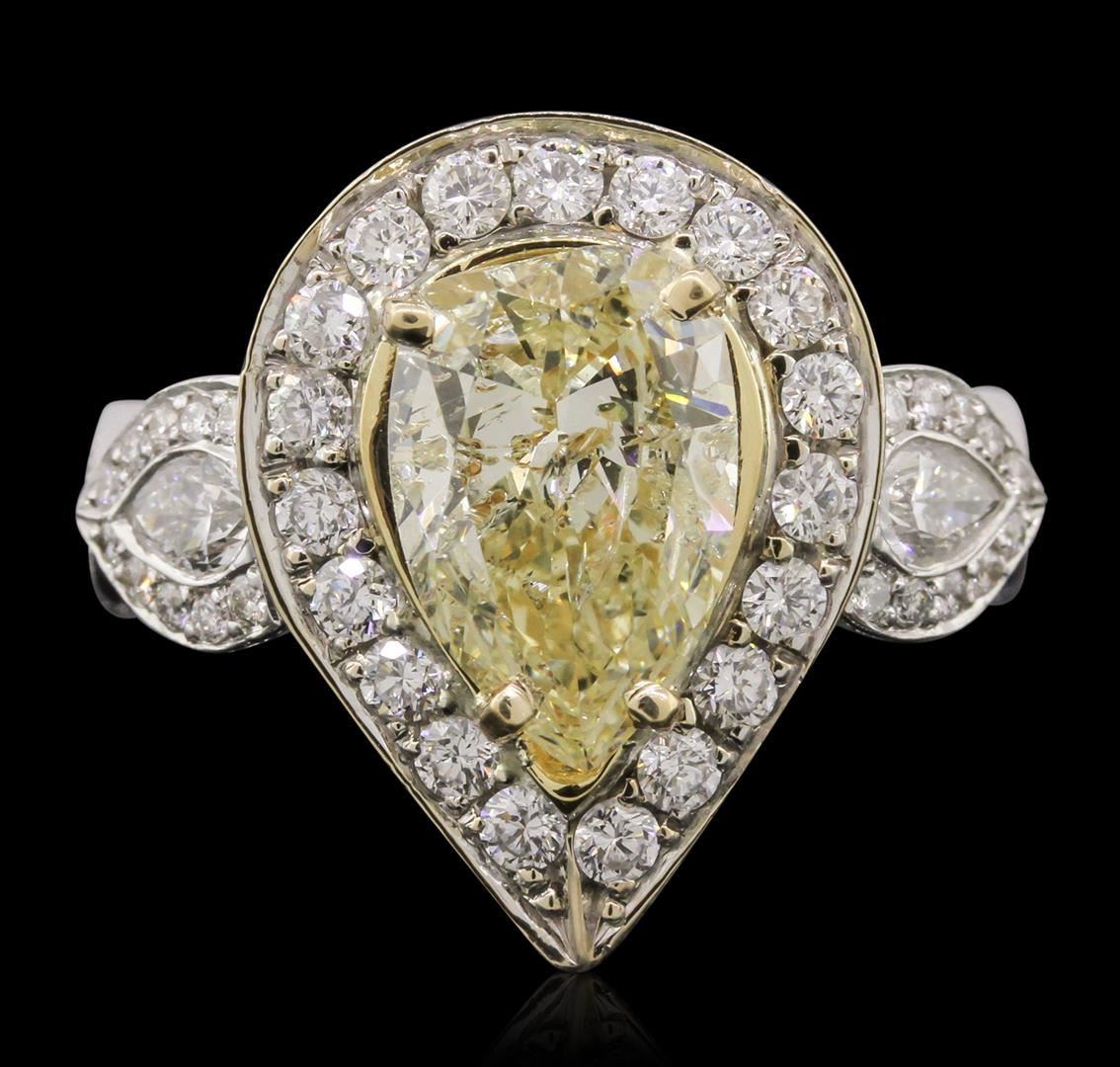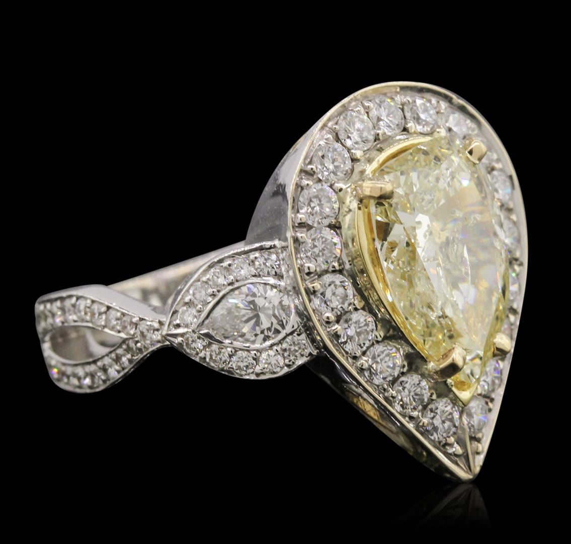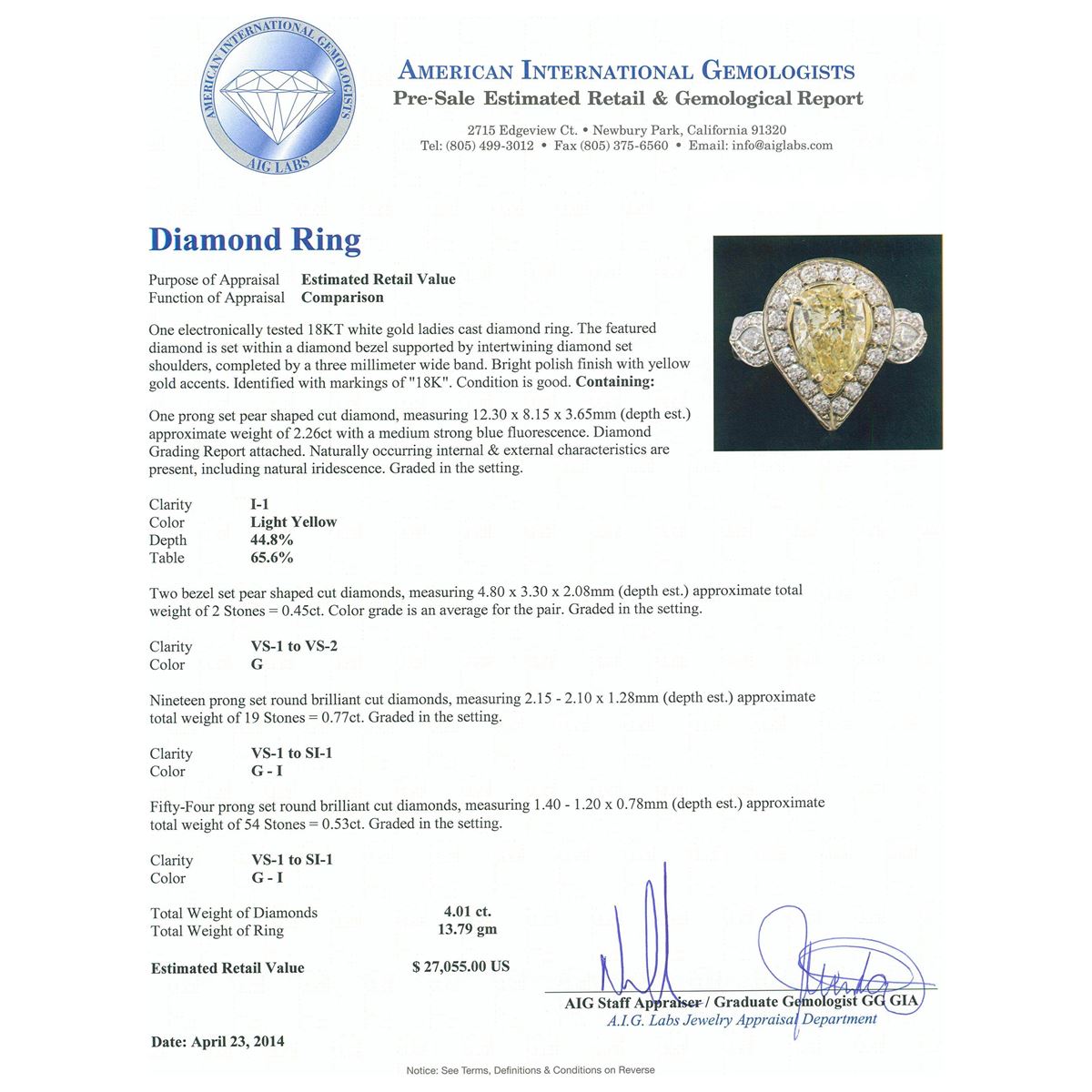 One electronically tested 18KT white gold ladies cast diamond ring. The featured diamond is set within a diamond bezel supported by intertwining diamond set shoulders, completed by a three millimeter wide band. Bright polish finish with yellow gold accents. Identified with markings of "18K". Condition is good. Containing: One prong set pear shaped cut diamond, measuring 12.30 x 8.15 x 3.65mm (depth est.) approximate weight of 2.26ct with a medium strong blue fluorescence. Diamond Grading Report attached. Naturally occurring internal & external characteristics are present, including natural iridescence. Graded in the setting. Clarity: I-1. Depth: 44.8%. Table 65.6%. Two bezel set pear shaped cut diamonds, measuring 4.80 x 3.30 x 2.08mm (depth est.) approximate. Total Weight of 2 Stones = 0.45ct. Color grade is an average for the pair. Graded in the setting. Clarity: VS-1 to VS-2. Color: G Nineteen prong set round brilliant cut diamonds, measuring 2.15 - 2.10 x 1.28mm (depth est.) approximate. Total Weight of 19 Stones = 0.77ct. Graded in the setting. Clarity: VS-1 to SI-1. Color: G - I Fifty-Four prong set round brilliant cut diamonds, measuring 1.40 - 1.20 x 0.78mm (depth est.) approximate. Total Weight of 54 Stones = 0.53ct. Graded in the setting. Clarity: VS-1 to SI-1. Color: G - I. Total Weight of Diamonds 4.01ct. Total Weight of Ring 13.79 grams. AIG Appraised at $27,055.00.