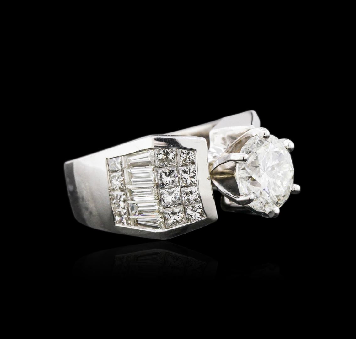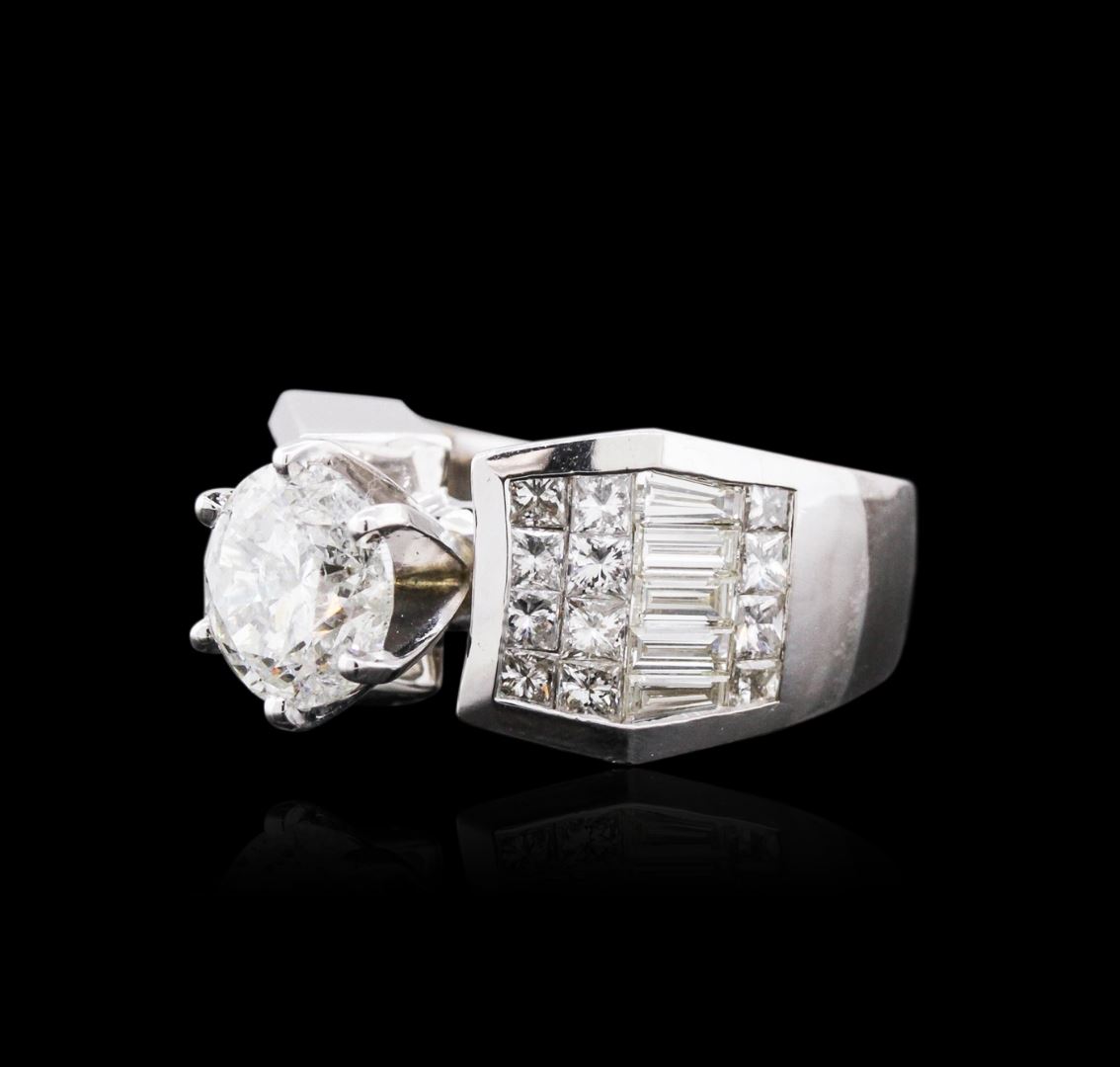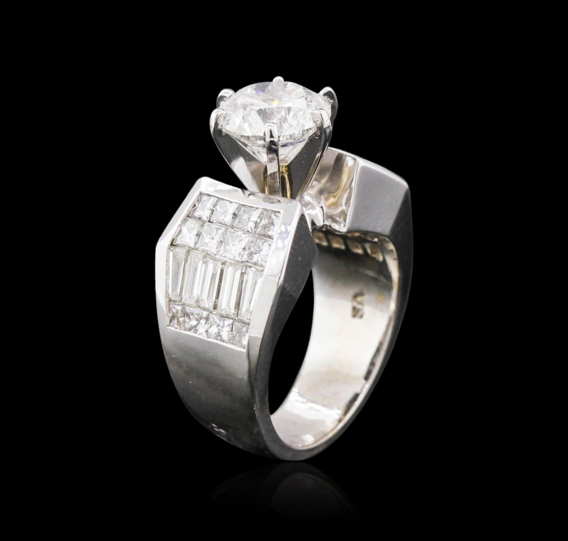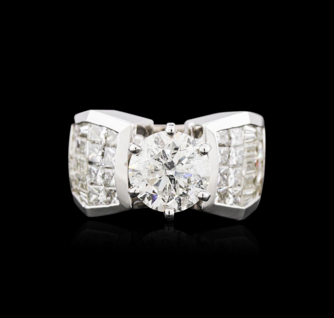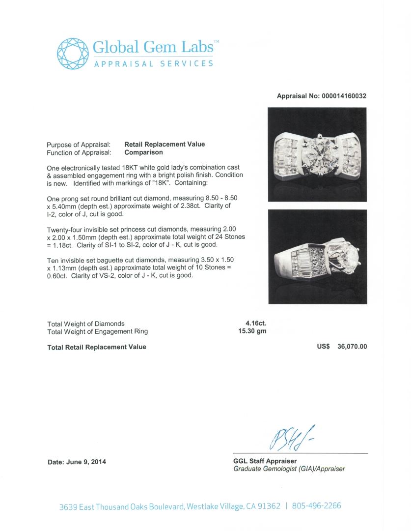 One electronically tested 18KT white gold Ladies combination cast & assembled engagement ring with a bright polish finish. Condition is new. Identified with markings of "18K". Containing: One prong set round brilliant cut diamond, measuring 8.50 - 8.50 x 5.40mm (depth est.) approximate weight of 2.38ct. Clarity: I-2. Color: J, Cut is Good. Twenty-Four invisible set princess cut diamonds, measuring 2.00 x 2.00 x 1.50mm (depth est.) approximate. Total Weight of 24 Stones = 1.18ct. Clarity: SI-1 to SI-2. Color: J - K, Cut is Good. Ten invisible set baguette cut diamonds, measuring 3.50 x 1.50 x 1.13mm (depth est.) approximate. Total Weight of 10 Stones = 0.60ct. Clarity: VS-2. Color: J - K, Cut is Good. Total Weight of Diamonds 4.16ct. Total Weight of Engagement Ring 15.30 grams. GGL Appraised at $36,070.00.