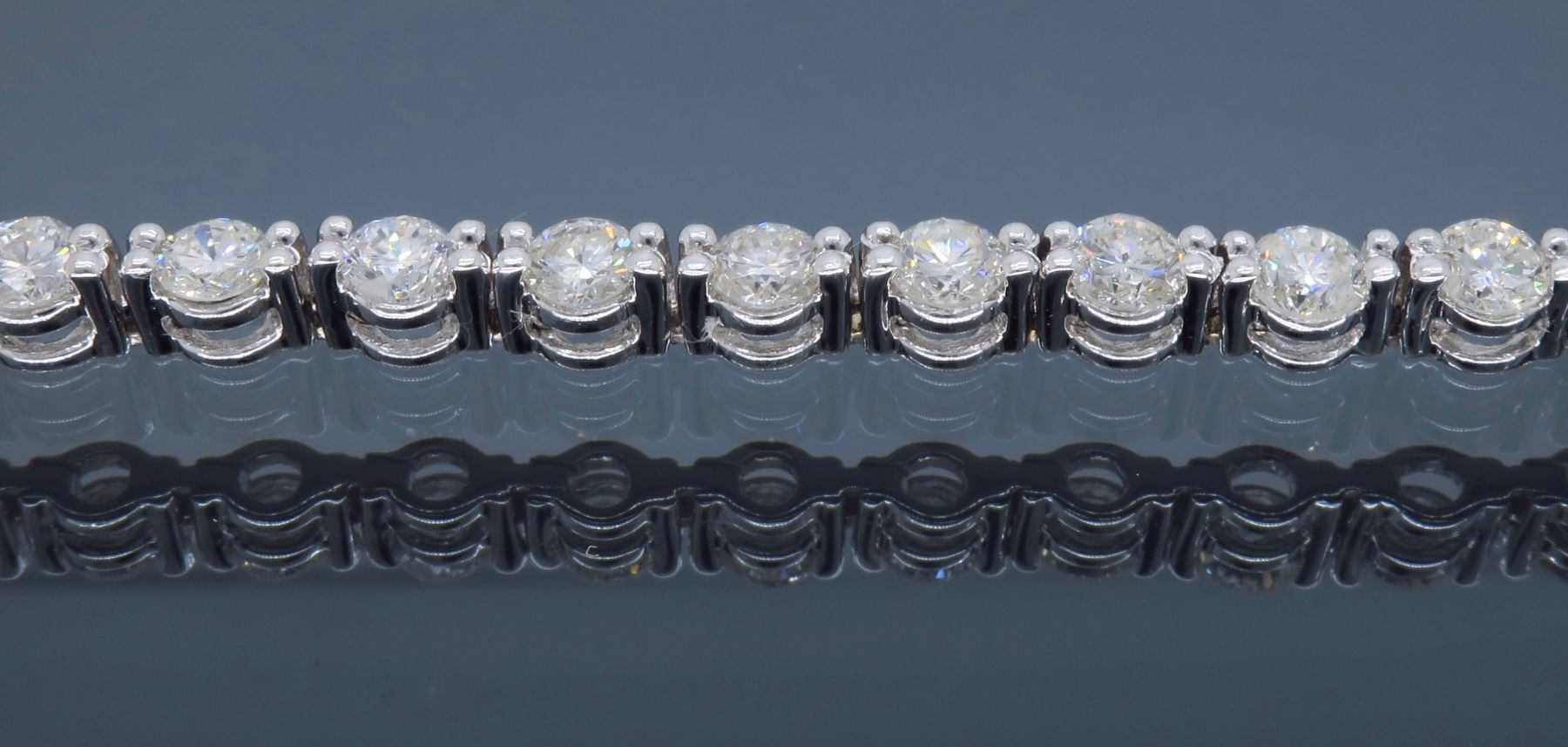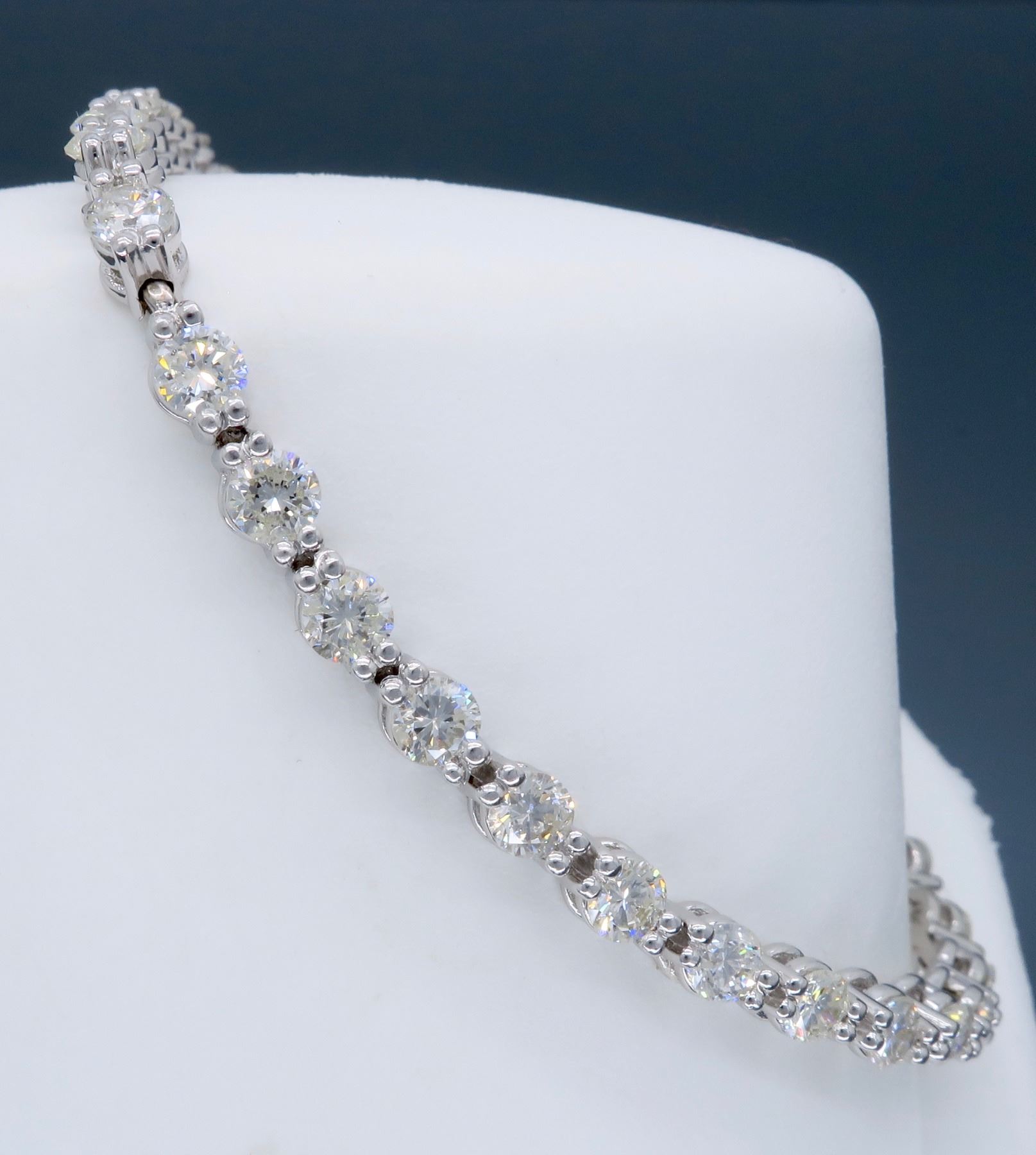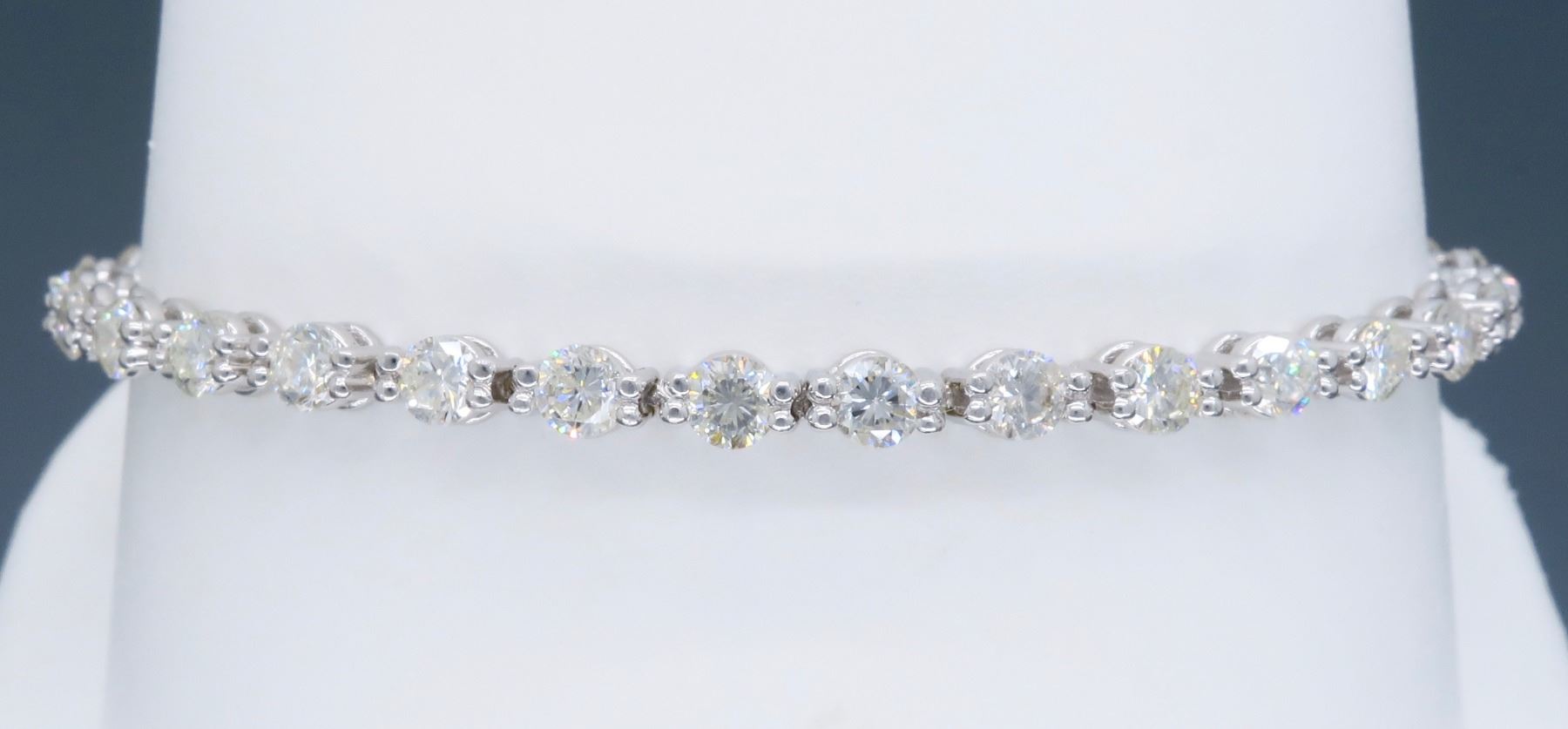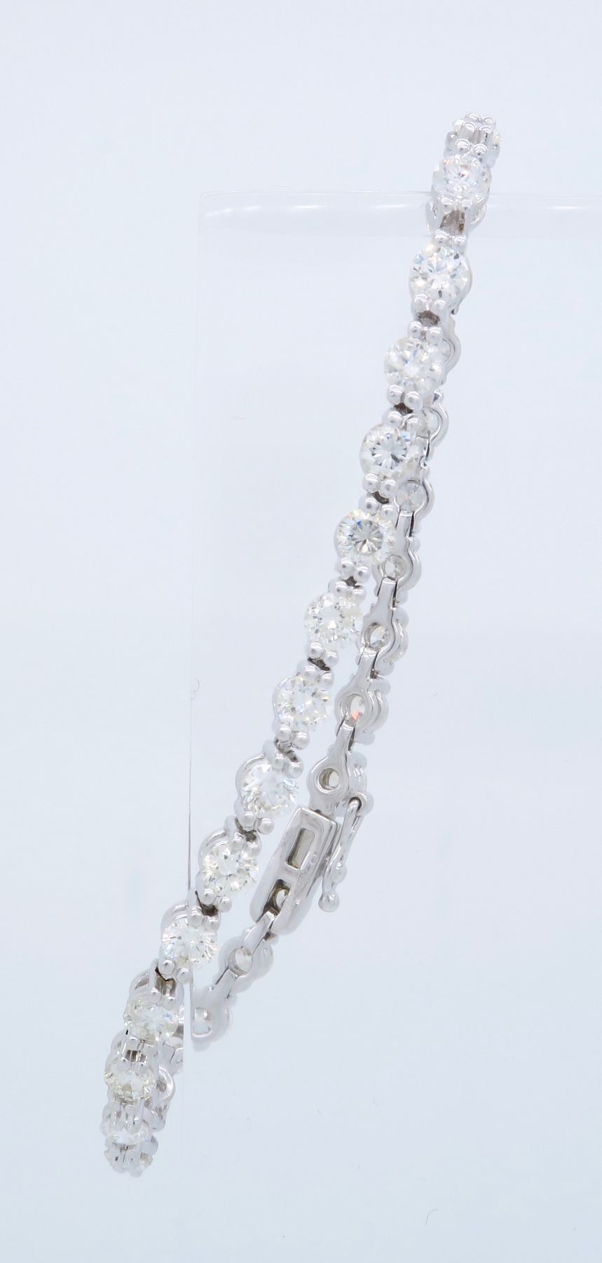 One 18KT White Gold 4.25ctw Diamond Bracelet. Round Diamonds with a total weight of 4.25cts with a color of F-G and clarity of VS-2 to SI-1. Length of this bracelet is 7 inches. Total weight of this bracelet is 11.8 grams.