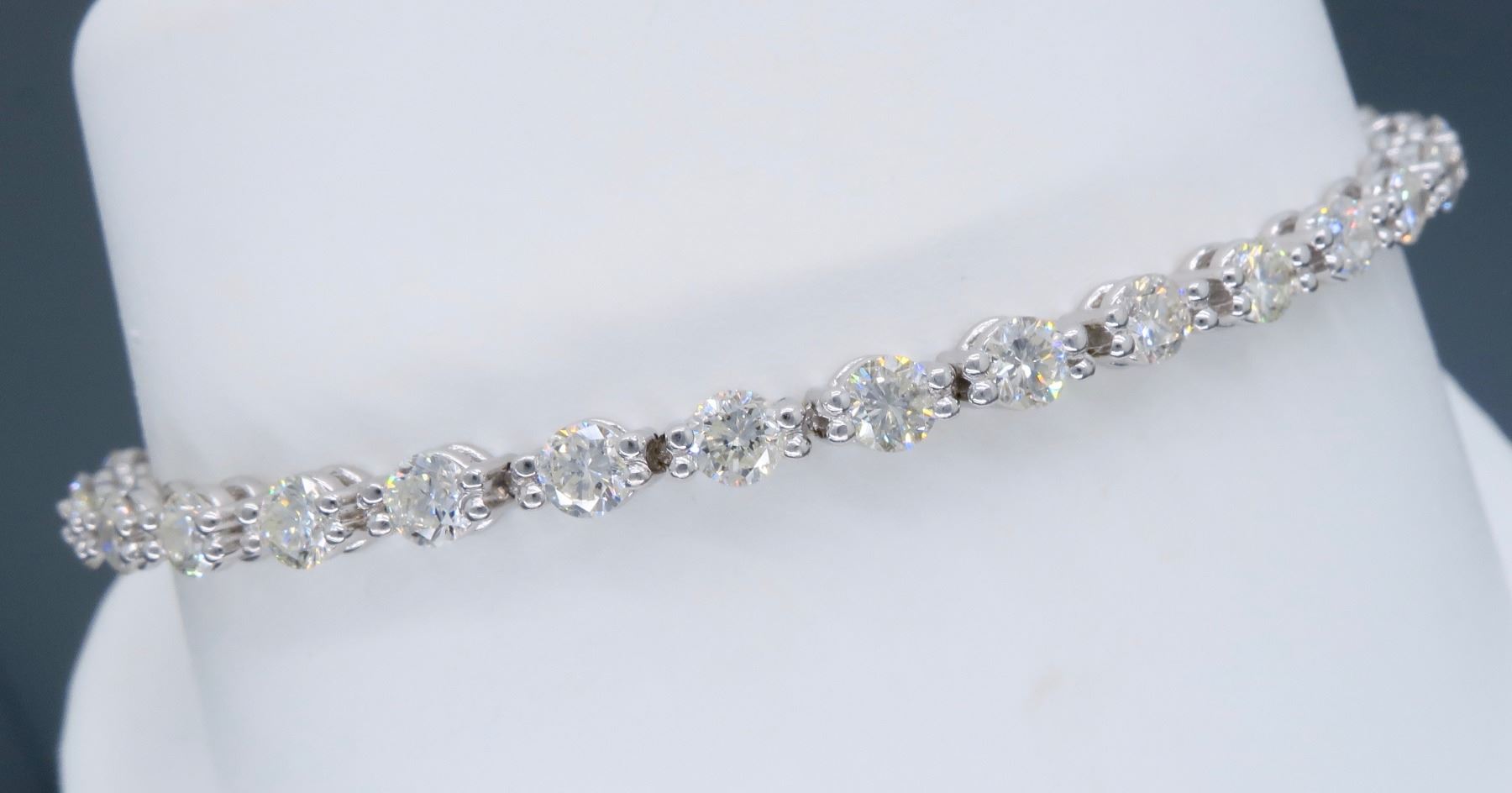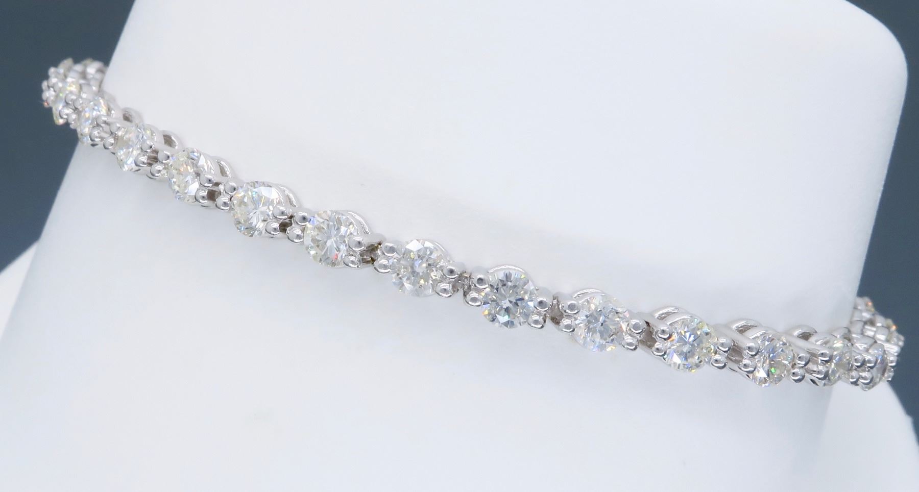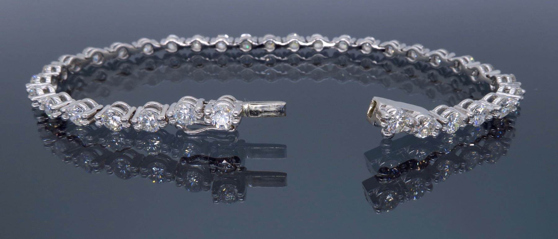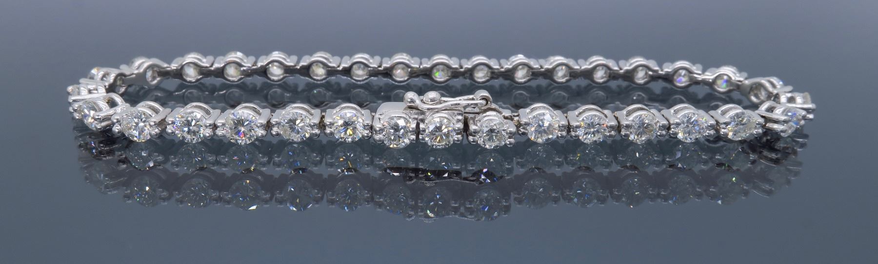 One 18KT White Gold 4.25ctw Diamond Bracelet. Round Diamonds with a total weight of 4.25cts with a color of F-G and clarity of VS-2 to SI-1. Length of this bracelet is 7 inches. Total weight of this bracelet is 11.8 grams.
