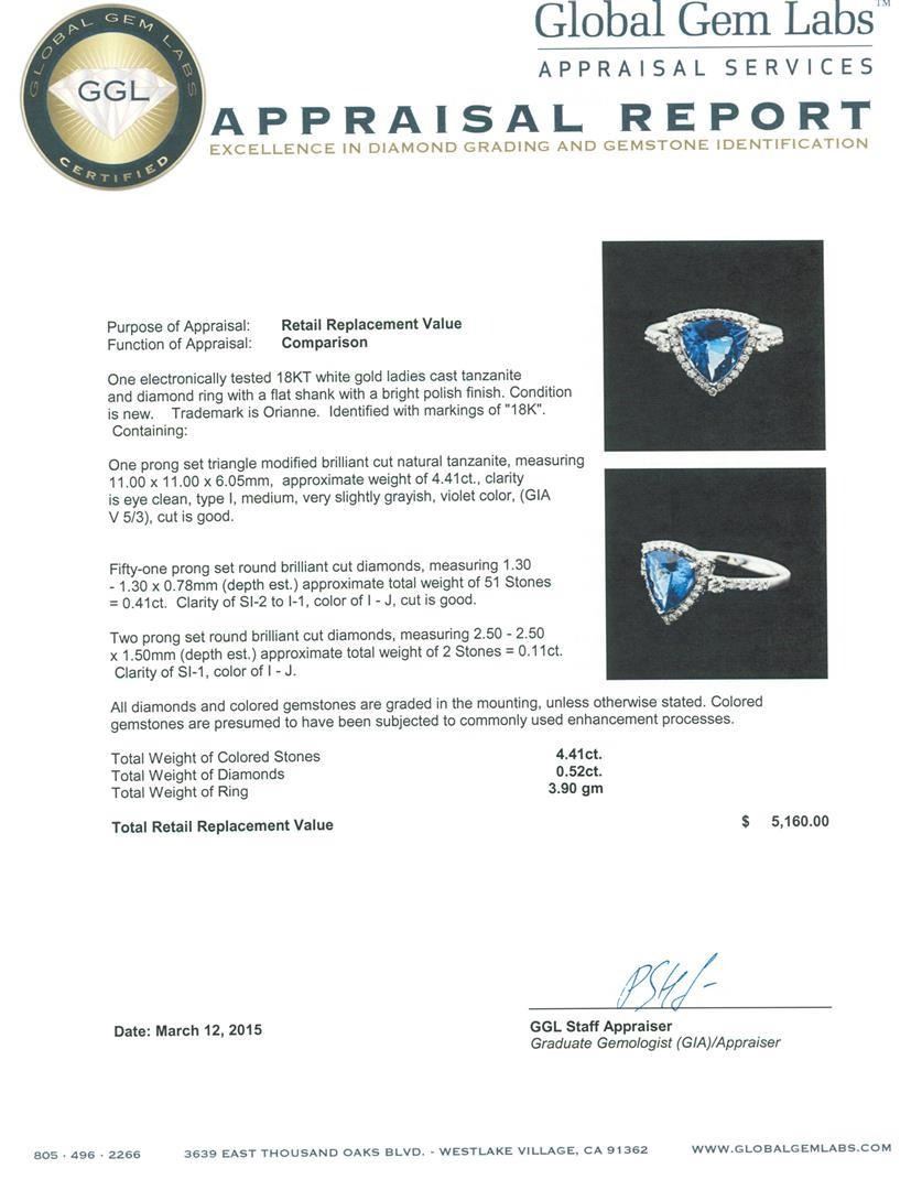 One electronically tested 18KT white gold ladies cast tanzanite and diamond ring with a flat shank with a bright polish finish. Trademark is Orianne. Identified with markings of "18K". Condition is new. Containing: One prong set triangle modified brilliant cut natural tanzanite, measuring 11.00 x 11.00 x 6.05mm, approximate weight of 4.41ct., clarity is eye clean, type I, medium, very slightly grayish, violet color, (GIA V 5/3), cut is good. Fifty-One prong set round brilliant cut diamonds, measuring 1.30 - 1.30 x 0.78mm (depth est.) approximate total weight of 51 Stones = 0.41ct. Clarity: SI-2 to I-1. Color: I - J, Cut is Good. Two prong set round brilliant cut diamonds, measuring 2.50 - 2.50 x 1.50mm (depth est.) approximate total weight of 2 Stones = 0.11ct. Clarity: SI-1. Color: I - J. All diamonds and colored gemstones are graded in the mounting, unless otherwise stated. Colored gemstones are presumed to have been subjected to commonly used enhancement processes. Total Weight of Colored Stones 4.41ct. Total Weight of Diamonds 0.52ct. Total Weight of Ring 3.90 grams. GGL Appraised.