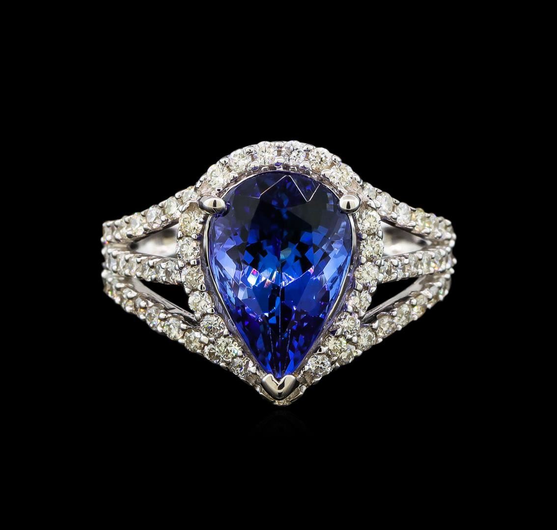 One electronically tested 18KT white gold ladies cast tanzanite and diamond ring with a split shank with a bright polish finish. Trademark is Orianne. Identified with markings of "14K". Condition is new. Containing: One prong set pear modified brilliant cut natural tanzanite, measuring 12.01 x 8.32 x 6.60mm, approximate weight of 4.42ct., clarity is eye clean, type I, medium, moderately strong, violetish blue color, (GIA vB 5/4), cut is good. Sixty-Eight prong set round brilliant cut diamonds, measuring 1.40 - 1.40 x 0.84mm (depth est.) approximate total weight of 68 Stones = 0.53ct. Clarity: SI-2 to I-2. Color: I - J. All diamonds and colored gemstones are graded in the mounting, unless otherwise stated. Colored gemstones are presumed to have been subjected to commonly used enhancement processes. Total Weight of Colored Stones 4.42ct. Total Weight of Diamonds 0.53ct. Total Weight of Ring 5.70 grams. GGL Appraised at $5,950.00.