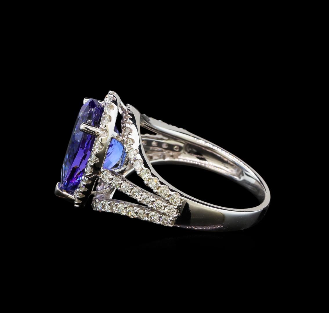 One electronically tested 18KT white gold ladies cast tanzanite and diamond ring with a split shank with a bright polish finish. Trademark is Orianne. Identified with markings of "14K". Condition is new. Containing: One prong set pear modified brilliant cut natural tanzanite, measuring 12.01 x 8.32 x 6.60mm, approximate weight of 4.42ct., clarity is eye clean, type I, medium, moderately strong, violetish blue color, (GIA vB 5/4), cut is good. Sixty-Eight prong set round brilliant cut diamonds, measuring 1.40 - 1.40 x 0.84mm (depth est.) approximate total weight of 68 Stones = 0.53ct. Clarity: SI-2 to I-2. Color: I - J. All diamonds and colored gemstones are graded in the mounting, unless otherwise stated. Colored gemstones are presumed to have been subjected to commonly used enhancement processes. Total Weight of Colored Stones 4.42ct. Total Weight of Diamonds 0.53ct. Total Weight of Ring 5.70 grams. GGL Appraised at $5,950.00.