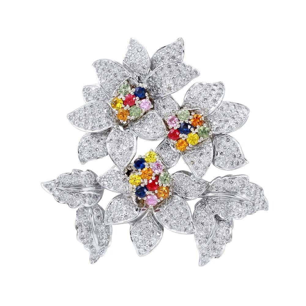 One 18KT White Gold 3.11ctw Multi Color Sapphire and Diamond Brooch. (25) Multi Color Sapphires with a total weight of 3.11cts. (448) Diamonds with a total weight of 4.44cts with a color of I and clarity of SI-2. Total weight of this brooch is 33.77 grams.