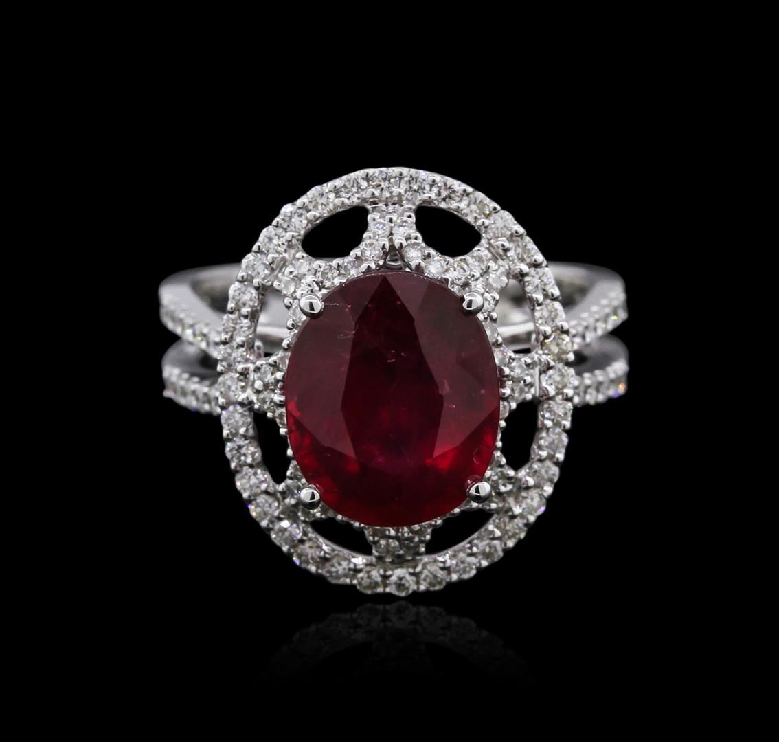 One electronically tested 18KT white gold ladies cast ruby and diamond ring with a bright polish finish. Identified with markings of "18K". Condition is new. Containing: One prong set oval modified brilliant cut natural ruby, measuring 10.80 x 8.70 x 5.66mm, approximate weight of 4.47ct., clarity is heavily included, type II, medium, moderately strong, strongly purplish red color, (GIA stpR 5/4), cut is good. One Hundred prong set round brilliant cut diamonds, measuring 1.00 - 1.00 x 0.60mm (depth est.) approximate. Total Weight of 100 Stones = 0.36ct. Clarity: I-1 to I-2. Color: H - I, Cut is Good. Colored gemstones are presumed to have been subjected to commonly used enhancement processes. All diamonds and colored gemstones are graded in the mounting, unless otherwise stated. Total Weight of Colored Stones 4.47ct. Total Weight of Diamonds 0.36ct. Total Weight of Ring 7.00 grams. GGL Appraised at $3,310.00.