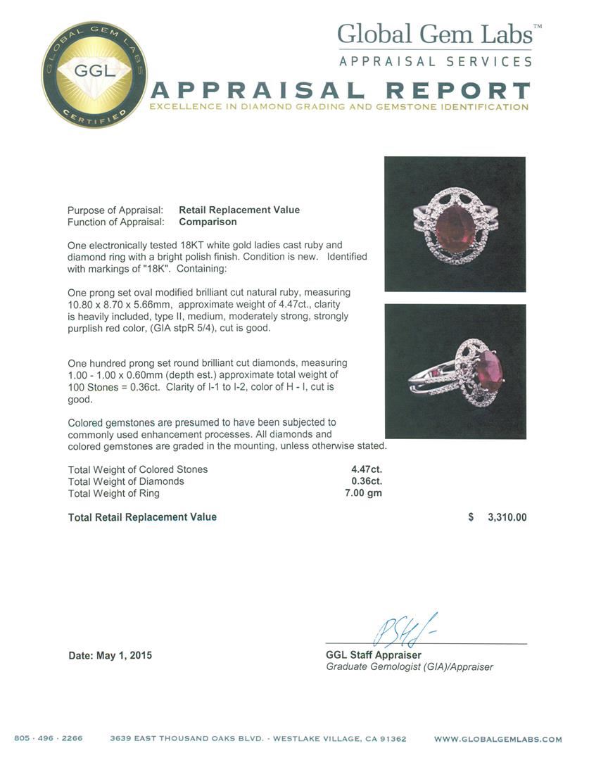 One electronically tested 18KT white gold ladies cast ruby and diamond ring with a bright polish finish. Identified with markings of "18K". Condition is new. Containing: One prong set oval modified brilliant cut natural ruby, measuring 10.80 x 8.70 x 5.66mm, approximate weight of 4.47ct., clarity is heavily included, type II, medium, moderately strong, strongly purplish red color, (GIA stpR 5/4), cut is good. One Hundred prong set round brilliant cut diamonds, measuring 1.00 - 1.00 x 0.60mm (depth est.) approximate. Total Weight of 100 Stones = 0.36ct. Clarity: I-1 to I-2. Color: H - I, Cut is Good. Colored gemstones are presumed to have been subjected to commonly used enhancement processes. All diamonds and colored gemstones are graded in the mounting, unless otherwise stated. Total Weight of Colored Stones 4.47ct. Total Weight of Diamonds 0.36ct. Total Weight of Ring 7.00 grams. GGL Appraised at $3,310.00.