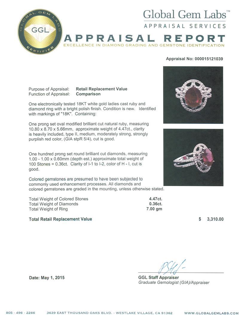 One electronically tested 18KT white gold ladies cast ruby and diamond ring with a bright polish finish. Identified with markings of "18K". Condition is new. Containing: One prong set oval modified brilliant cut natural ruby, measuring 10.80 x 8.70 x 5.66mm, approximate weight of 4.47ct., clarity is heavily included, type II, medium, moderately strong, strongly purplish red color, (GIA stpR 5/4), cut is good. One Hundred prong set round brilliant cut diamonds, measuring 1.00 - 1.00 x 0.60mm (depth est.) approximate. Total Weight of 100 Stones = 0.36ct. Clarity: I-1 to I-2. Color: H - I, Cut is Good. Colored gemstones are presumed to have been subjected to commonly used enhancement processes. All diamonds and colored gemstones are graded in the mounting, unless otherwise stated. Total Weight of Colored Stones 4.47ct. Total Weight of Diamonds 0.36ct. Total Weight of Ring 7.00 grams. GGL Appraised at $3,310.00.