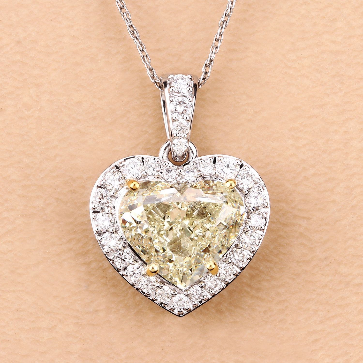 This exquisite heart-shaped pendant is crafted in 18K white gold with a fine finish, designed especially for women who appreciate timeless elegance. The pendant has a gross weight of 3.25 grams and measures approximately 20.07 mm in length, 14.99 mm in width, and 8.13 mm in height. At its center shines a stunning natural yellow heart-shaped diamond, measuring 8.89 x 10.34 mm and weighing 4.51 carats. This vibrant yellow diamond has a VS clarity grade and has not been treated, ensuring its natural brilliance and beauty. The center stone is securely held in a prong setting, allowing maximum light reflection for exceptional sparkle. Surrounding the centerpiece are 27 round brilliant white diamonds, adding a total of 0.45 carats to the design. These accent stones vary in size from 1.30 mm to 1.80 mm, all with GH color and SI clarity, and are also natural and untreated. Together, all stones contribute to a total diamond weight of 4.96 carats across 28 stones. The pendant’s refined craftsmanship and balanced proportions create a striking contrast between the vivid yellow heart diamond and the surrounding white diamonds.