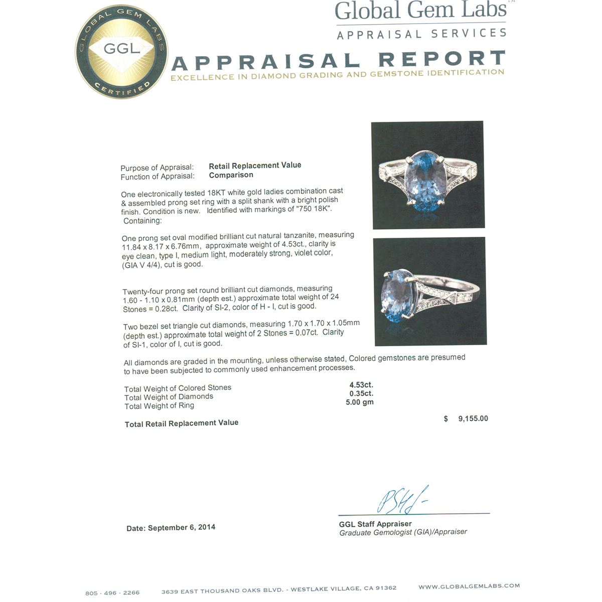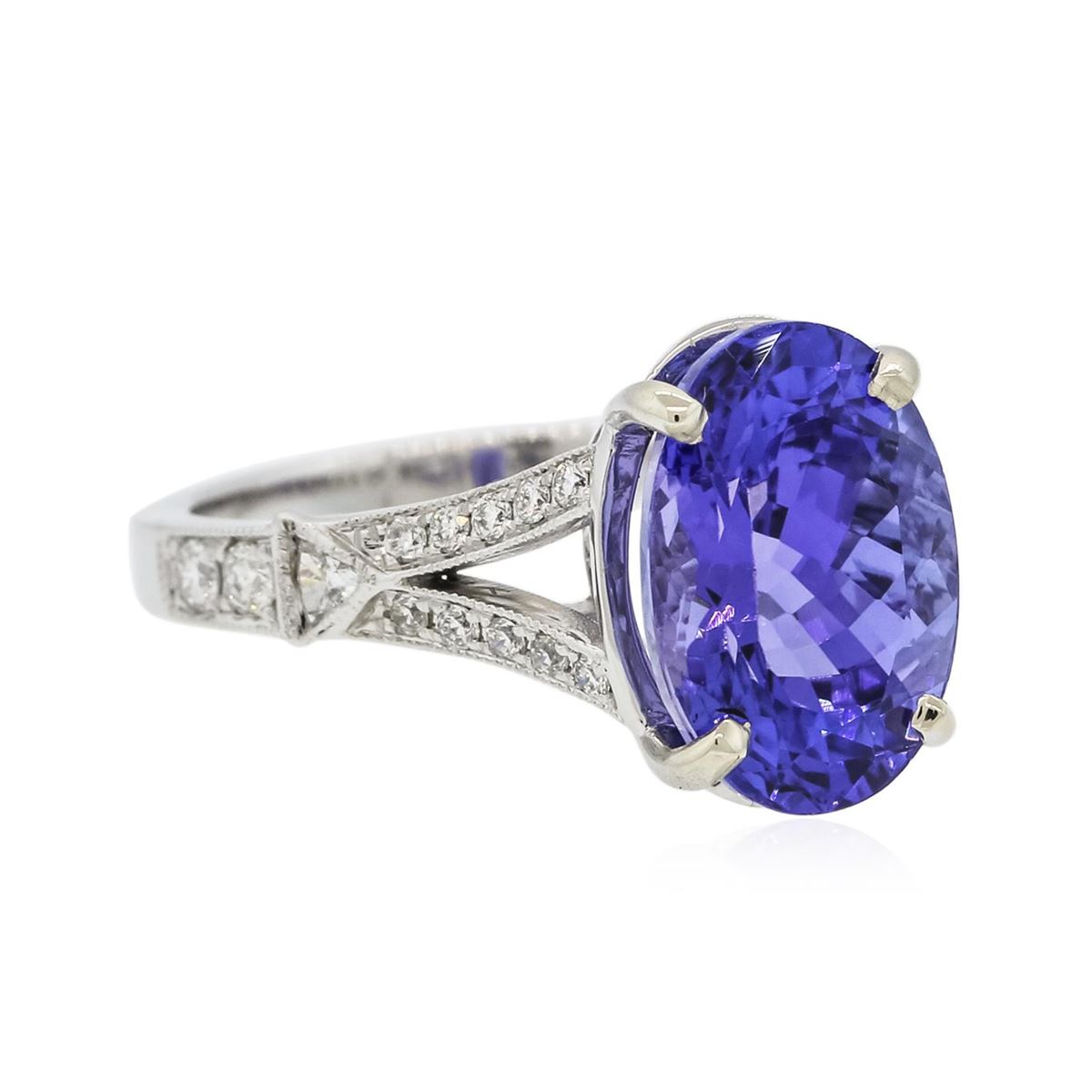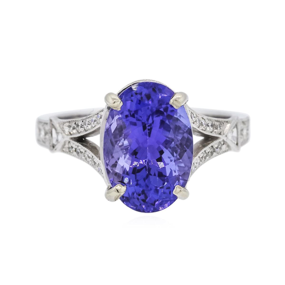 One electronically tested 18KT white gold ladies combination cast & assembled prong set ring with a split shank with a bright polish finish. Identified with markings of "750 18K". Condition is new. Containing: One prong set oval modified brilliant cut natural tanzanite, measuring 11.84 x 8.17 x 6.76mm, approximate weight of 4.53ct., clarity is eye clean, type I, medium light, moderately strong, violet color, (GIA V 4/4), cut is good. Twenty-Four prong set round brilliant cut diamonds, measuring 1.60 - 1.10 x 0.81mm (depth est.) approximate total weight of 24 Stones = 0.28ct. Clarity: SI-2. Color: H - I, Cut is Good. Two bezel set triangle cut diamonds, measuring 1.70 x 1.70 x 1.05mm (depth est.) approximate total weight of 2 Stones = 0.07ct. Clarity: SI-1. Color: I, Cut is Good. All diamonds are graded in the mounting, unless otherwise stated, Colored gemstones are presumed to have been subjected to commonly used enhancement processes. Total Weight of Colored Stones 4.53ct. Total Weight of Diamonds 0.35ct. Total Weight of Ring 5.00 grams. GGL Appraised at $9,155.00.