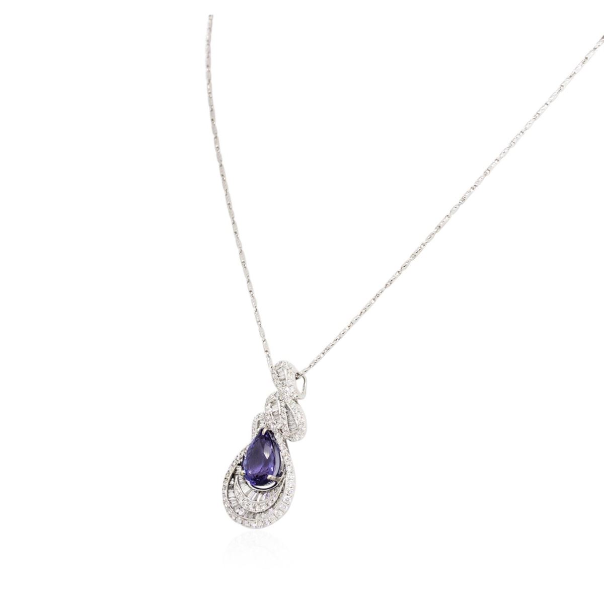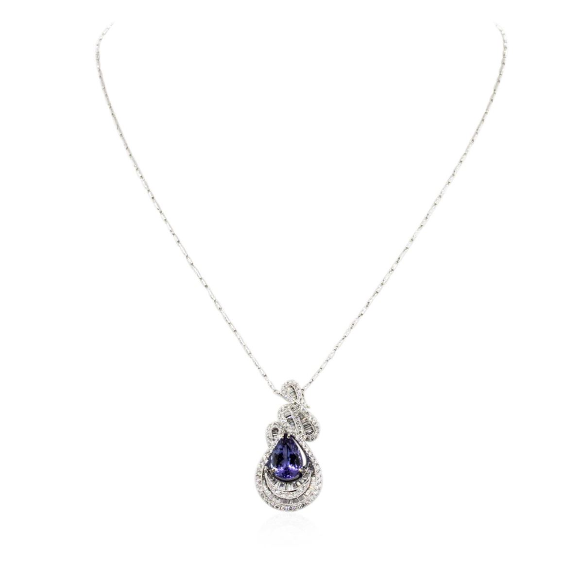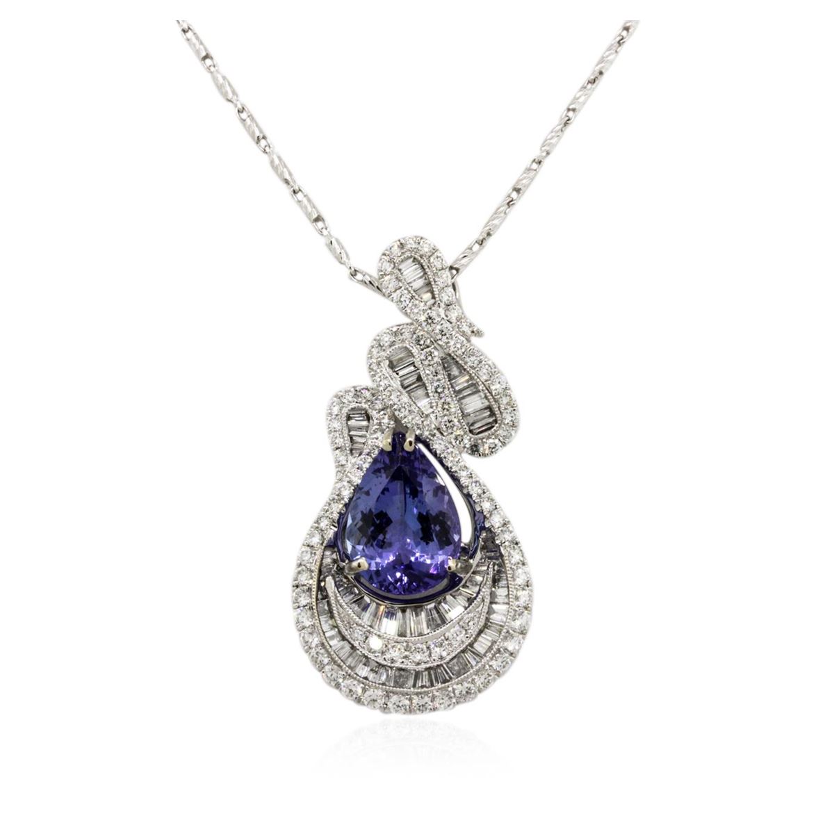 One electronically tested 18KT White Gold ladies cast & assembled tanzanite and diamond pendant with chain. The pendant features a tanzanite set within intertwining diamond ribbons, completed by a diamond set hidden bail. The pendant is supported by an eighteen inch length 14KT White Gold designer style chain, terminating in a lobster claw clasp. Bright polish finish with milgrain detailing. Identified with markings of "18K 750". Condition is new, good workmanship. Containing: One prong set pear brilliant cut natural tanzanite, measuring 12.50 x 8.80 x 5.70mm, 8% bulge factor, approximate weight of 4.54ct., clarity is eye clean, type I, medium dark, very slightly grayish, bluish violet color, (GIA bV 6/3), cut is good. Transmitting light with no distortion, transparent. Graded in the setting. Tanzanite is a very rare gemstone that is only found in the country of Tanzania. Originally discovered in 1967. Tiffany & Company, named the stone Tanzanite. It is found in the Usumburu Mountains that border the Umba Valley of northern Tanzania. Tanzanite occurs in gray, brown, violet, blue, reddish-purple, & green. The gem is interesting because of its exceptional pleochroism. Rotated in different directions a tanzanite will exhibit multiple changes of color. Tanzanite has a low tolerance to ultrasonic cleaning, and should not be cleaned using this method. One Hundred Forty-Seven prong and channel set round brilliant & baguette cut diamonds approximate total weight of 147 Stones = 2.37ct. Graded in the setting. Clarity: VS-1 to SI-1. Color: G - I. Total Weight of Colored Stones 4.54ct. Total Weight of Diamonds 2.37ct. Total Weight of Pendant With Chain 10.38 grams. AIG Appraised at $21,990.00.