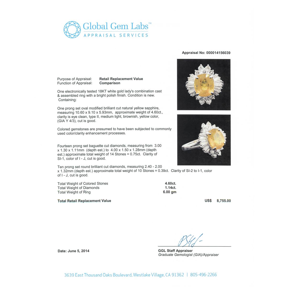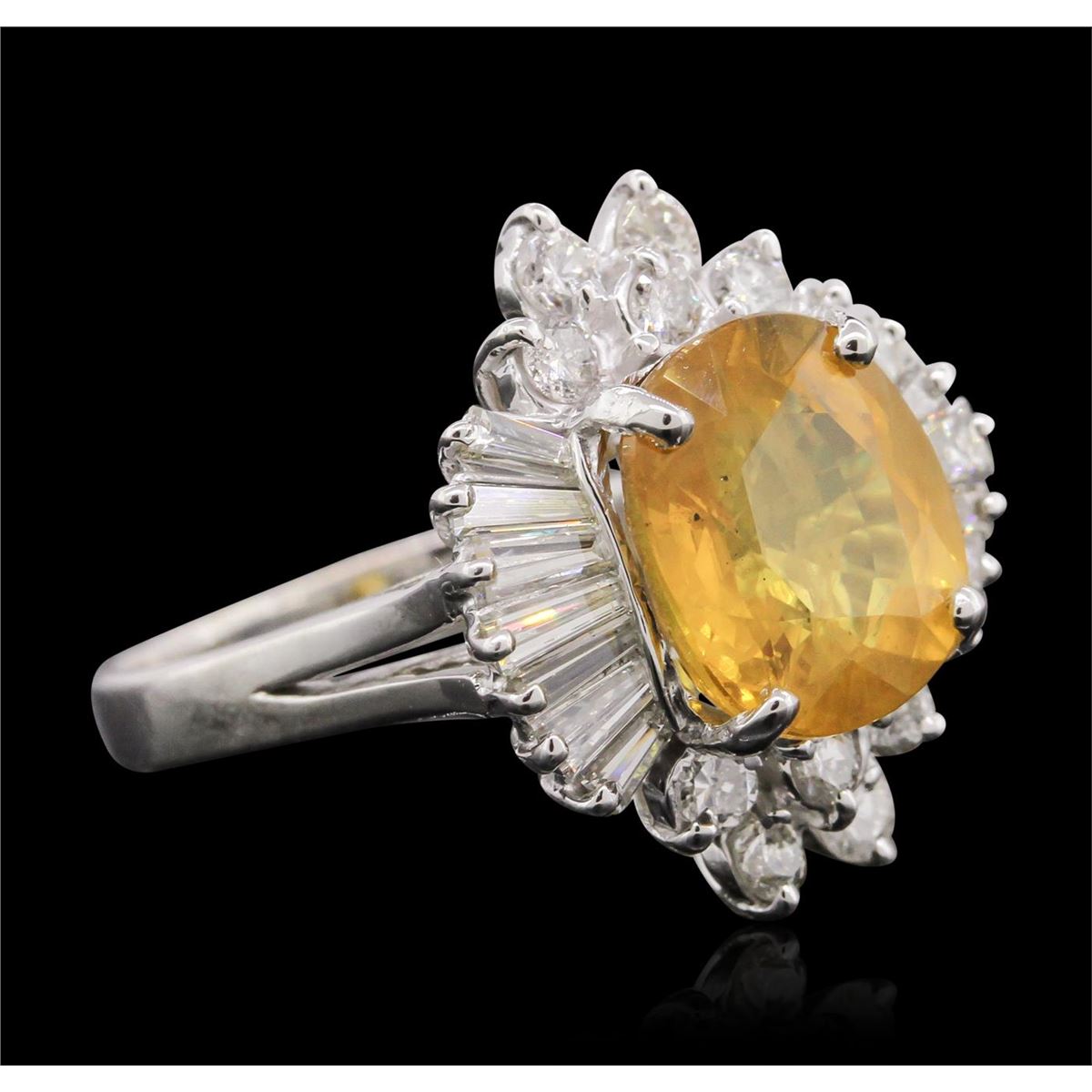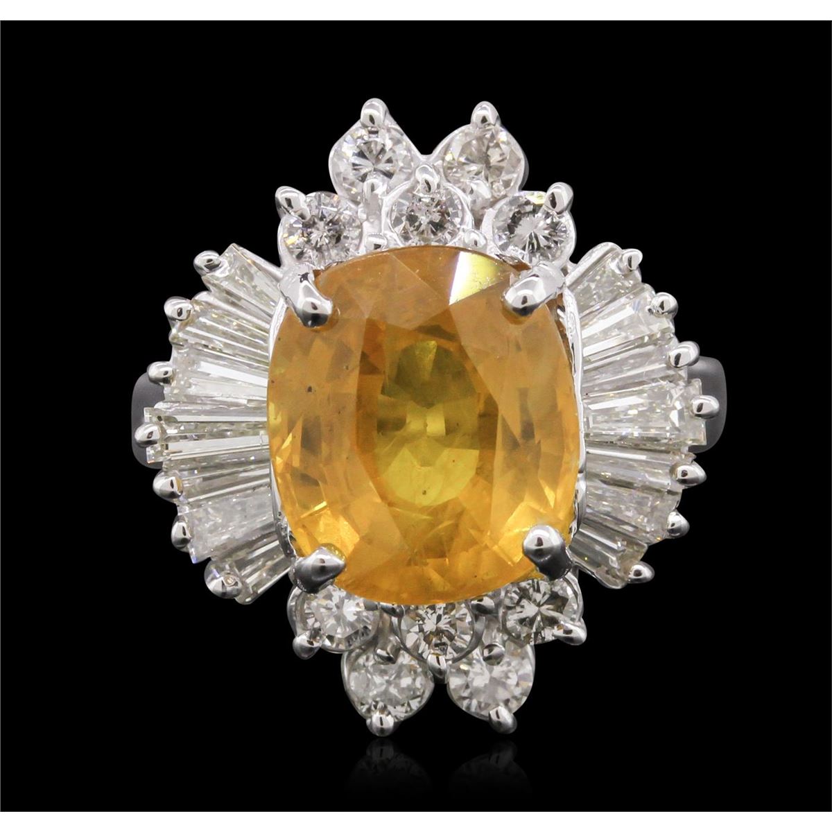 One electronically tested 18KT white gold Ladies combination cast & assembled ring with a bright polish finish. Condition is new. Containing: One prong set oval modified brilliant cut natural yellow sapphire, measuring 10.60 x 9.10 x 5.93mm, approximate weight of 4.60ct., clarity is eye clean, type II, medium light, brownish, yellow color, (GIA Y 4/3), cut is good. Colored gemstones are presumed to have been subjected to commonly used color/clarity enhancement processes. Fourteen prong set baguette cut diamonds, measuring from 3.00 x 1.30 x 1.11mm (depth est.) to 4.00 x 1.50 x 1.28mm (depth est.) approximate. Total Weight of 14 Stones = 0.75ct. Clarity: SI-1. Color: I - J, Cut is Good. Ten prong set round brilliant cut diamonds, measuring 2.40 - 2.00 x 1.32mm (depth est.) approximate. Total Weight of 10 Stones = 0.39ct. Clarity: SI-2 to I-1. Color: I - J, Cut is Good. Total Weight of Colored Stones 4.60ct. Total Weight of Diamonds 1.14ct. Total Weight of Ring 6.00 grams. GGL Appraised at $8,755.00.