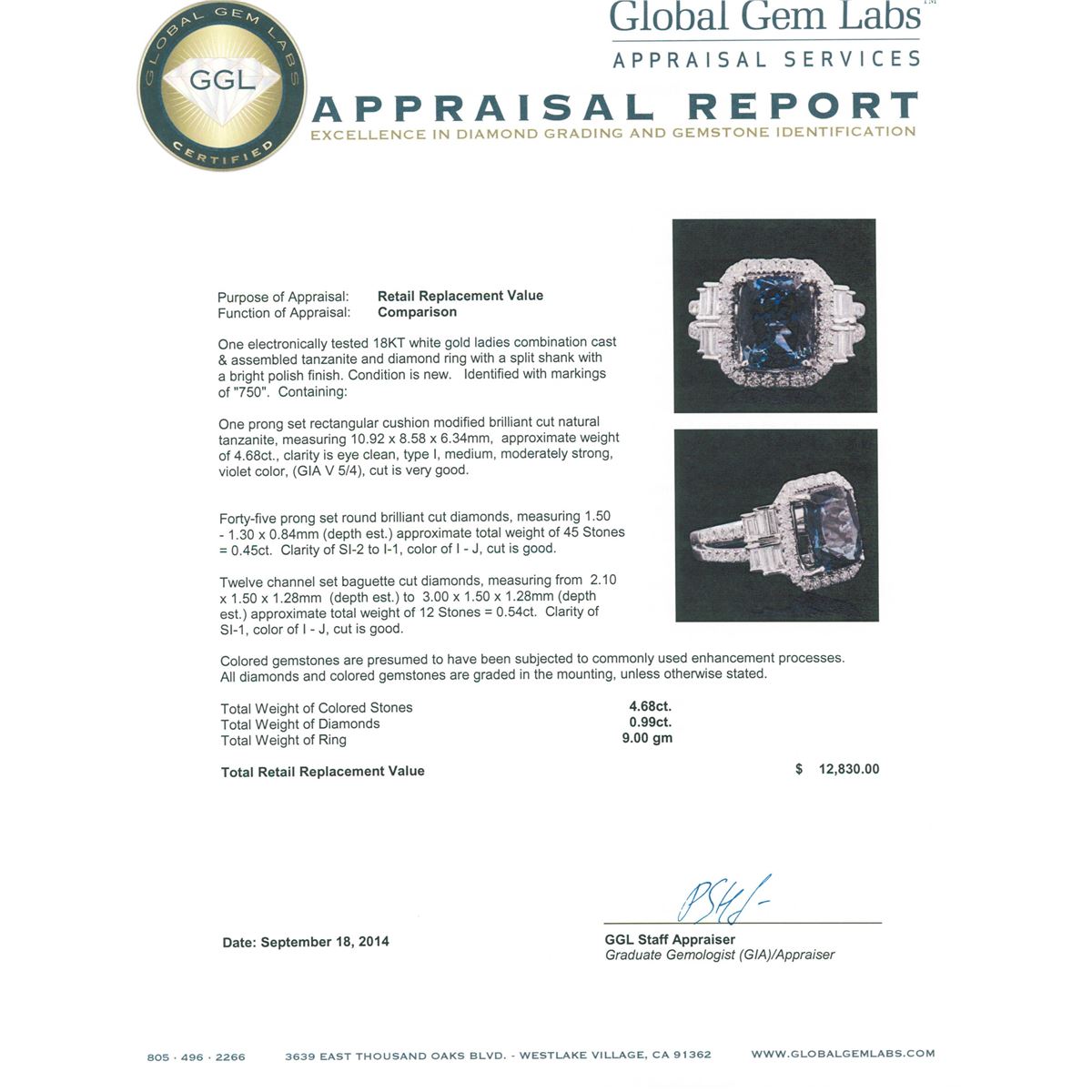 One electronically tested 18KT white gold ladies combination cast & assembled tanzanite and diamond ring with a split shank with a bright polish finish. Identified with markings of "750". Condition is new. Containing: One prong set rectangular cushion modified brilliant cut natural tanzanite, measuring 10.92 x 8.58 x 6.34mm, approximate weight of 4.68ct., clarity is eye clean, type I, medium, moderately strong, violet color, (GIA V 5/4), cut is very good. Forty-Five prong set round brilliant cut diamonds, measuring 1.50 - 1.30 x 0.84mm (depth est.) approximate total weight of 45 Stones = 0.45ct. Clarity: SI-2 to I-1. Color: I - J, Cut is Good. Twelve channel set baguette cut diamonds, measuring from 2.10 x 1.50 x 1.28mm (depth est.) to 3.00 x 1.50 x 1.28mm (depth est.) approximate total weight of 12 Stones = 0.54ct. Clarity: SI-1. Color: I - J, Cut is Good. Colored gemstones are presumed to have been subjected to commonly used enhancement processes. All diamonds and colored gemstones are graded in the mounting, unless otherwise stated. Total Weight of Colored Stones 4.68ct. Total Weight of Diamonds 0.99ct. Total Weight of Ring 9.00 grams. GGL Appraised at $12,830.00.