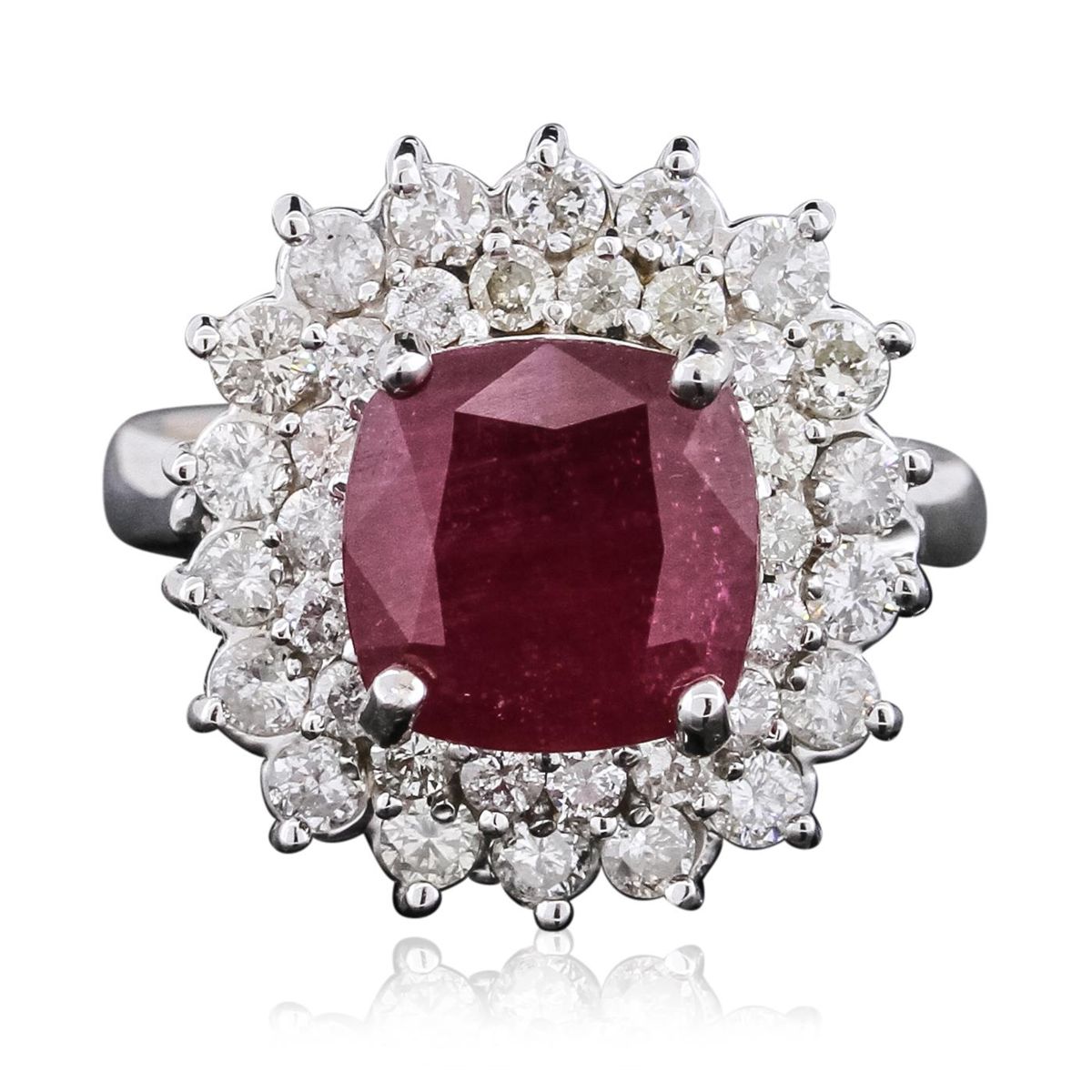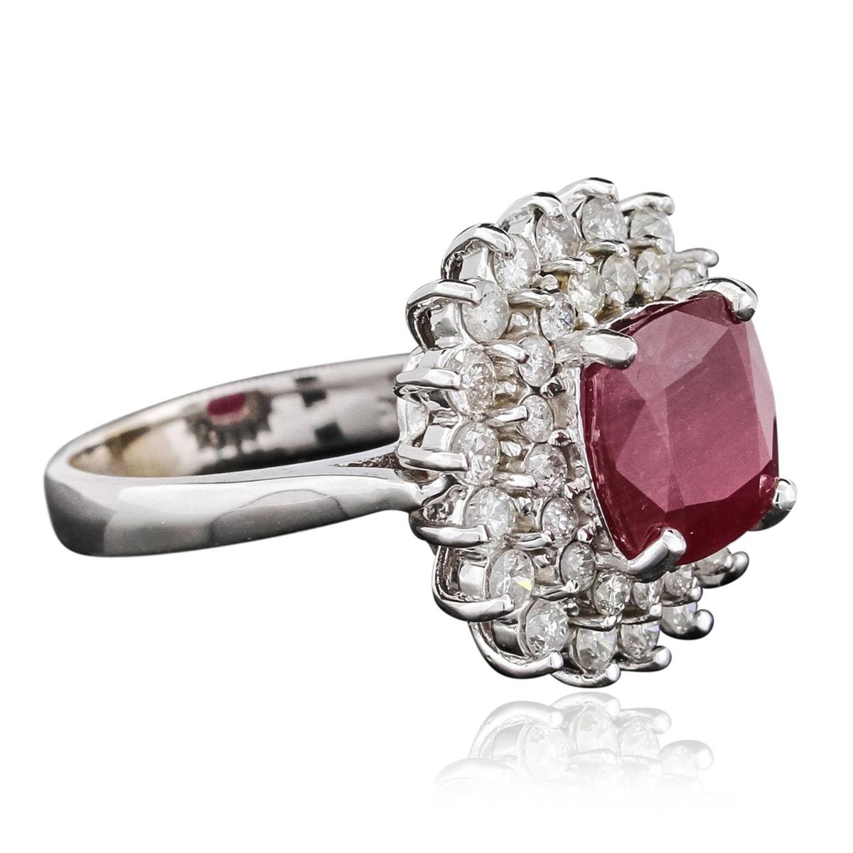 One electronically tested 18KT white gold ladies cast ruby and diamond ring with a bright polish finish. The featured ruby is set within two tiered diamond bezels, completed by a three millimeter wide band. Identified with markings of "18K". Condition is new, good workmanship. Containing: One prong set square cushion brilliant cut natural ruby, measuring 9.00 x 8.98 x 5.70mm, 8% bulge factor, approximate weight of 4.68ct., clarity is heavily included, type II, medium dark, very slightly brownish, red color, (GIA R 6/3), cut is good. Transmitting light somewhat diffusely, transparent to translucent. Naturally occurring internal & external characteristics are present. Indications of laboratory high temperature heat treatment, with glass & flux additives. Graded in the setting. Ruby has a low tolerance to rhodium plating, repolishing the surface, & ultrasonic cleaning. Eighteen prong set round brilliant cut diamonds, measuring 2.40 - 2.30 x 1.41mm (depth est.) approximate total weight of 18 Stones = 0.95ct. Graded in the setting. Clarity: I-1 to I-2 . Color: H - J. Eighteen prong set round brilliant cut diamonds, measuring 1.80 - 1.70 x 1.05mm (depth est.) approximate total weight of 18 Stones = 0.45ct. Graded in the setting. Clarity: I-1 to I-2. Color: H - J. Total Weight of Colored Stones 4.68ct. Total Weight of Diamonds 1.40ct. Total Weight of Ring 7.98 grams. AIG Appraised at $5,635.00.