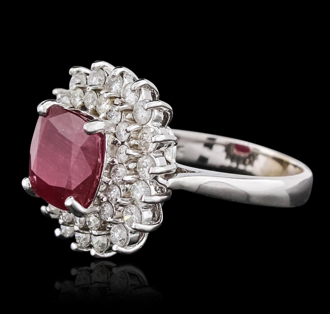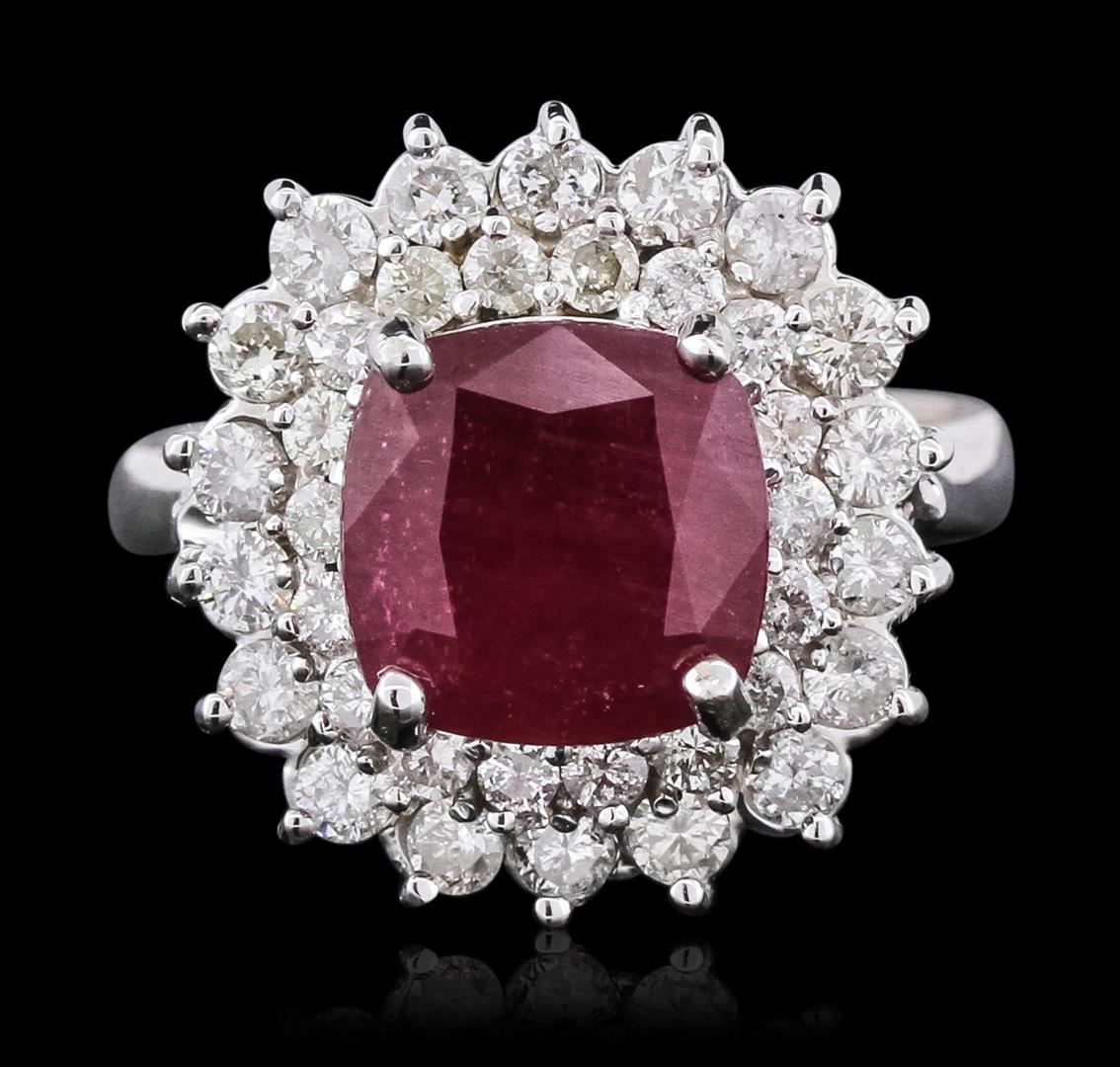 One electronically tested 18KT white gold ladies cast ruby and diamond ring with a bright polish finish. The featured ruby is set within two tiered diamond bezels, completed by a three millimeter wide band. Identified with markings of "18K". Condition is new, good workmanship. Containing: One prong set square cushion brilliant cut natural ruby, measuring 9.00 x 8.98 x 5.70mm, 8% bulge factor, approximate weight of 4.68ct., clarity is heavily included, type II, medium dark, very slightly brownish, red color, (GIA R 6/3), cut is good. Transmitting light somewhat diffusely, transparent to translucent. Naturally occurring internal & external characteristics are present. Indications of laboratory high temperature heat treatment, with glass & flux additives. Graded in the setting. Ruby has a low tolerance to rhodium plating, repolishing the surface, & ultrasonic cleaning. Eighteen prong set round brilliant cut diamonds, measuring 2.40 - 2.30 x 1.41mm (depth est.) approximate total weight of 18 Stones = 0.95ct. Graded in the setting. Clarity: I-1 to I-2 . Color: H - J. Eighteen prong set round brilliant cut diamonds, measuring 1.80 - 1.70 x 1.05mm (depth est.) approximate total weight of 18 Stones = 0.45ct. Graded in the setting. Clarity: I-1 to I-2. Color: H - J. Total Weight of Colored Stones 4.68ct. Total Weight of Diamonds 1.40ct. Total Weight of Ring 7.98 grams. AIG Appraised at $5,635.00.
