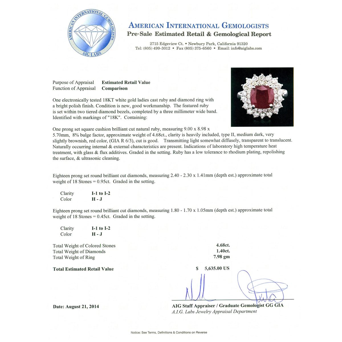 One electronically tested 18KT white gold ladies cast ruby and diamond ring with a bright polish finish. The featured ruby is set within two tiered diamond bezels, completed by a three millimeter wide band. Identified with markings of "18K". Condition is new, good workmanship. Containing: One prong set square cushion brilliant cut natural ruby, measuring 9.00 x 8.98 x 5.70mm, 8% bulge factor, approximate weight of 4.68ct., clarity is heavily included, type II, medium dark, very slightly brownish, red color, (GIA R 6/3), cut is good. Transmitting light somewhat diffusely, transparent to translucent. Naturally occurring internal & external characteristics are present. Indications of laboratory high temperature heat treatment, with glass & flux additives. Graded in the setting. Ruby has a low tolerance to rhodium plating, repolishing the surface, & ultrasonic cleaning. Eighteen prong set round brilliant cut diamonds, measuring 2.40 - 2.30 x 1.41mm (depth est.) approximate total weight of 18 Stones = 0.95ct. Graded in the setting. Clarity: I-1 to I-2 . Color: H - J. Eighteen prong set round brilliant cut diamonds, measuring 1.80 - 1.70 x 1.05mm (depth est.) approximate total weight of 18 Stones = 0.45ct. Graded in the setting. Clarity: I-1 to I-2. Color: H - J. Total Weight of Colored Stones 4.68ct. Total Weight of Diamonds 1.40ct. Total Weight of Ring 7.98 grams. AIG Appraised at $5,635.00.