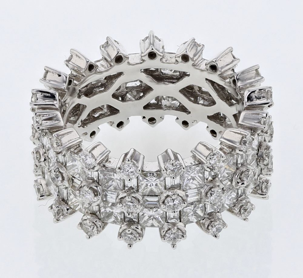 One 18KT White Gold 4.79ctw Diamond Ring. (34) Princess cut Diamonds with a total weight of 2.86cts with a color of G-H and clarity of SI-2. (51) Round Diamonds with a total weight of 0.99cts with a color of I and clarity of I-1. (51) Baguette Diamonds with a total weight of 0.94cts with a color of G-H and clarity of SI-2. Total weight of this ring is 6.59 grams.