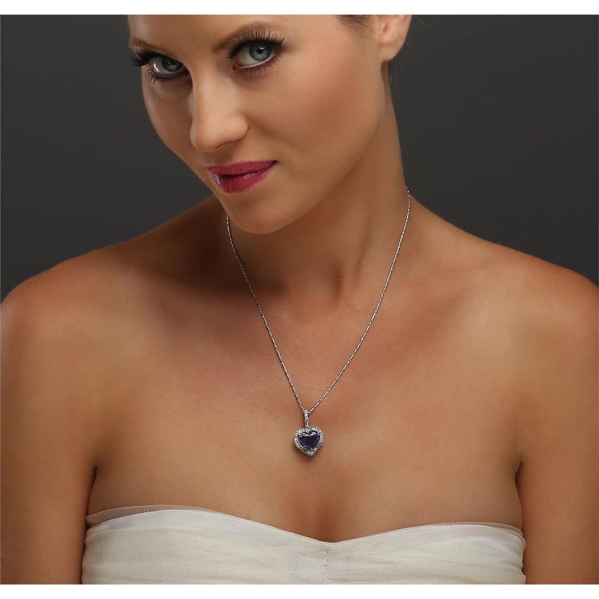 One electronically tested 18KT White Gold ladies cast & assembled tanzanite and diamond pendant with chain. The pendant features a tanzanite set within a diamond bezel, completed by a diamond set bail. The pendant is supported by an eighteen inch length 14KT White Gold designer style chain, terminating in a lobster claw clasp. Bright polish finish. Identified with markings of "18K 750". Condition is new, good workmanship. Containing: One prong set heart brilliant cut natural tanzanite, measuring 10.50 x 12.00 x 5.40mm, 8% bulge factor, approximate weight of 4.80ct., clarity is eye clean, type I, medium dark, moderately strong, violetish blue color, (GIA vB 6/4), cut is good. Transmitting light with no distortion, transparent. Graded in the setting. Tanzanite is a very rare gemstone that is only found in the country of Tanzania. Originally discovered in 1967. Tiffany & Company, named the stone Tanzanite. It is found in the Usumburu Mountains that border the Umba Valley of northern Tanzania. Tanzanite occurs in gray, brown, violet, blue, reddish-purple, & green. The gem is interesting because of its exceptional pleochroism. Rotated in different directions a tanzanite will exhibit multiple changes of color. Tanzanite has a low tolerance to ultrasonic cleaning, and should not be cleaned using this method. Fifty-One prong set baguette cut (tapered) diamonds, measuring from 1.80 x 1.00 x 0.70mm (depth est.) to 2.40 x 1.20 x 0.84mm (depth est.) approximate total weight of 51 Stones = 0.83ct. Graded in the setting. Clarity: VVS-1 to VS-1. Color: G - I Four bead set round brilliant cut diamonds, measuring 1.60 - 1.50 x 0.93mm (depth est.) approximate total weight of 4 Stones = 0.10ct. Graded in the setting. Clarity: VVS-2 to VS-1. Color: G - I. Total Weight of Colored Stones 4.80ct. Total Weight of Diamonds 0.93ct. Total Weight of Pendant With Chain 9.27 grams. AIG Appraised at $17,645.00.