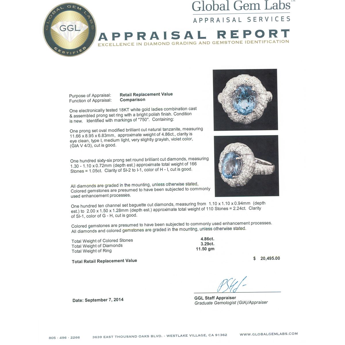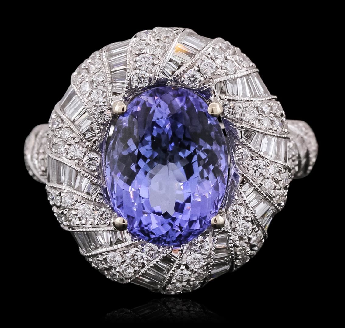 One electronically tested 18KT white gold ladies combination cast & assembled prong set ring with a bright polish finish. Identified with markings of "750". Condition is new. Containing: One prong set oval modified brilliant cut natural tanzanite, measuring 11.66 x 8.95 x 6.83mm, approximate weight of 4.86ct., clarity is eye clean, type I, medium light, very slightly grayish, violet color, (GIA V 4/3), cut is good. One Hundred Sixty-Six prong set round brilliant cut diamonds, measuring 1.30 - 1.10 x 0.72mm (depth est.) approximate total weight of 166 Stones = 1.05ct. Clarity: SI-2 to I-1. Color: H - I, Cut is Good. All diamonds are graded in the mounting, unless otherwise stated, Colored gemstones are presumed to have been subjected to commonly used enhancement processes. One Hundred Ten channel set baguette cut diamonds, measuring from 1.10 x 1.10 x 0.94mm (depth est.) to 2.00 x 1.50 x 1.28mm (depth est.) approximate total weight of 110 Stones = 2.24ct. Clarity: SI-1. Color: G - H, Cut is Good. Colored gemstones are presumed to have been subjected to commonly used enhancement processes. All diamonds and colored gemstones are graded in the mounting, unless otherwise stated. Total Weight of Colored Stones 4.86ct. Total Weight of Diamonds 3.29ct. Total Weight of Ring 11.50 grams. GGL Appraised at $20,495.00.